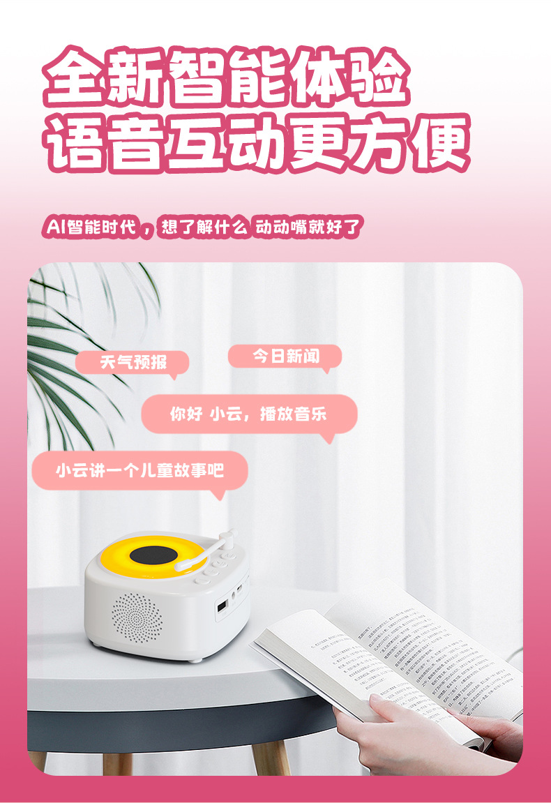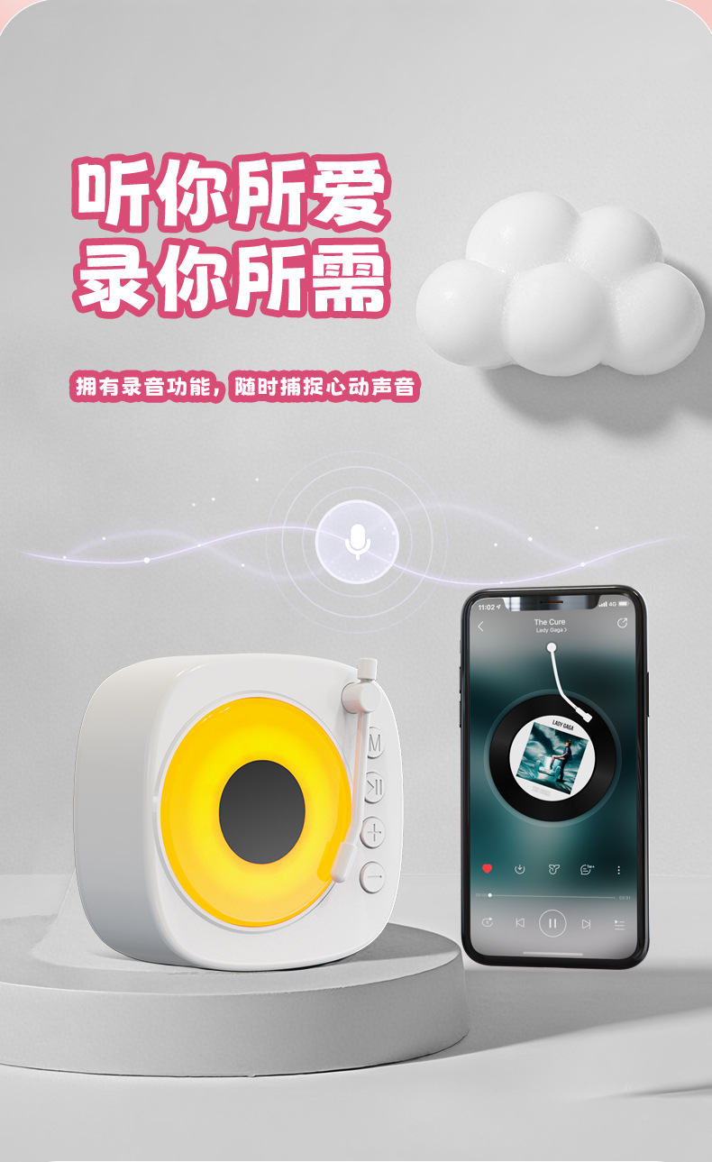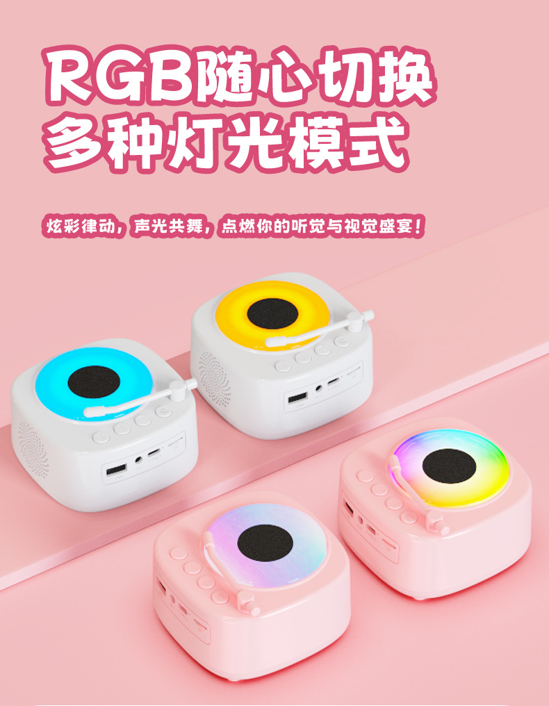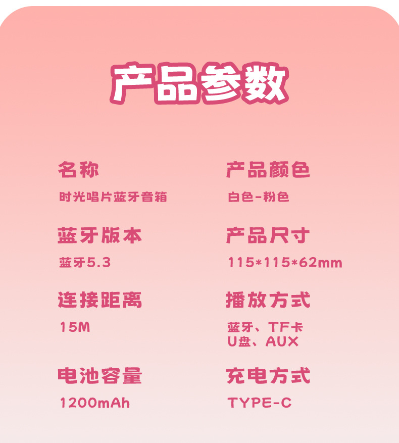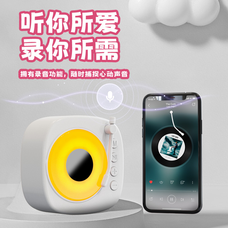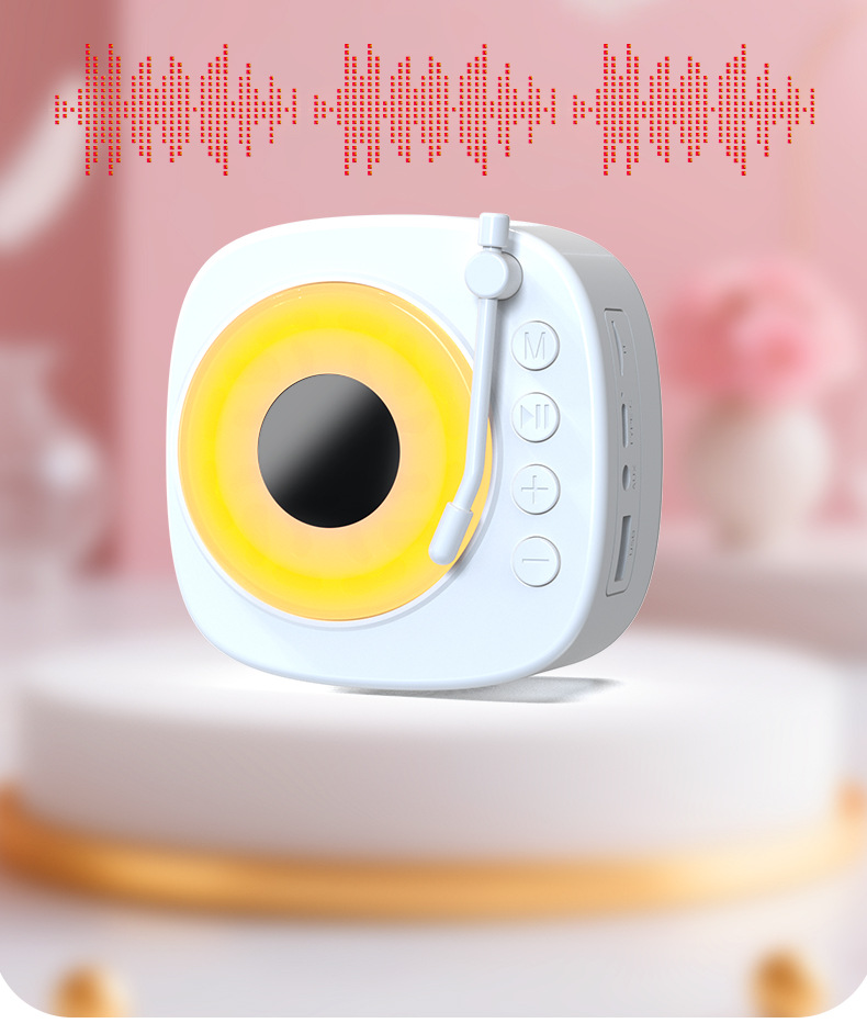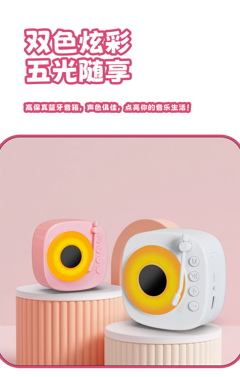 【颜色】白色、粉色 【扬声器功率】5W 【蓝牙版本】5.3 【材质】ABS 【播放模式】蓝牙、TF卡、U盘、AUX 【电池容量】1200mAh 【产品尺寸】115*115*62mm 唱片造型,炫彩氛围灯,多种灯光模式 智能语音AI,你好小云唤醒 采用大口径音圈保障足够的驱动力,让声音更通透 一键收音,内置FM天线,自动开启搜台模式