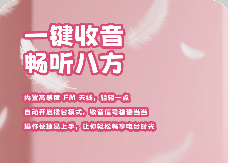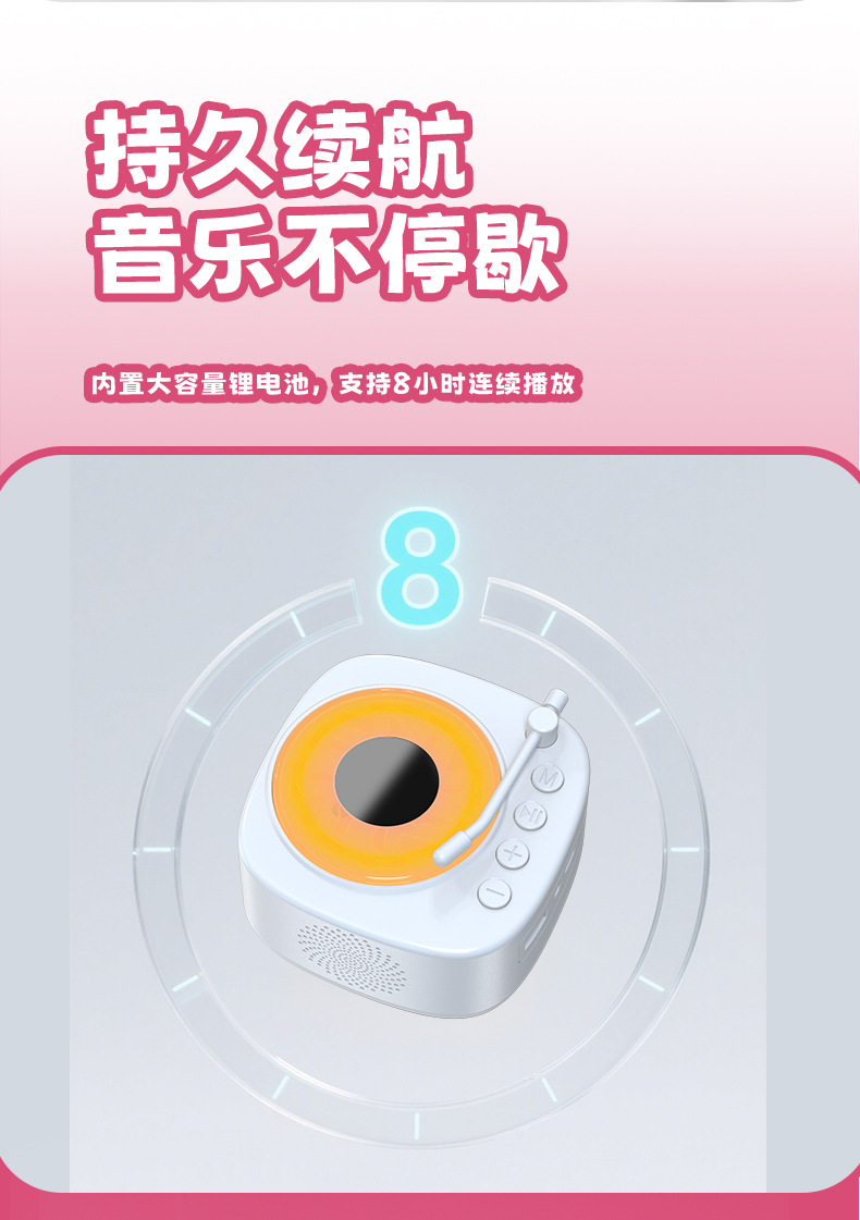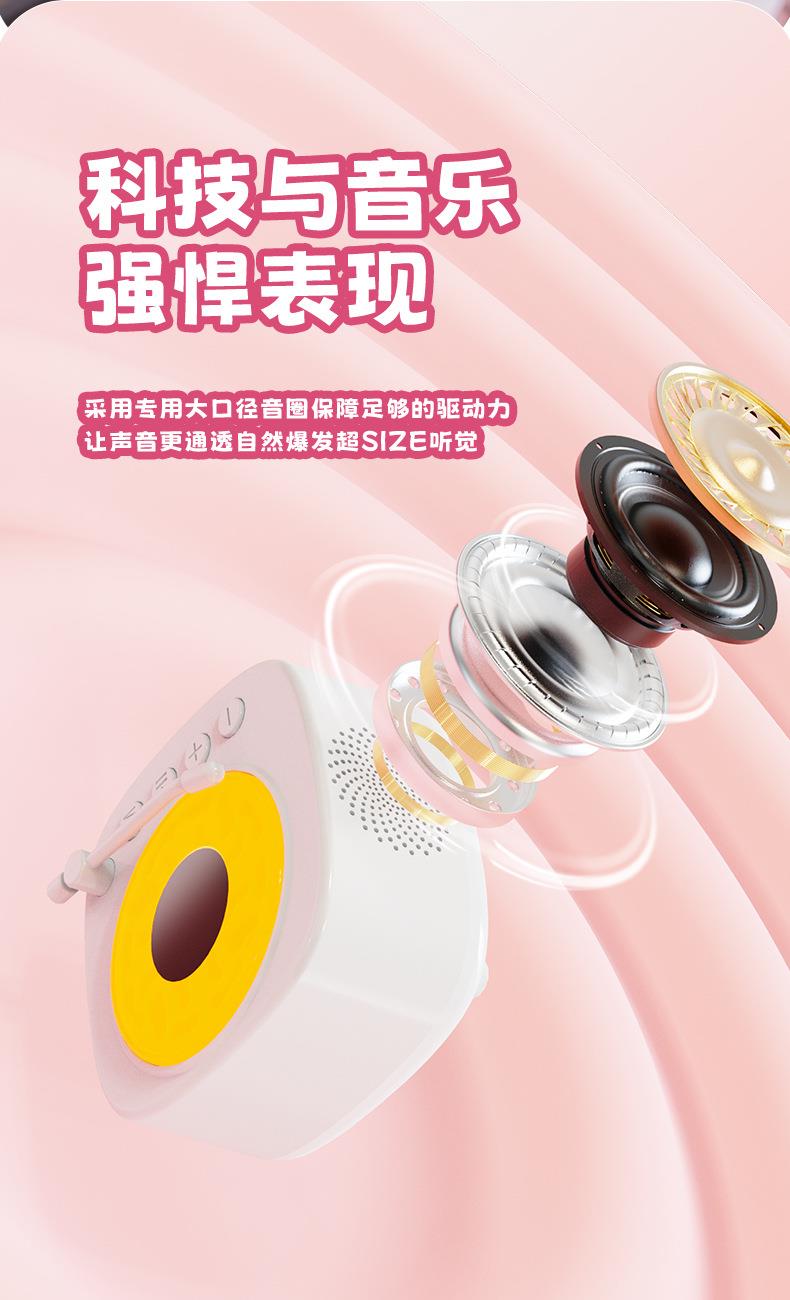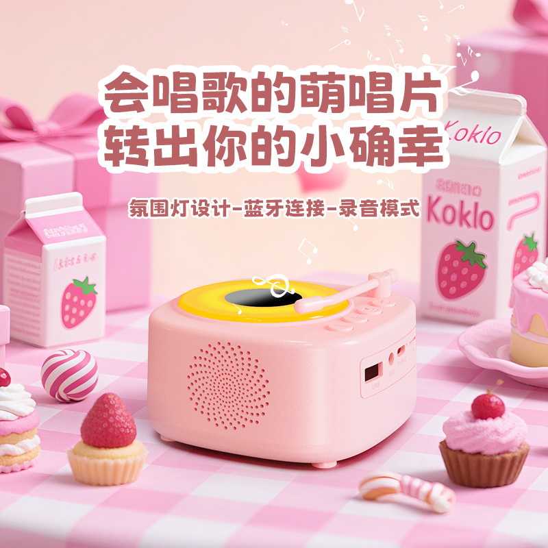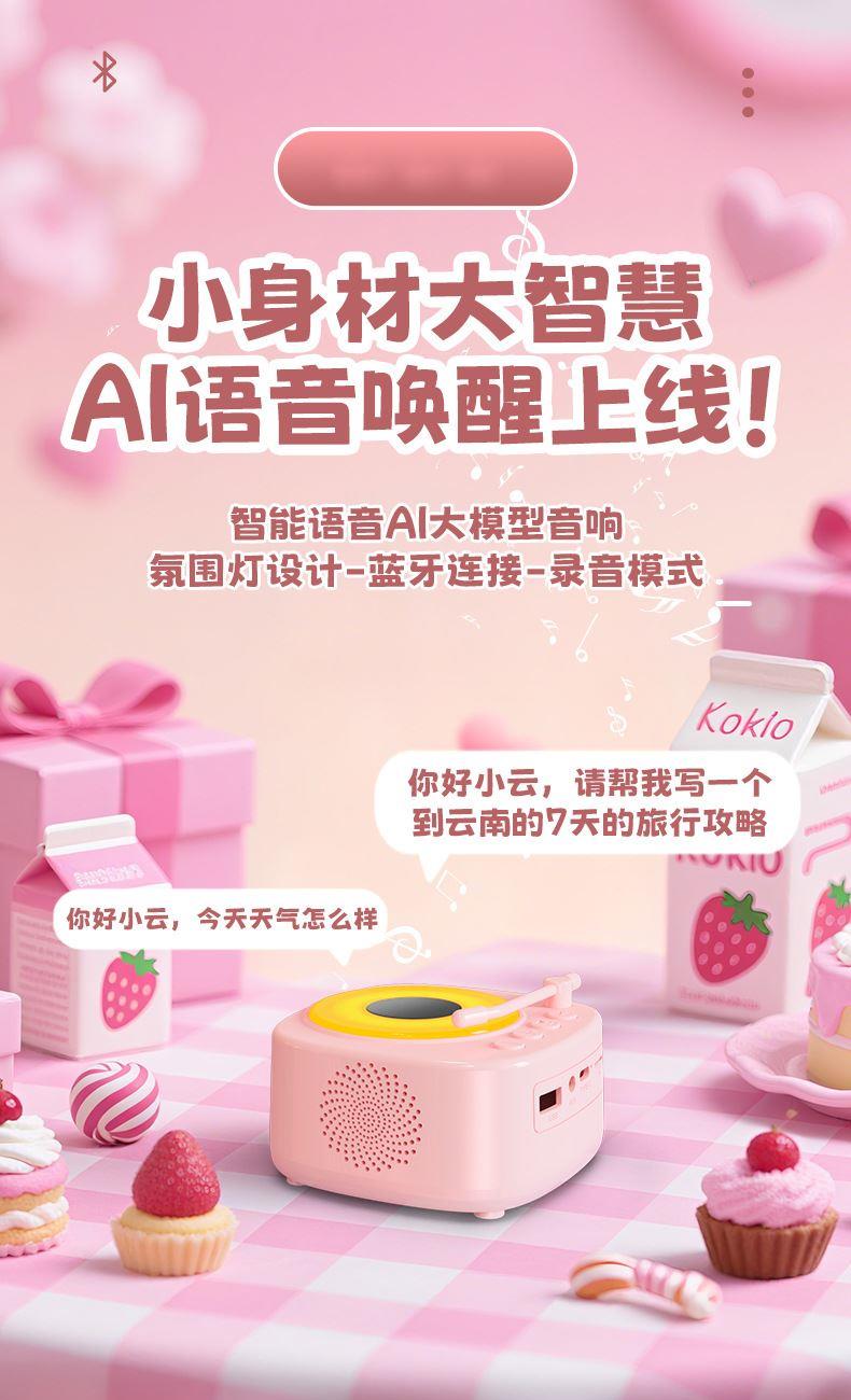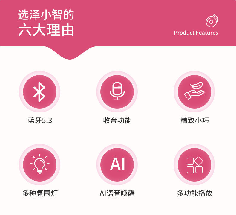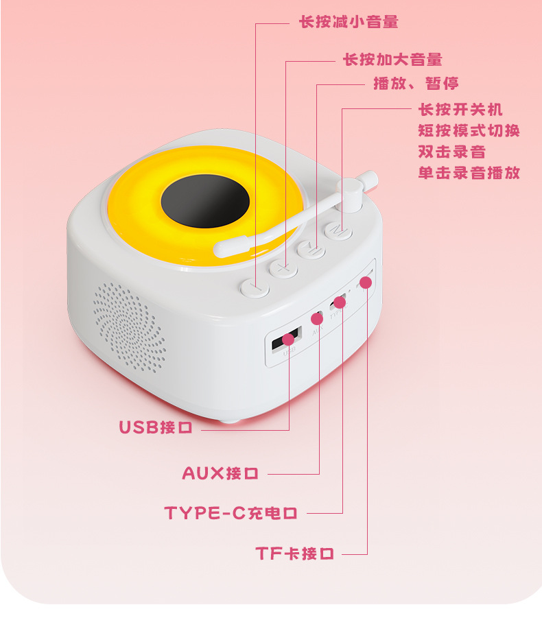 【颜色】白色、粉色 【扬声器功率】5W 【蓝牙版本】5.3 【材质】ABS 【播放模式】蓝牙、TF卡、U盘、AUX 【电池容量】1200mAh 【产品尺寸】115*115*62mm 唱片造型,炫彩氛围灯,多种灯光模式 智能语音AI,你好小云唤醒 采用大口径音圈保障足够的驱动力,让声音更通透 一键收音,内置FM天线,自动开启搜台模式
