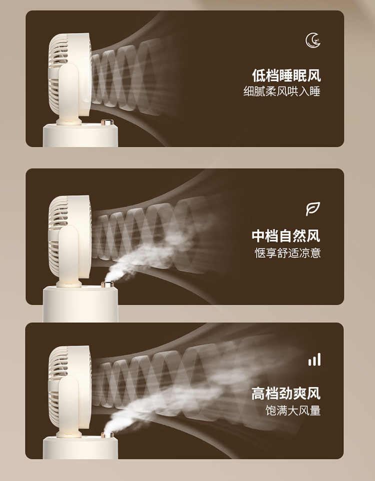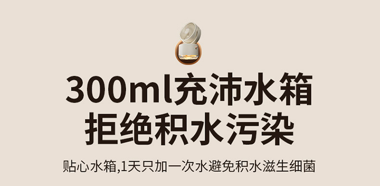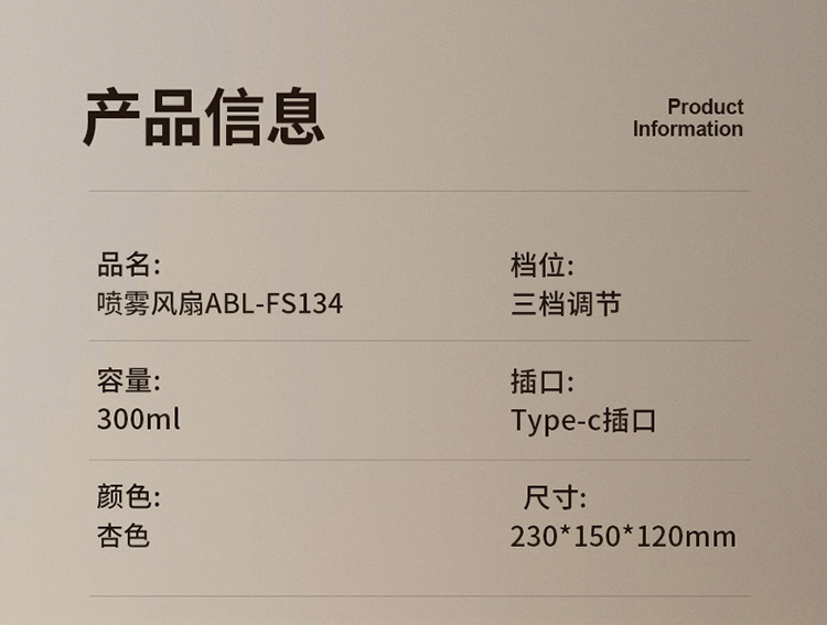 产品颜色:杏色 使用功率:2-8W 工作电压:DC5V/2A 喷雾量:30-50ML/H 电池容量:1800毫安 产品净重:465g 产品毛重:611g 产品尺寸:230*150*120MM 包装尺寸:239*155*122MM 1800毫安电池 纳米喷雾 1.5L大容量 三档风速调节 温馨氛围灯 上加水设计