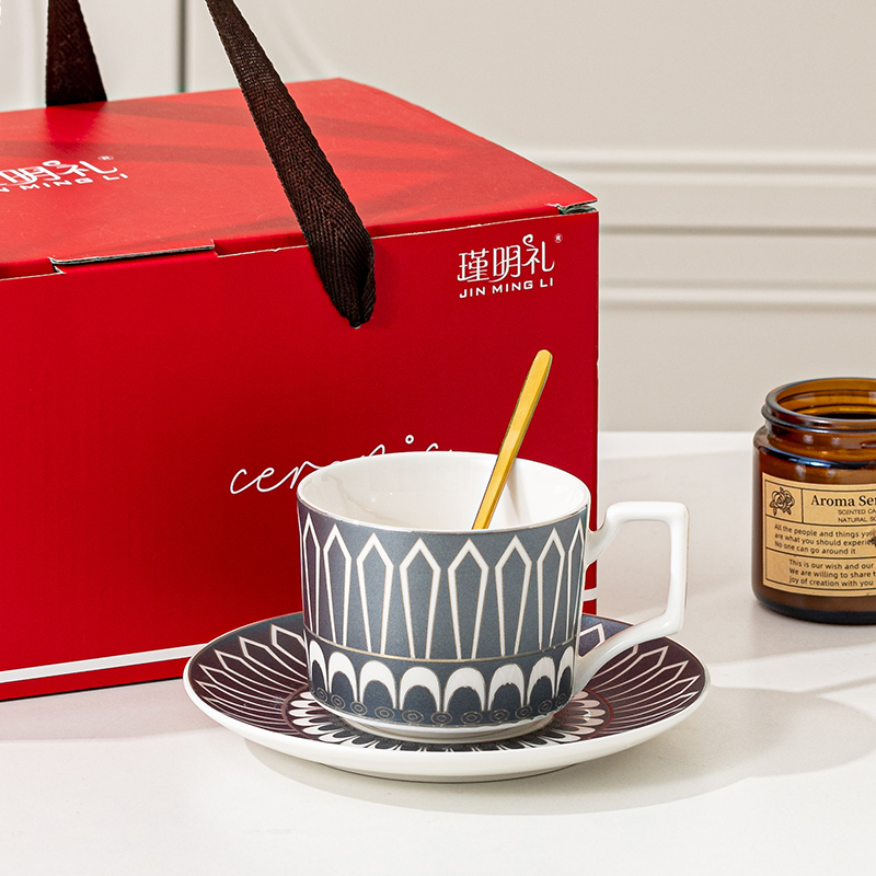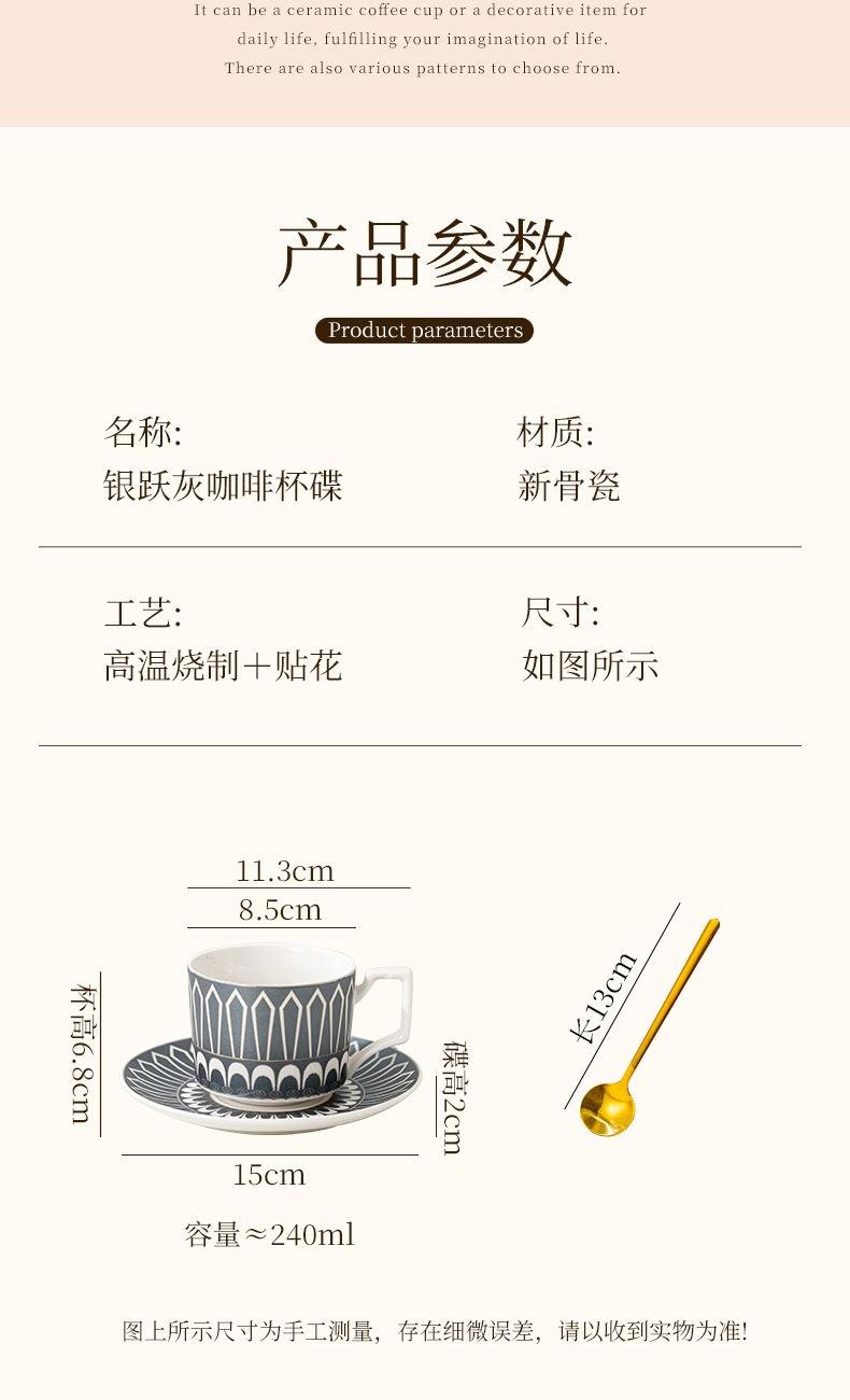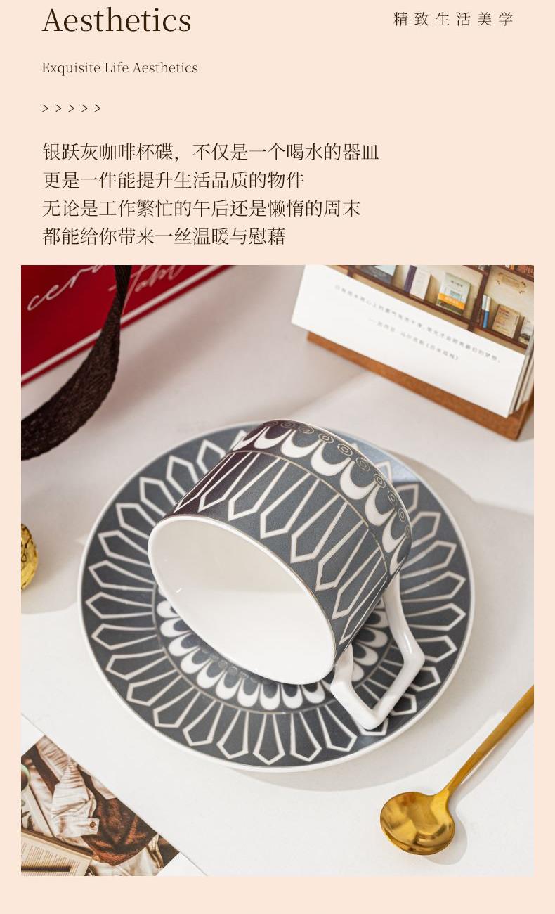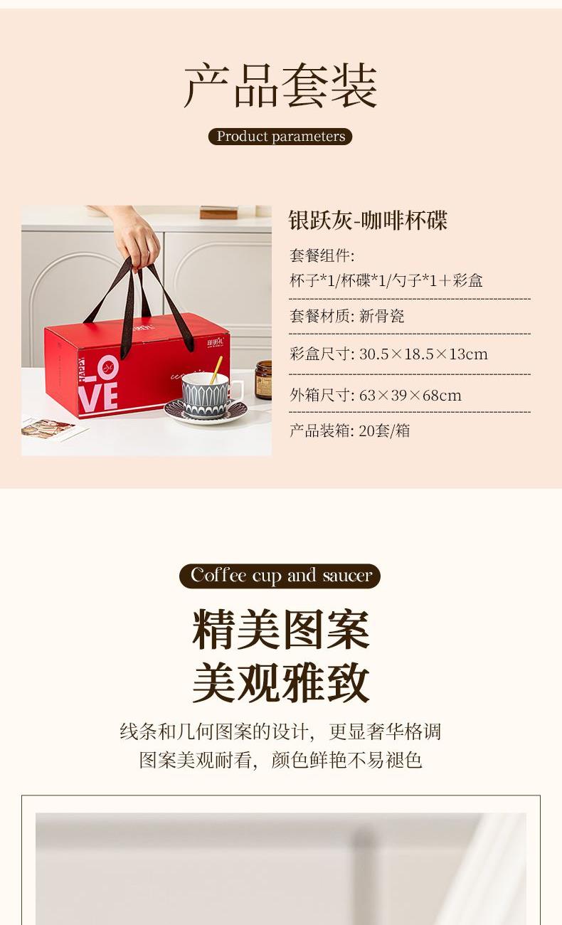 瑾明礼-银跃灰-咖啡杯碟-1杯1碟1勺 - 产品组成:整套=1杯1碟1勺+彩盒 产品材质:新骨瓷 产品规格:咖啡杯=口径8.5cm,高度6.8cm,容量240ml;碟=直径15cm,高2cm;金勺=长度13cm; 彩盒尺寸:30.5*18.5*13cm 产品毛重:0.8kg 整箱毛重:18kg 外箱尺寸:63*39*68cm - 线条和几何形状的设计往往带有一种抽象艺术的风格,能够满足消费者对于时尚和艺术的追求。这种设计不仅适合现代家居环境,还能成为时尚人士展示个性的单品。
