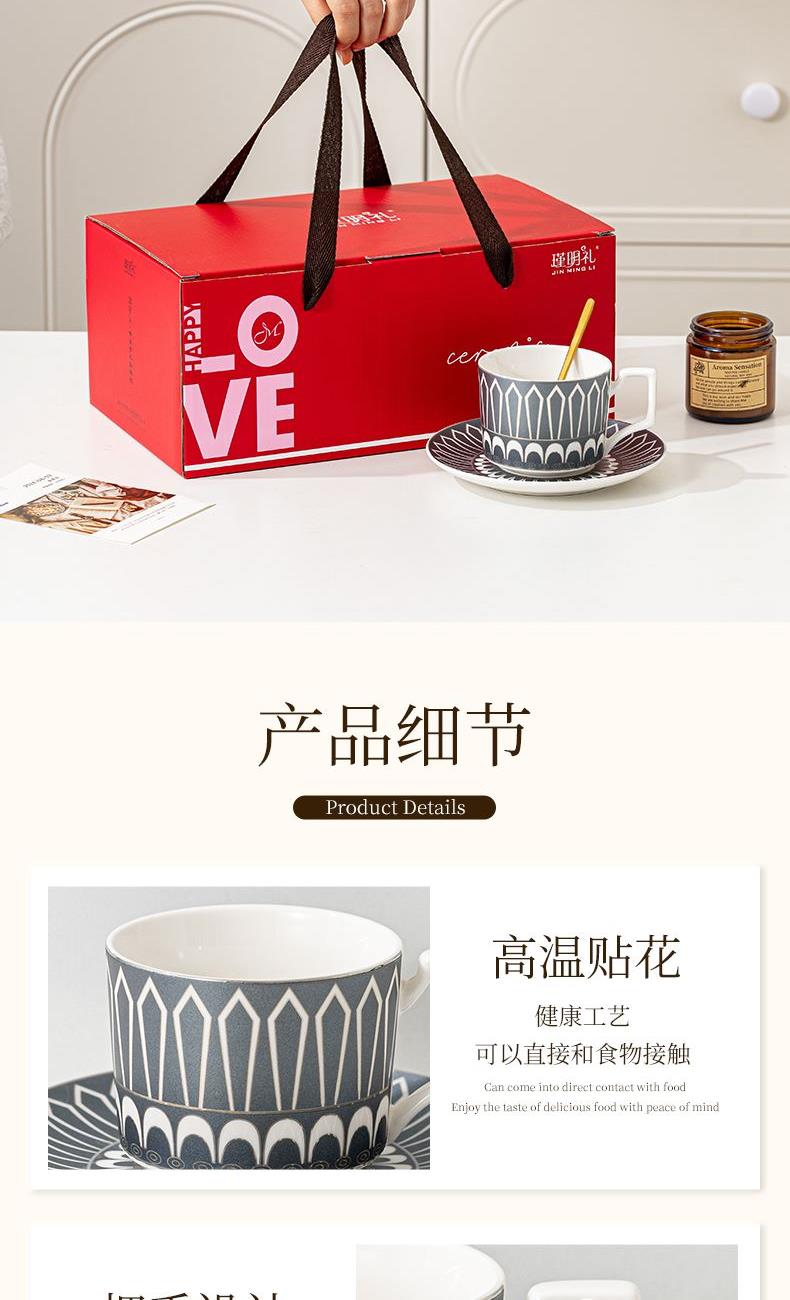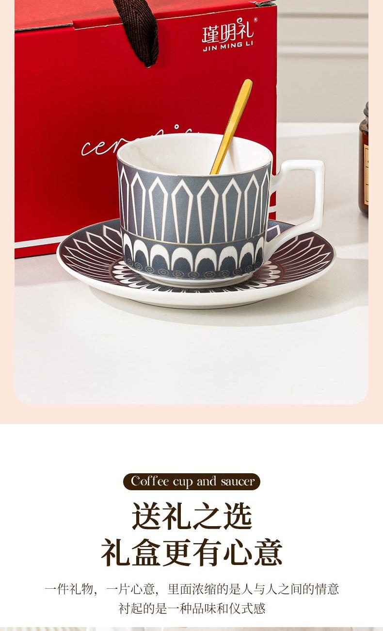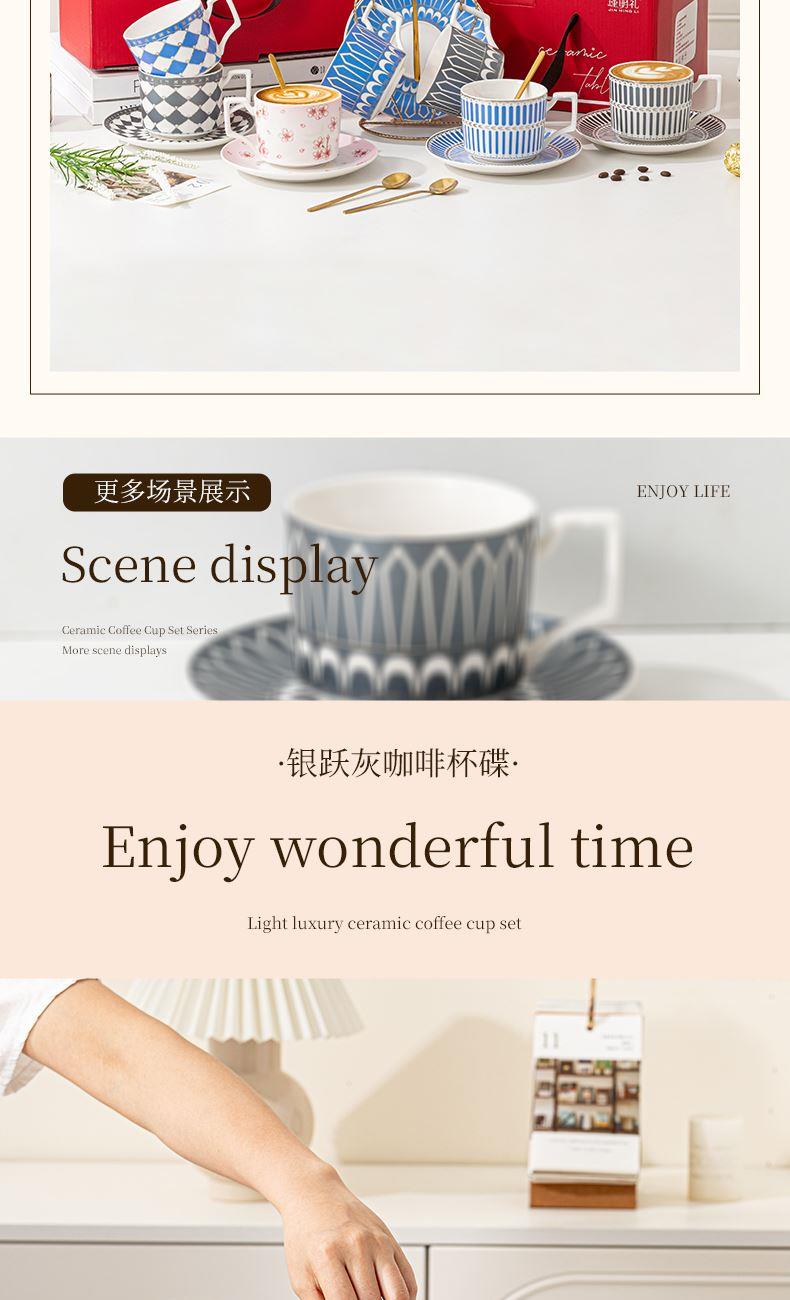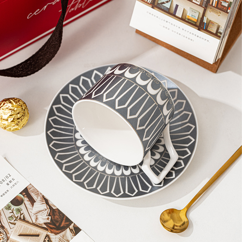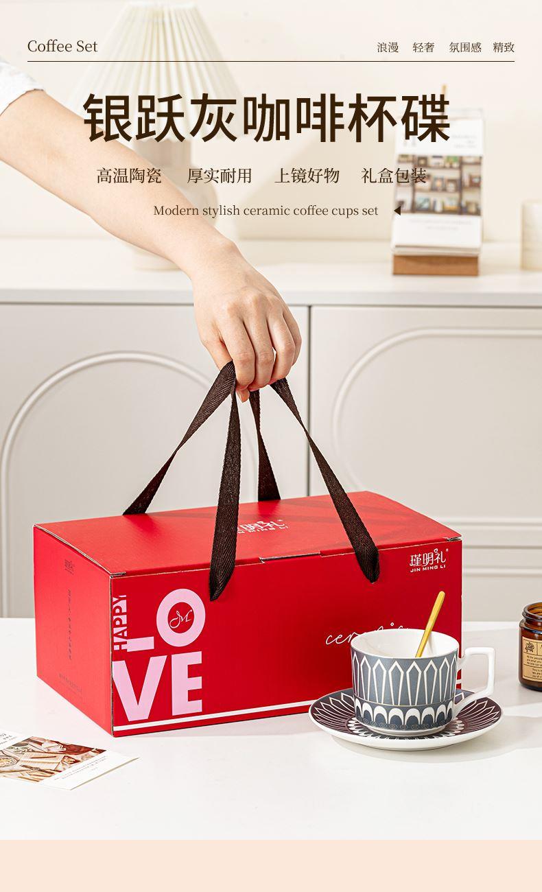 瑾明礼-银跃灰-咖啡杯碟-1杯1碟1勺 - 产品组成:整套=1杯1碟1勺+彩盒 产品材质:新骨瓷 产品规格:咖啡杯=口径8.5cm,高度6.8cm,容量240ml;碟=直径15cm,高2cm;金勺=长度13cm; 彩盒尺寸:30.5*18.5*13cm 产品毛重:0.8kg 整箱毛重:18kg 外箱尺寸:63*39*68cm - 线条和几何形状的设计往往带有一种抽象艺术的风格,能够满足消费者对于时尚和艺术的追求。这种设计不仅适合现代家居环境,还能成为时尚人士展示个性的单品。