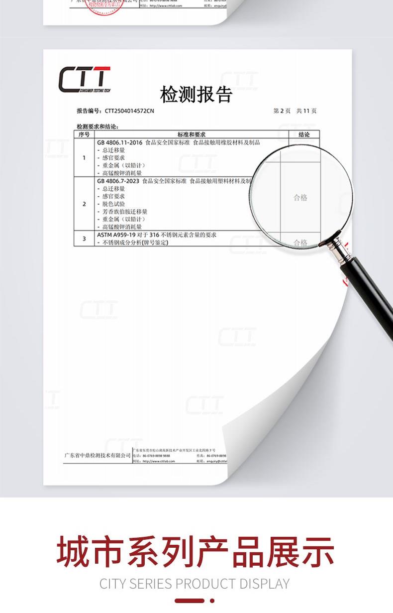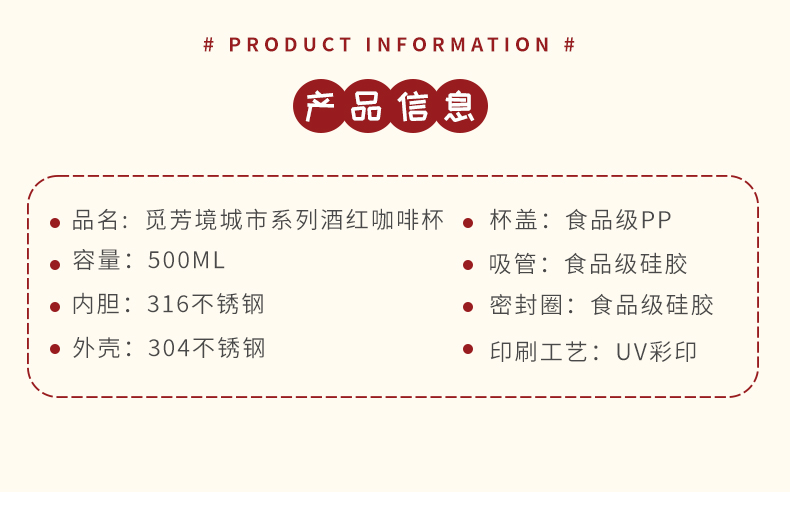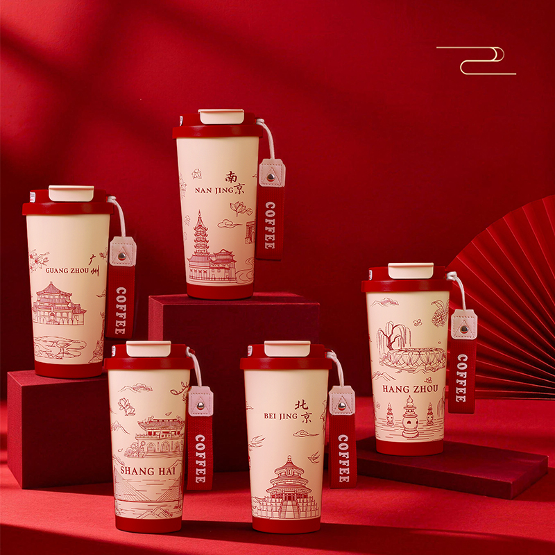 城市文创系列:北京、上海、广州,杭州、南京 容量:500ml 内胆:316 外壳:304 杯盖:食品级PP 吸管:食品级硅胶 吸嘴:食品级PP 密封圈:食品级硅胶