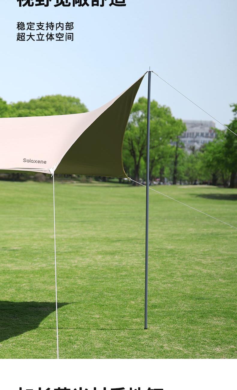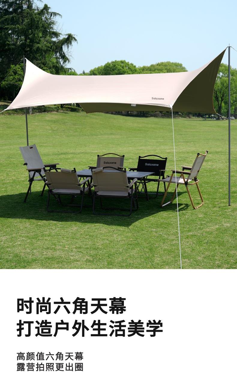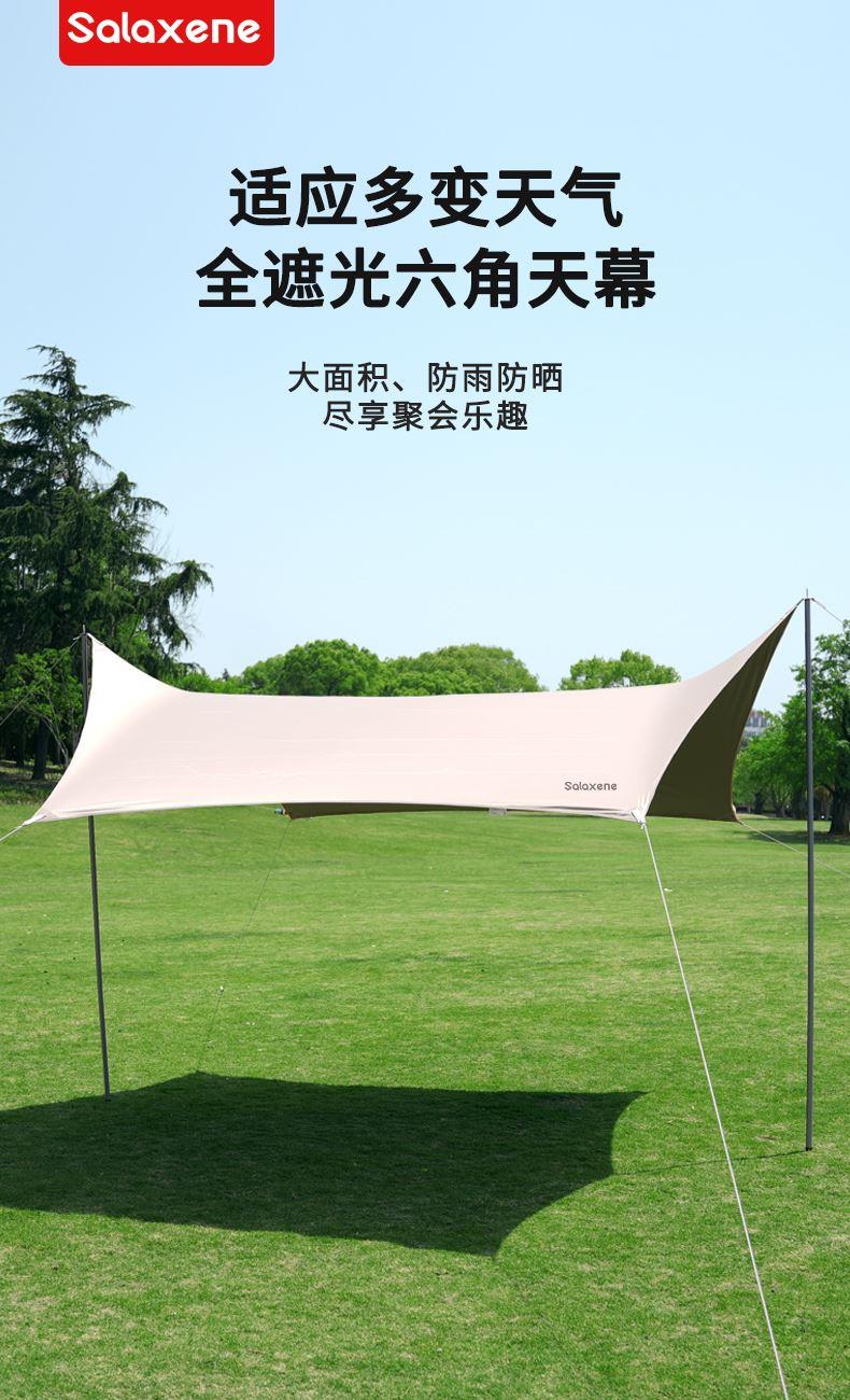 1、六角稳固、舒适露营;; 2、从容应对户外多变天气; 3、大空间更舒适、可容纳多人; 4、配备收纳包、给您更好的户外体验; 5、轻松阻挡紫外线、大面积遮阳;