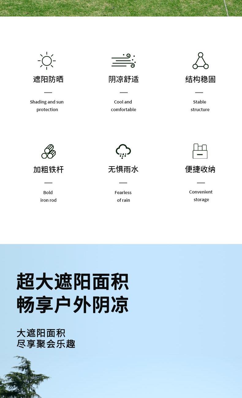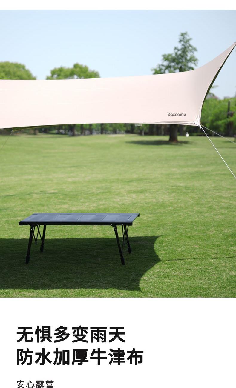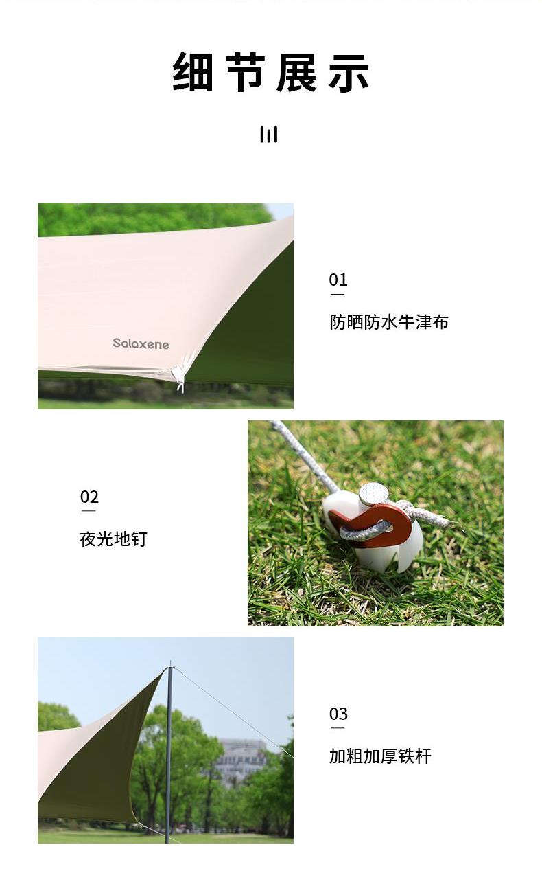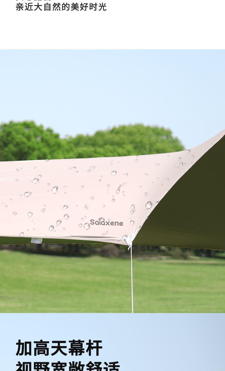 1、六角稳固、舒适露营;; 2、从容应对户外多变天气; 3、大空间更舒适、可容纳多人; 4、配备收纳包、给您更好的户外体验; 5、轻松阻挡紫外线、大面积遮阳;