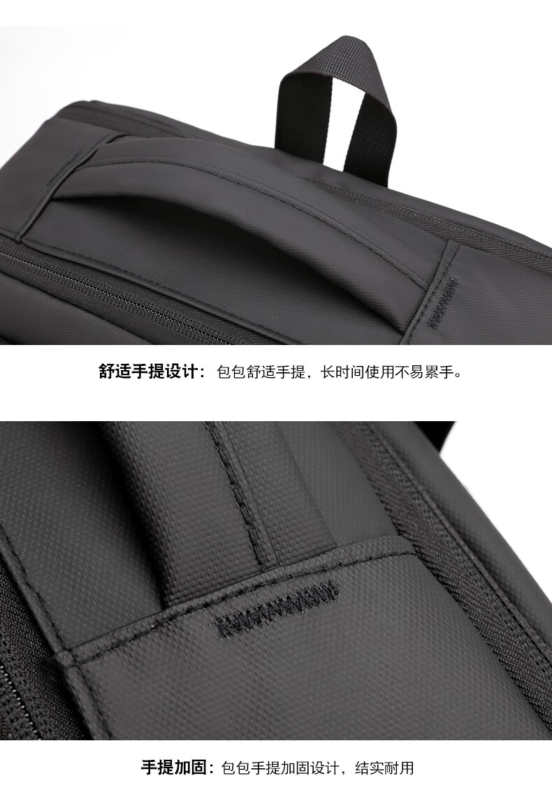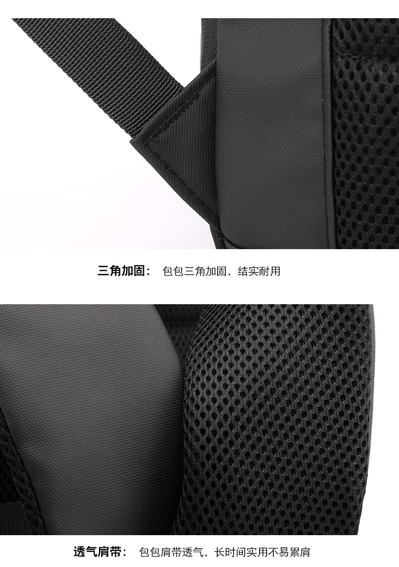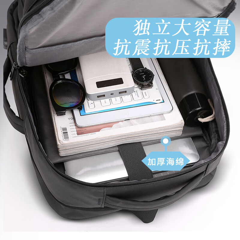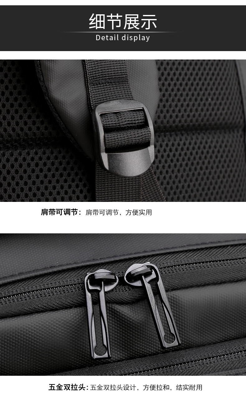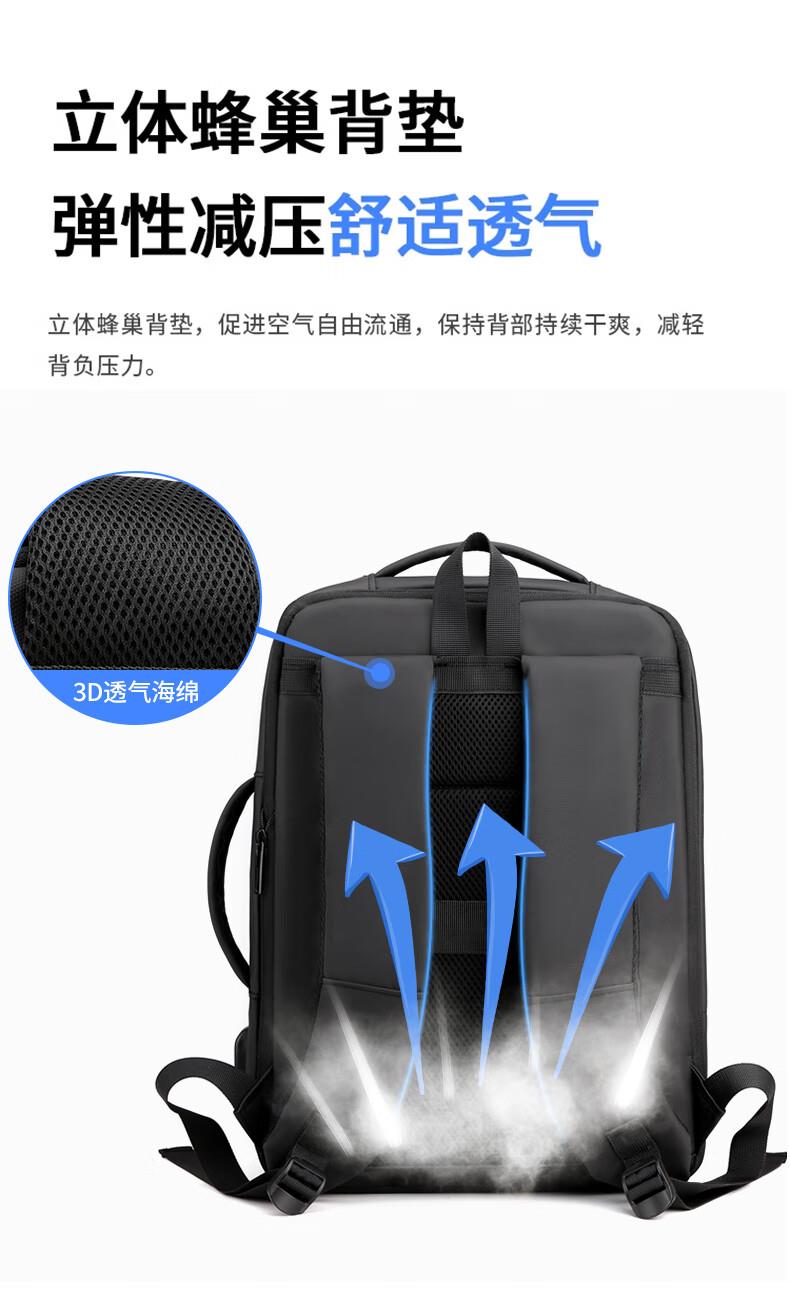 描述: 1.大容量科学分层,收纳有序 创新扩容式设计,装的更多 2.采用优质皮膜材料 防磨耐刮防泼水; 3.超大容量设计可放15.6寸电脑; 4.外置USB接口可直接连接手机充电; 5.主袋内加厚电脑隔层; 6.弹力蜂窝背板、透气、缓压、减震 7;拉杆箱套袋设计,出行更方便 8:加厚透气减负肩带,久背不累 型 号:99002 尺 寸:420*310*200(MM) 材 质:织物 颜 色:黑色 重 量:0.8kg