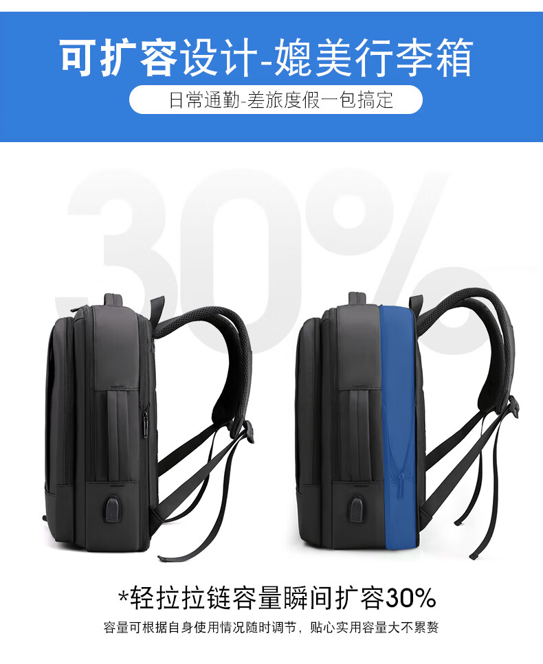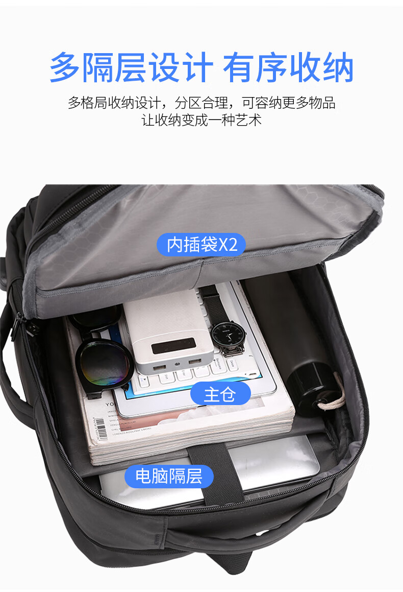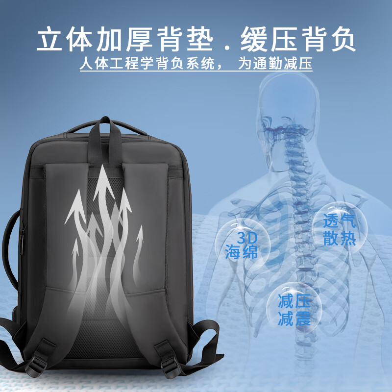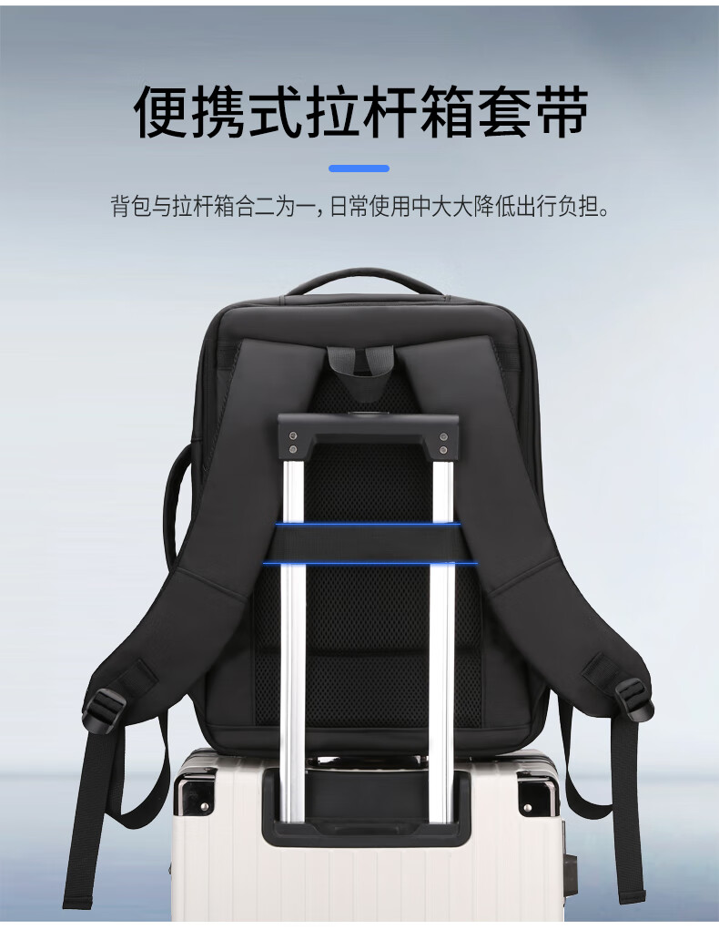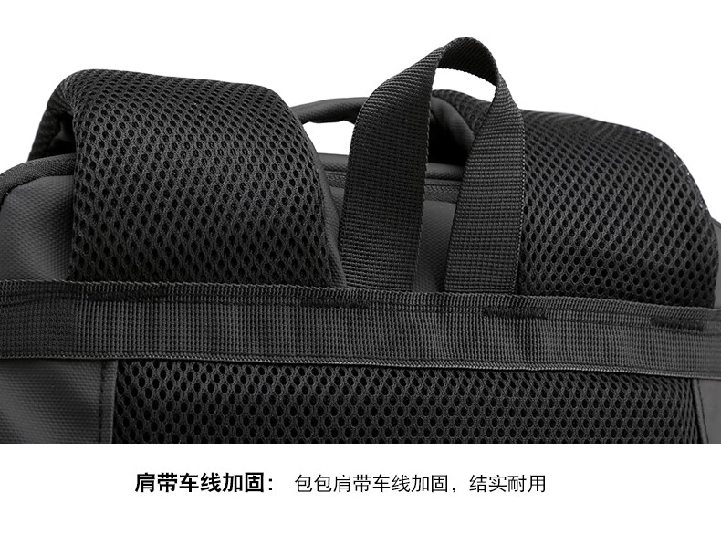 描述: 1.大容量科学分层,收纳有序 创新扩容式设计,装的更多 2.采用优质皮膜材料 防磨耐刮防泼水; 3.超大容量设计可放15.6寸电脑; 4.外置USB接口可直接连接手机充电; 5.主袋内加厚电脑隔层; 6.弹力蜂窝背板、透气、缓压、减震 7;拉杆箱套袋设计,出行更方便 8:加厚透气减负肩带,久背不累 型 号:99002 尺 寸:420*310*200(MM) 材 质:织物 颜 色:黑色 重 量:0.8kg