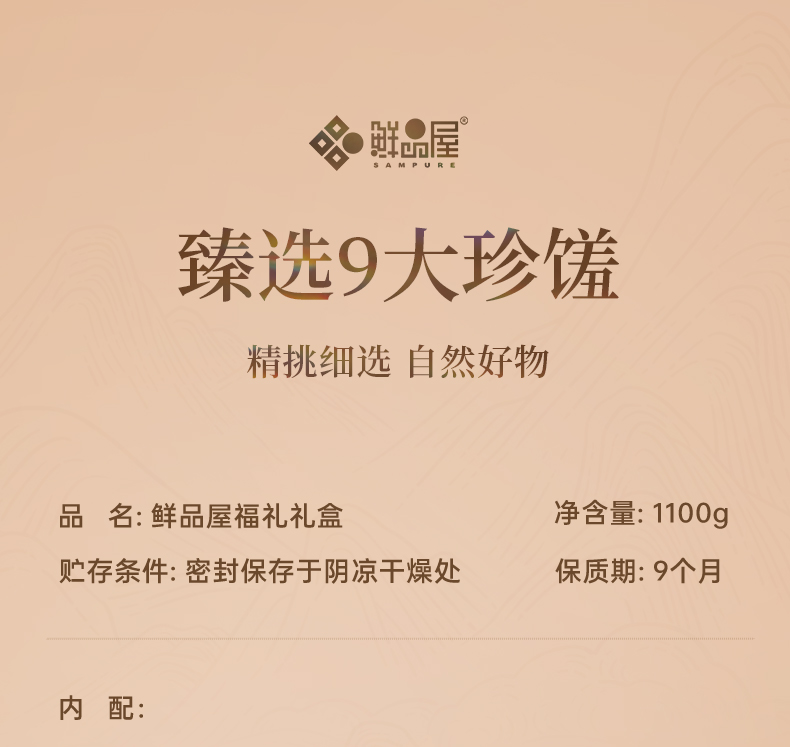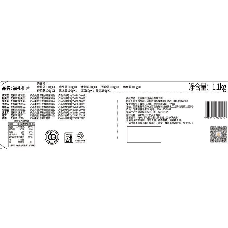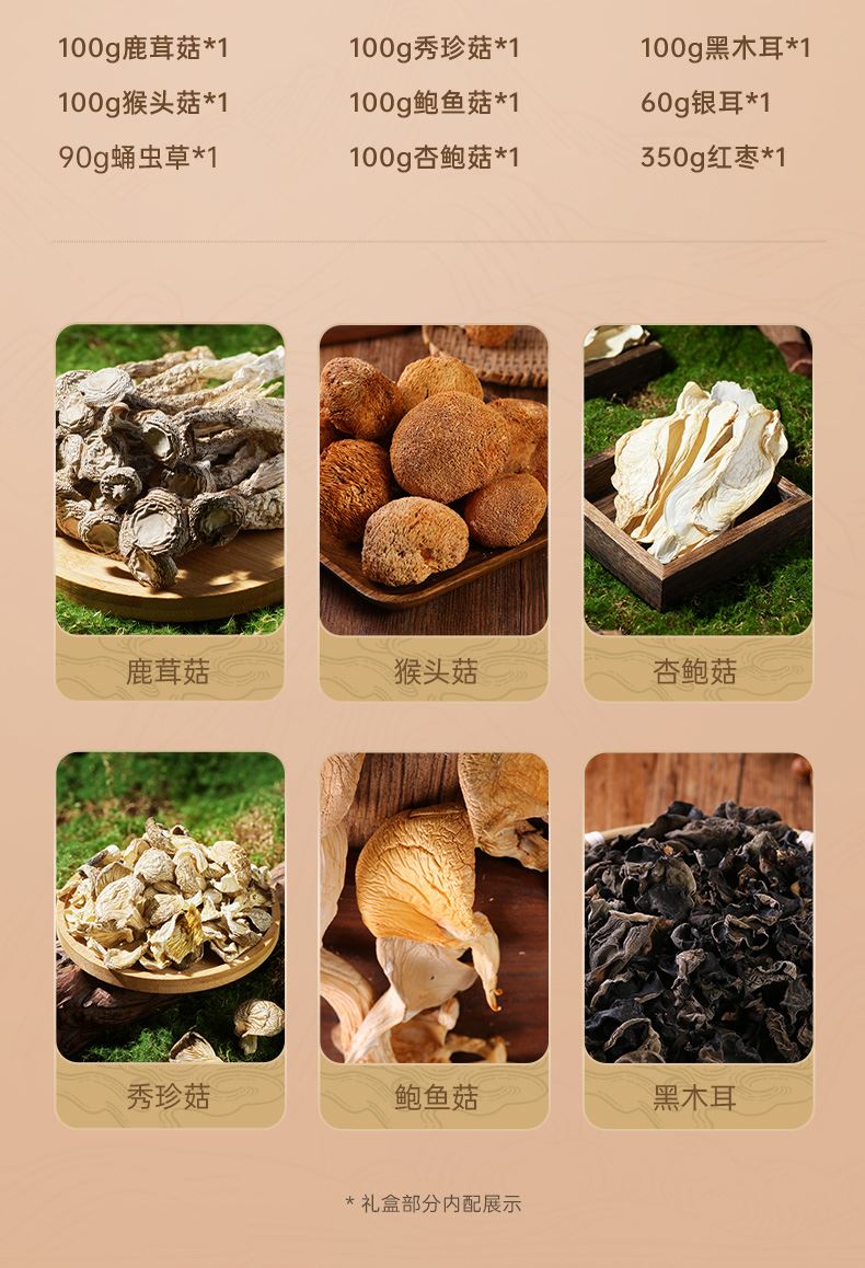 100g鹿茸菇*1 100g猴头菇*1 90g蛹虫草*1 100g秀珍菇*1 100g鲍鱼菇*1 100g杏鲍菇*1 100g黑木耳*1 60g银耳*1 350g红枣*1