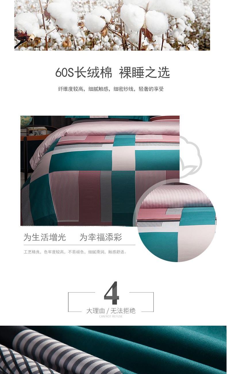产品规格:1.8m床: 被套:220*240cm 床单:240*245cm 枕套*2:48*74cm 产品材质:棉(60S长绒棉活性印花) 1、甄选优质长绒棉,纤维柔长强劲,日晒长久,细致加工处理,高支高密绵软细腻,亲肤透气,享品质睡眠。做工细致悬垂丝滑,点滴细节带来细致床品。 2、活性印染工艺,不易褪色,细致加框包边,立体流感美感。