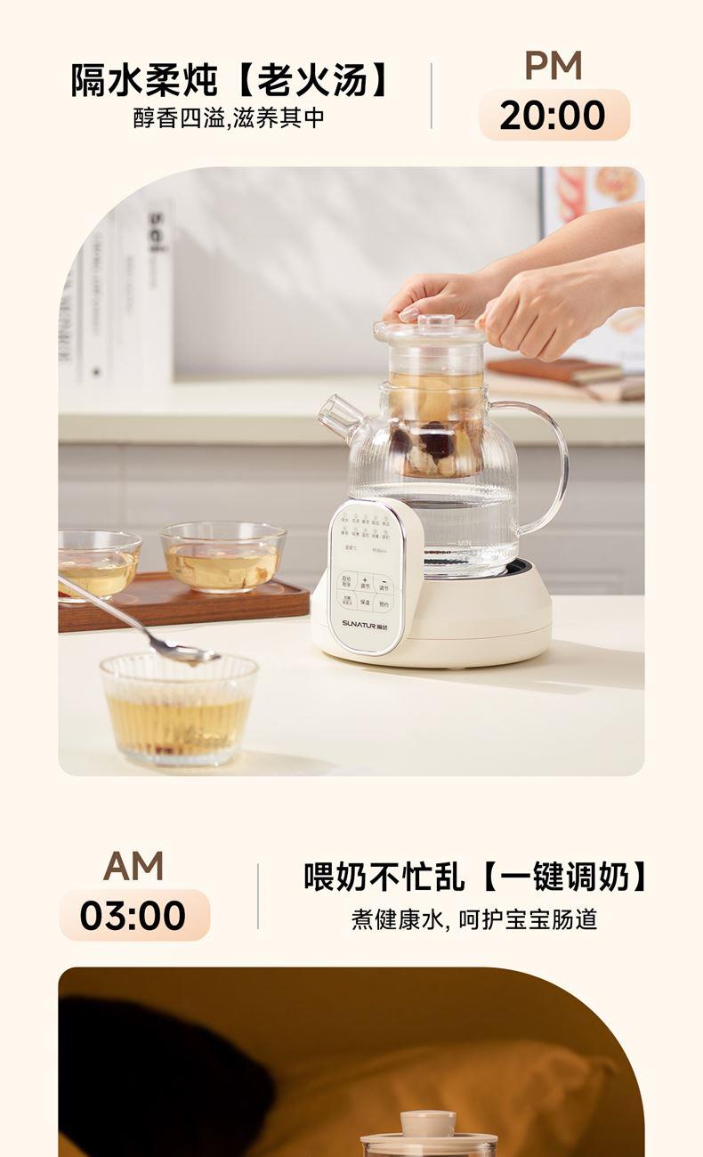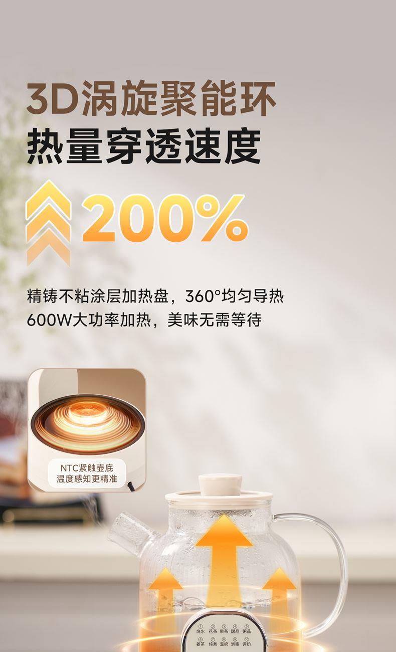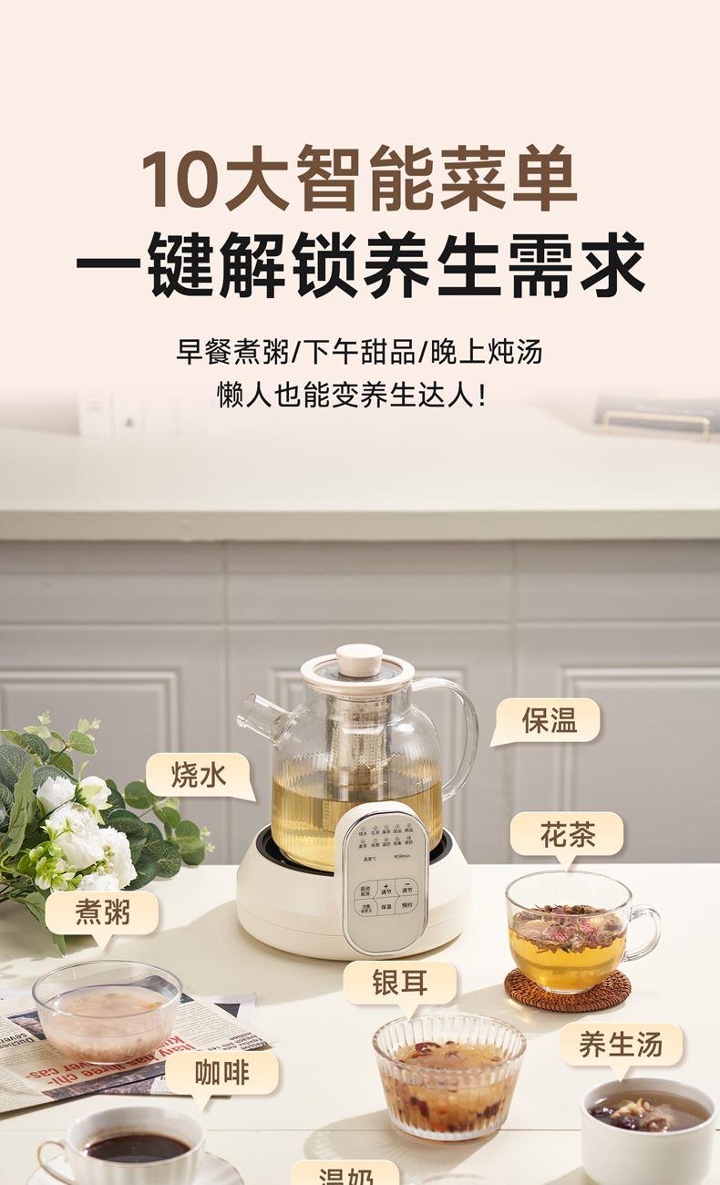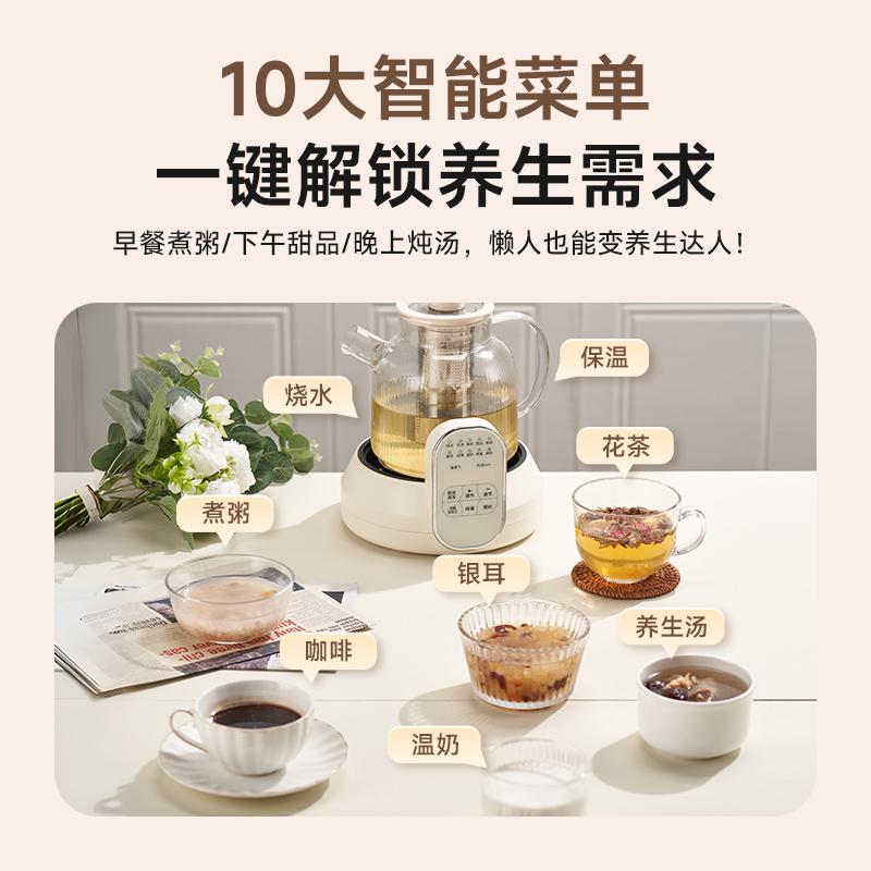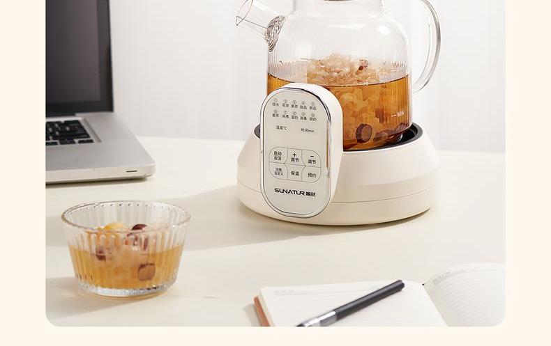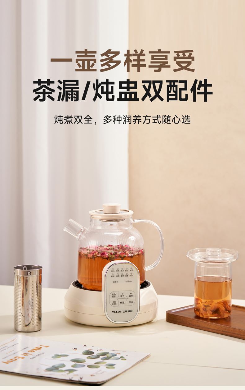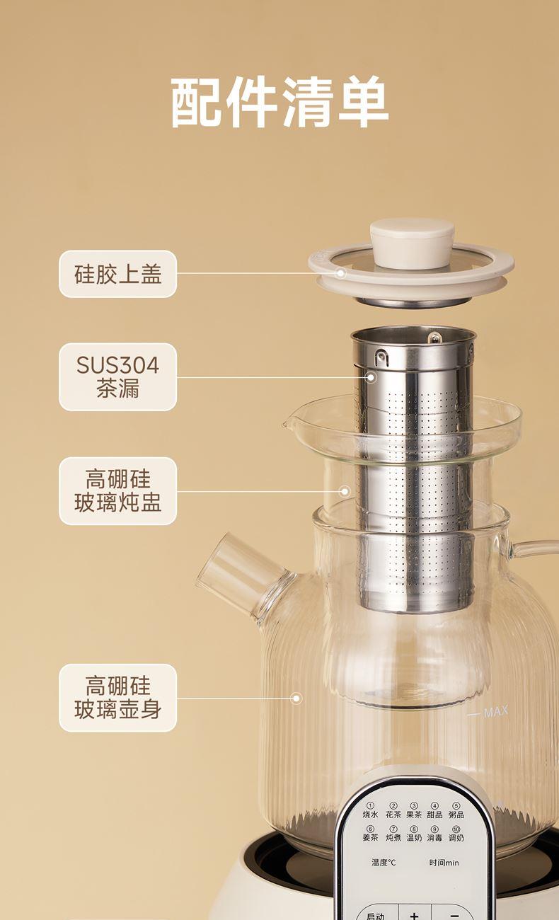 1.2L大容量,高硼硅玻璃壶体,无缝一体式密封设计 600W 功率发热技术; 分体式结构,搭配玻璃炖盅和不锈钢滤网,满足炖煮、过滤等多样需求; 10大智能菜单加持,支持全自动炖煮、恒温保温,适配花茶、养生汤等多种场景;
