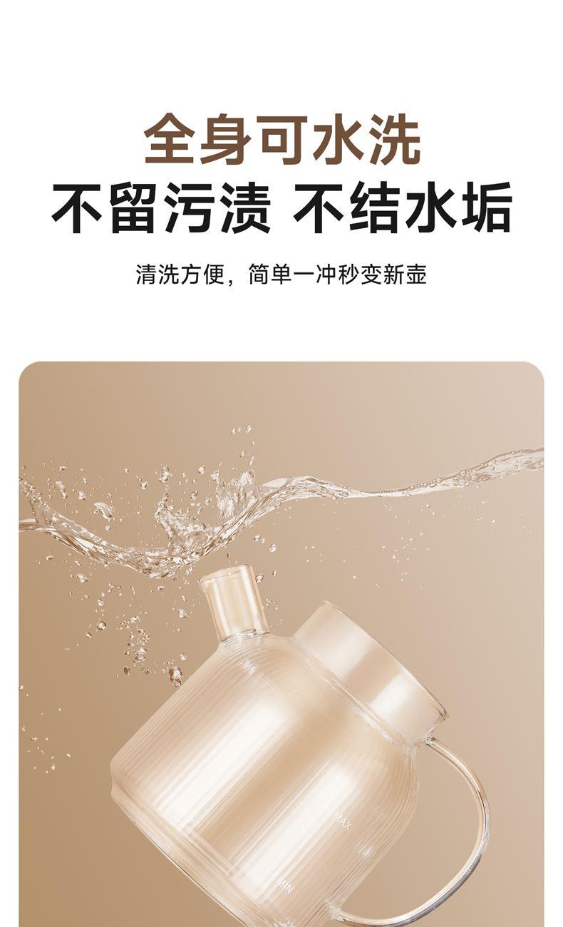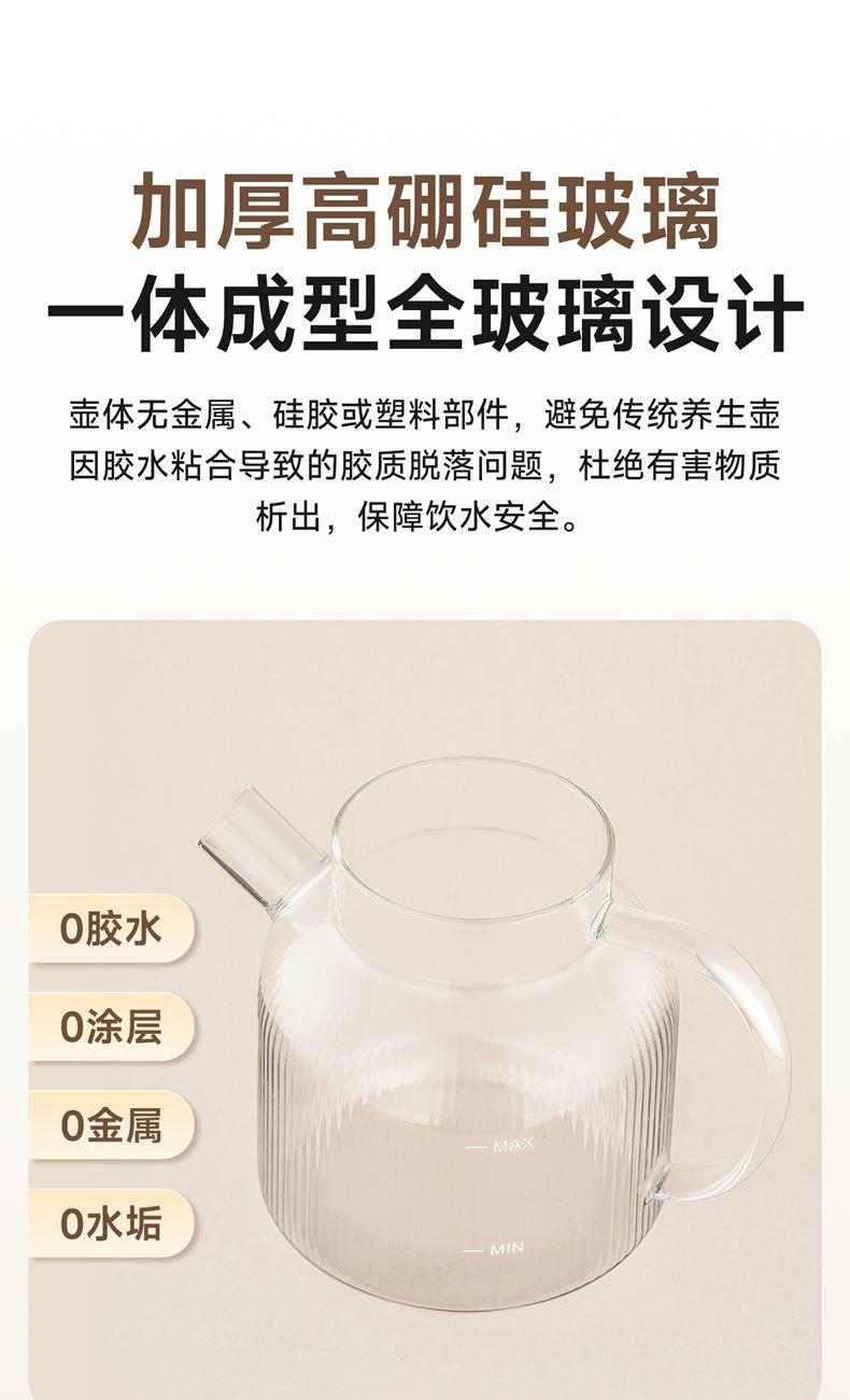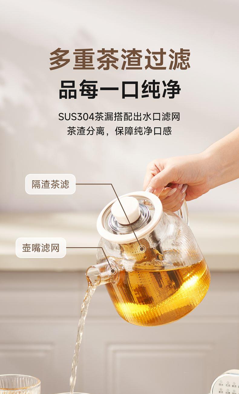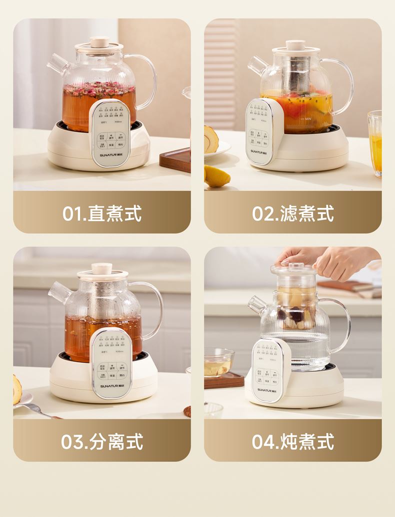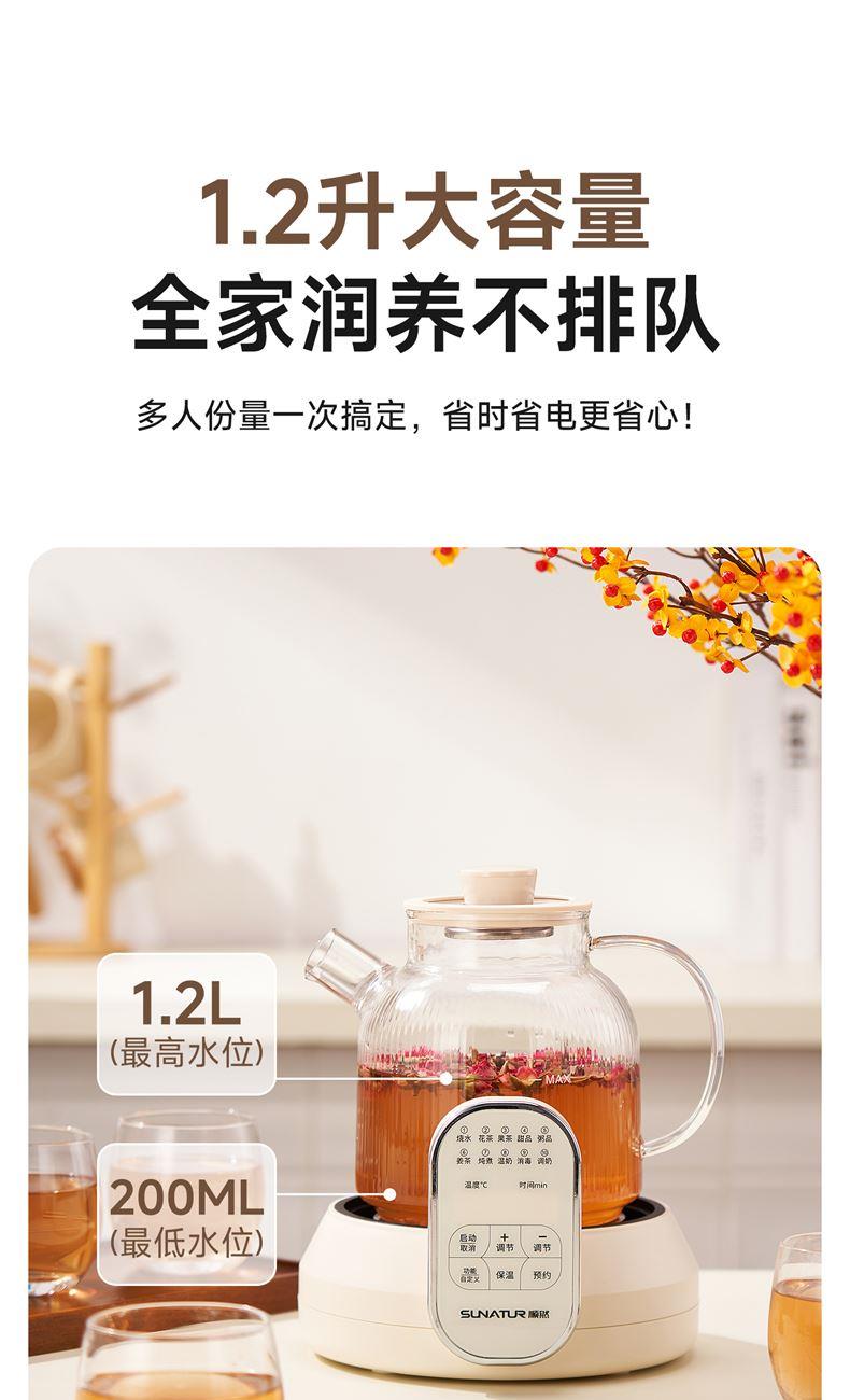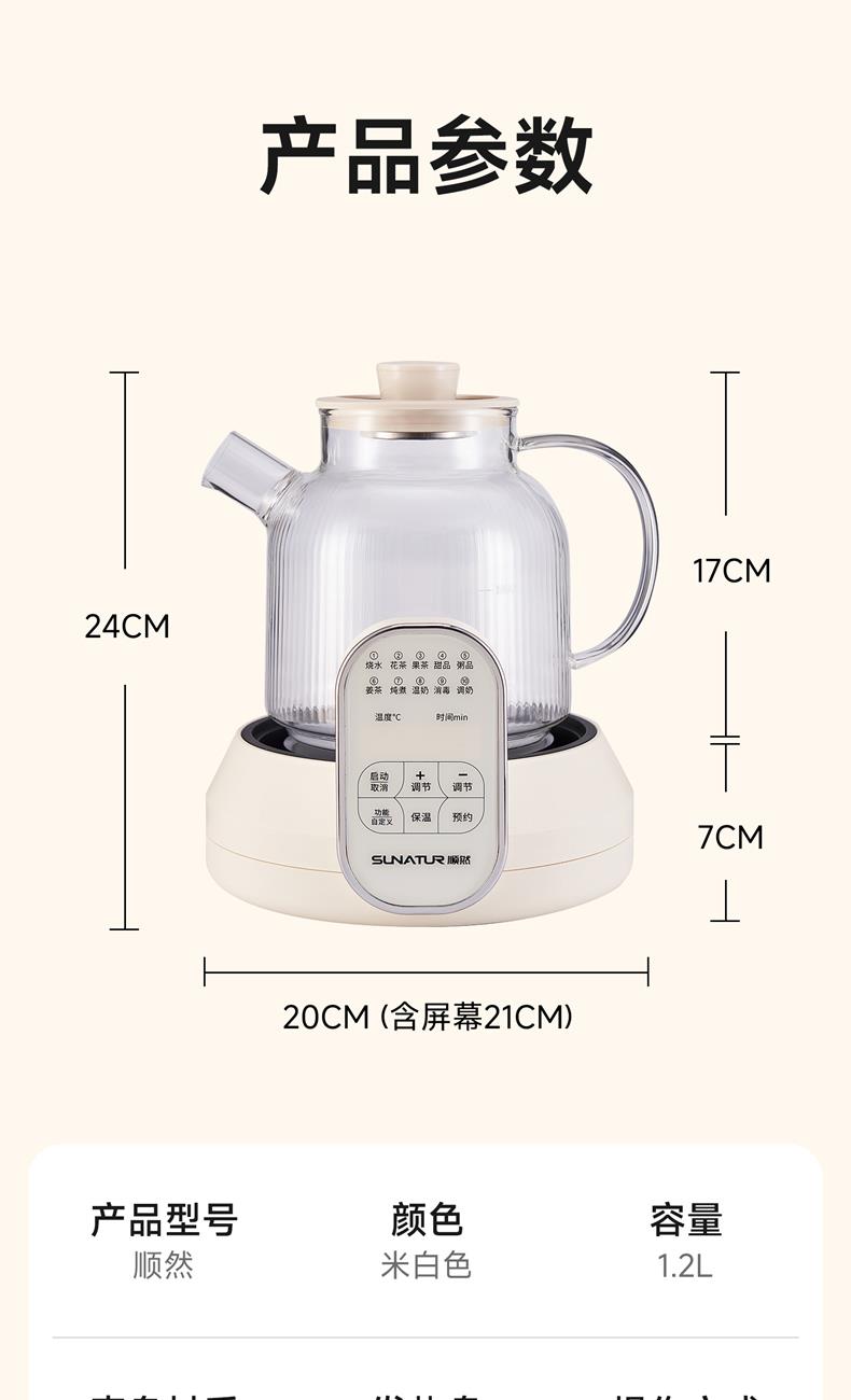 1.2L大容量,高硼硅玻璃壶体,无缝一体式密封设计 600W 功率发热技术; 分体式结构,搭配玻璃炖盅和不锈钢滤网,满足炖煮、过滤等多样需求; 10大智能菜单加持,支持全自动炖煮、恒温保温,适配花茶、养生汤等多种场景;