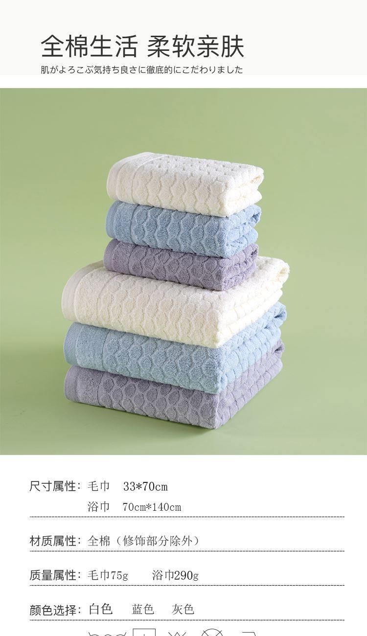 产品型号:圆致生活-5 规格:毛巾33*70cm*2 浴巾70*136cm 克重:毛巾75g 浴巾290g 材质:纯棉 颜色:随机 组装形式:1浴巾2毛巾 纯棉材质,蓬松柔软手感细腻,吸水透气效果好,不起静电不起球,能够快速吸收肌肤表面多余水分,让肌肤享受纯棉天然柔软度,拒绝滑腻倍感舒适。