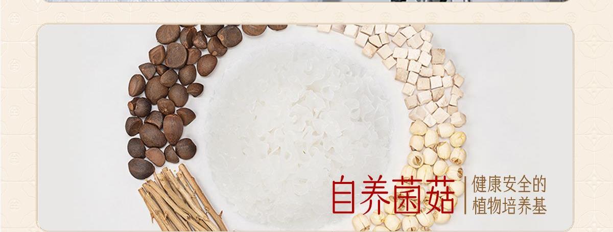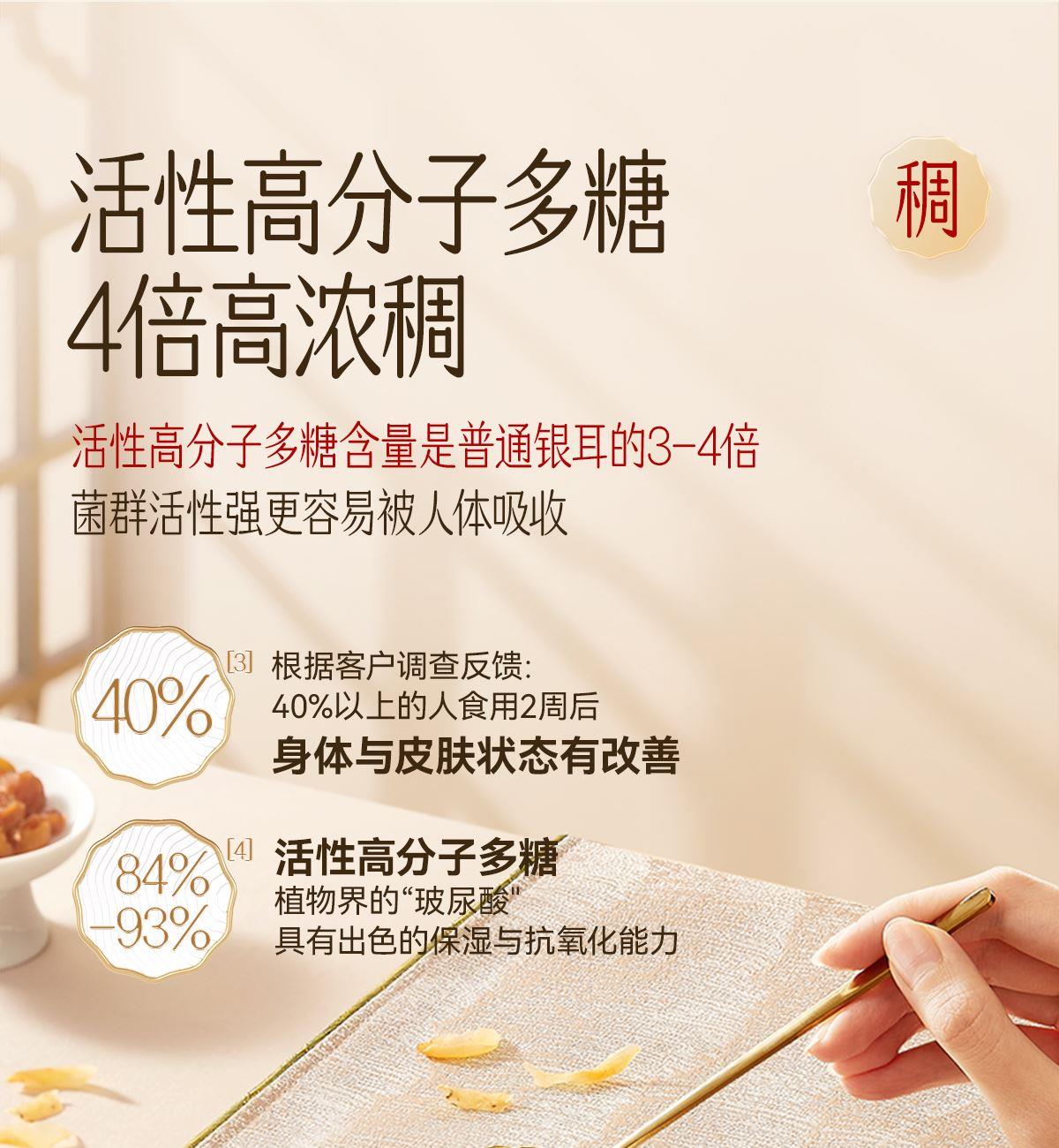 内含:纯萃50g*2、黄色手提袋*1 保质期:12个月 推荐理由: 优选多种药食同源珍材料做养料包精心培育,吸收食材精华营养价值高,胶养活性分子含量丰富充分吸收培植基营养,高泡发率,胶质浓稠,口感爽滑。银耳粗多糖42.5%,胶质多多,是普通银耳的3倍;含有27种营养成分,低脂低负担,减脂期也能吃免洗免泡,开水冲泡40分钟即可食用 全产业链严格把控,从源头把控品质,全环节可追溯