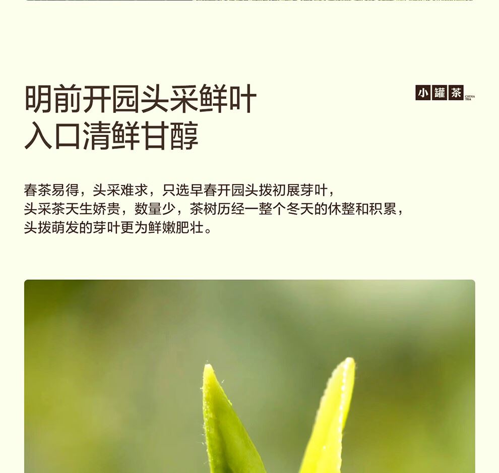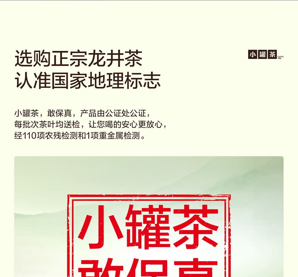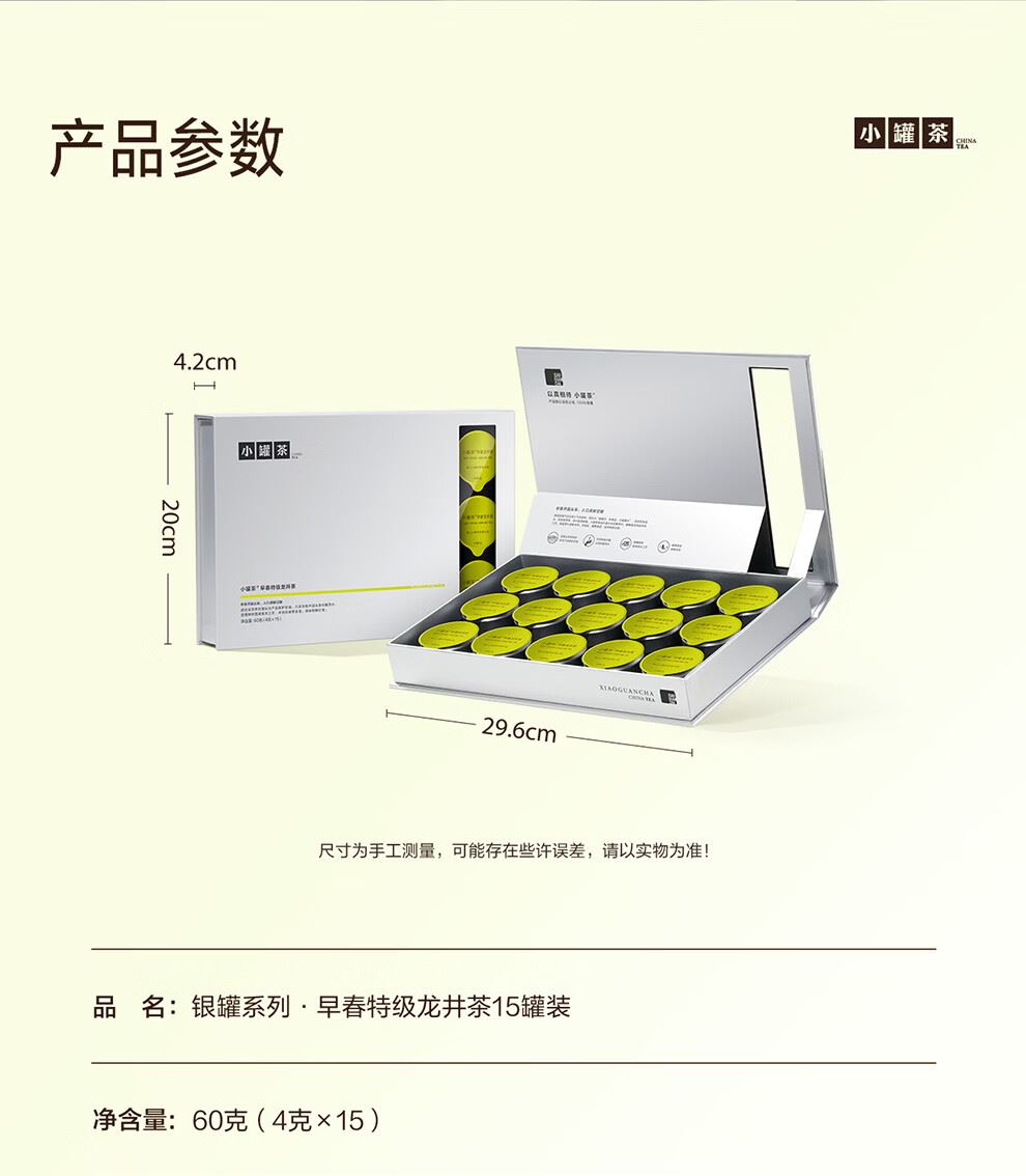 轻奢商务茶叶pin牌-小罐茶 小罐茶全国线下2000+实体门店 公证处公证 x 小罐茶敢保真(产地保真、年份保真、安全保真) 高duan档次商务送礼就送小罐茶 明前特级龙井商务礼赠珍选 银罐系列 · 早春特级龙井茶15罐装 正宗龙井 | 明前开园头采 | 特级品质 明前开园头采鲜叶 入口清鲜甘醇 春茶易得,头采难求,只选早春开园头拨初展芽叶 礼盒尺寸:29.6*4.2*20cm 净含量:60克(4g*15罐)等级:特级 - 让舌尖懂茶 是好茶的责任 精致礼盒包装,送礼体面彰显尊贵。15罐独立包装,传递社交礼赠祝福。一饮一罐,定量封装,手不沾茶,更显品位;一盒满足礼赠贵宾、商务会面、重要答谢等需求。