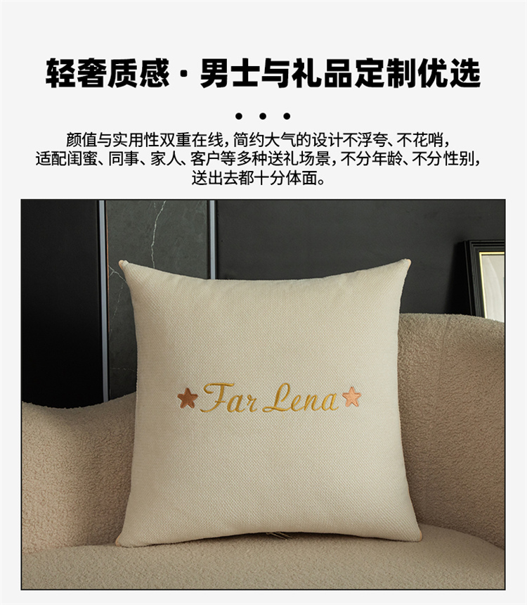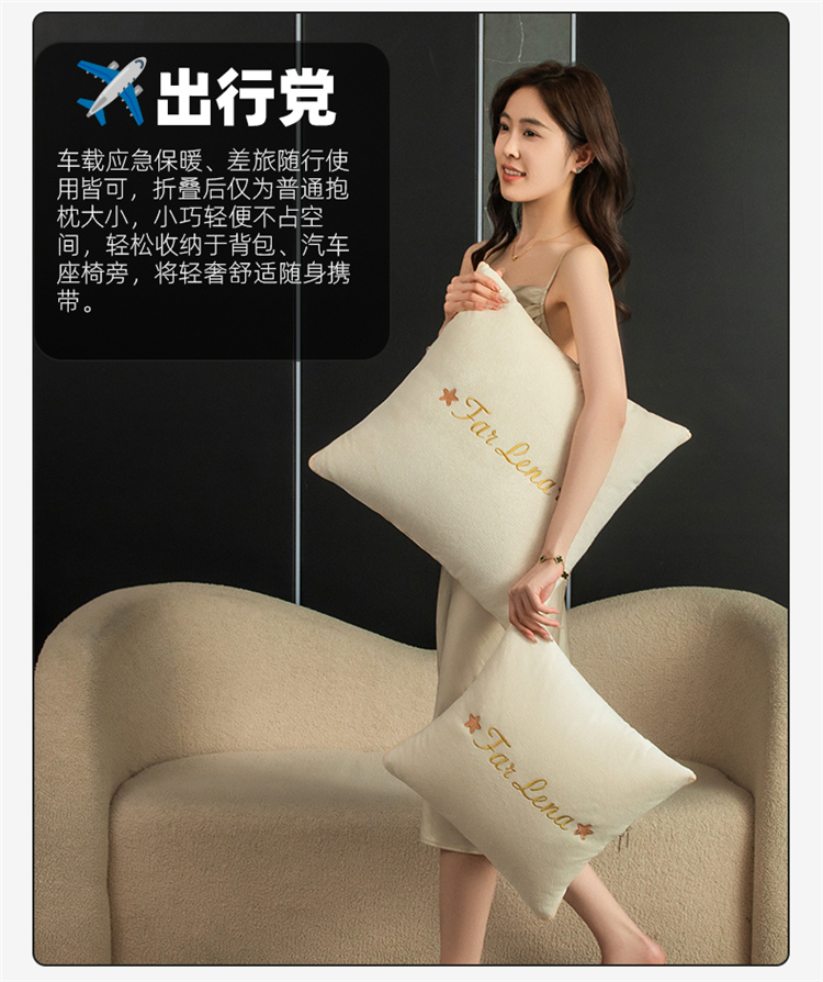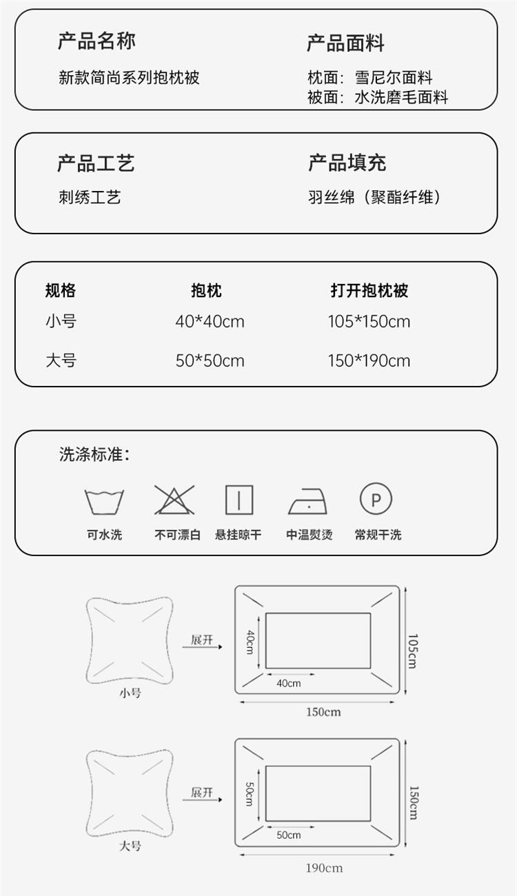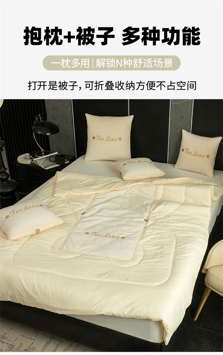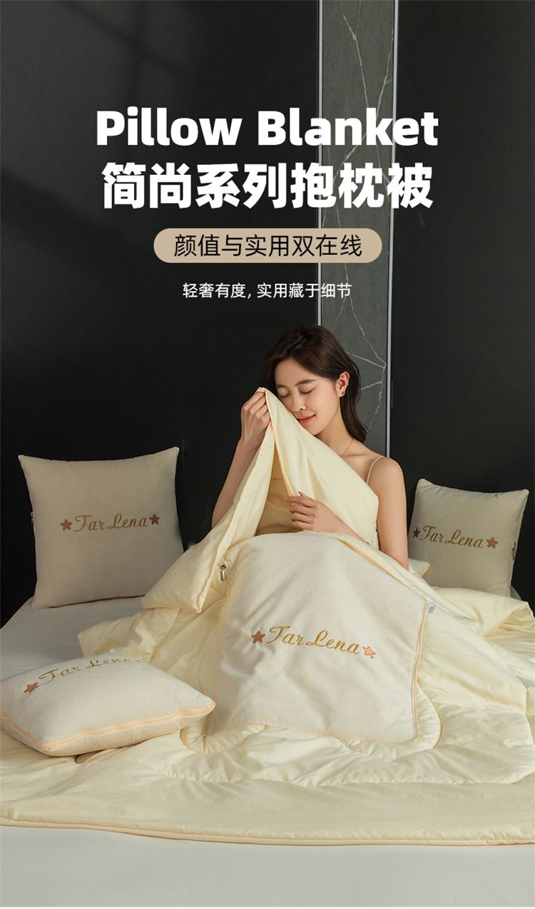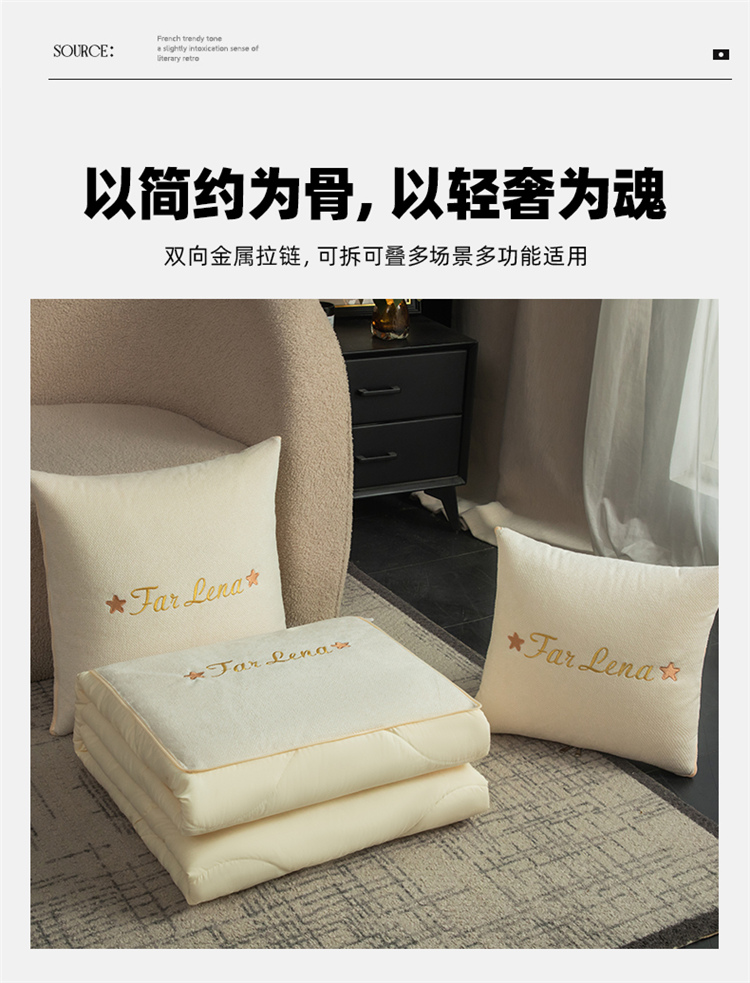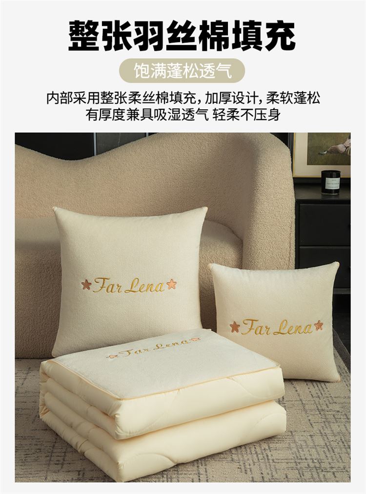 本品采用活力优质雪尼尔面料+高密度水洗磨毛面料制作而成 !独特的Far Lena 精品刺绣工艺,彰显品质|颜值与实用双在线! 一枕多用,场景全覆盖 抱枕+被子二合一,隐藏拉链设计,秒变舒适小被子。 午休盖腿、靠腰护颈,告别空调冷意。沙发追剧、床头靠卧,柔软包裹感拉满。车载应急、差旅便携,折叠后小巧不占空间。 一个顶俩,性价比超高,解决多场景需求! 表面面料:雪尼尔 被子面料:水洗磨毛 尺寸:40*40cm 打开105*150cm