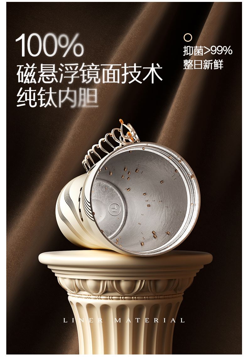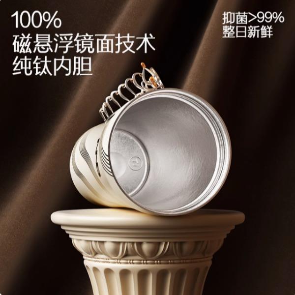 容量:410ml 带吸管内外纯钛双饮咖啡杯 中欧科技艺术融合 抑制细菌、磁悬镜面工艺技术、艺术设计 全球「磁悬镜面工艺」(0.02μm) 发明号CN202510262880.8 我们承诺:坚决不用通过强酸化学反应工艺加工钛杯。