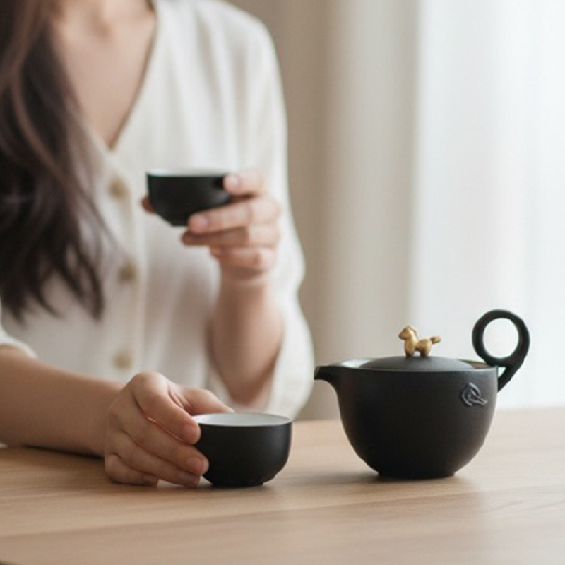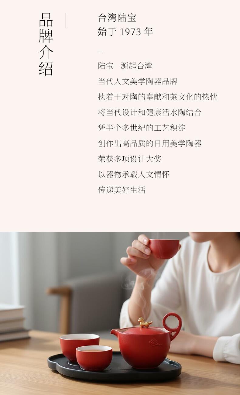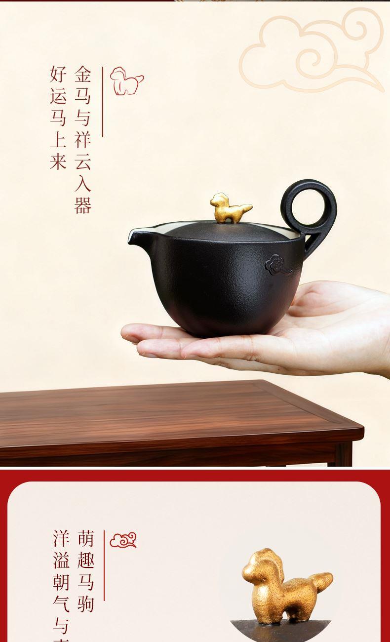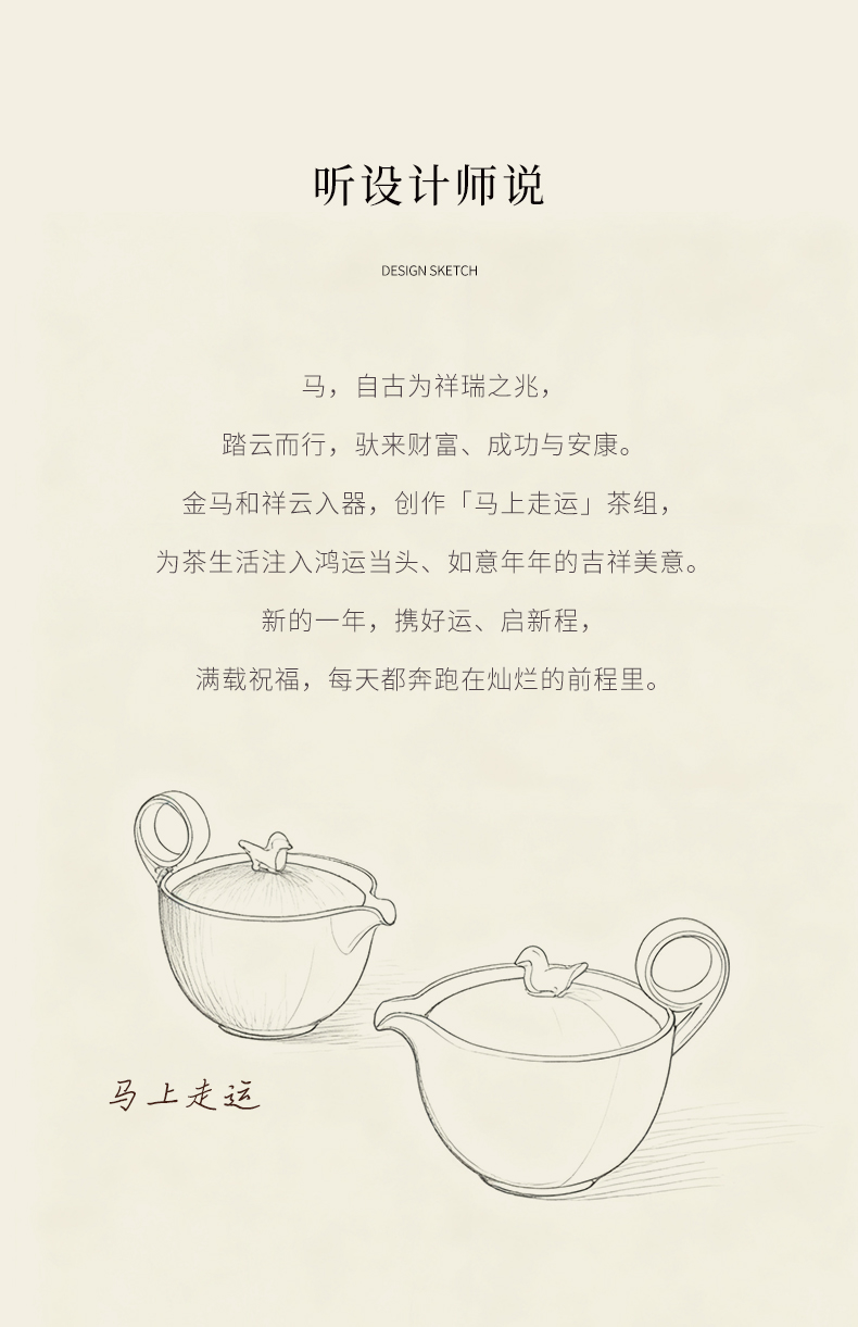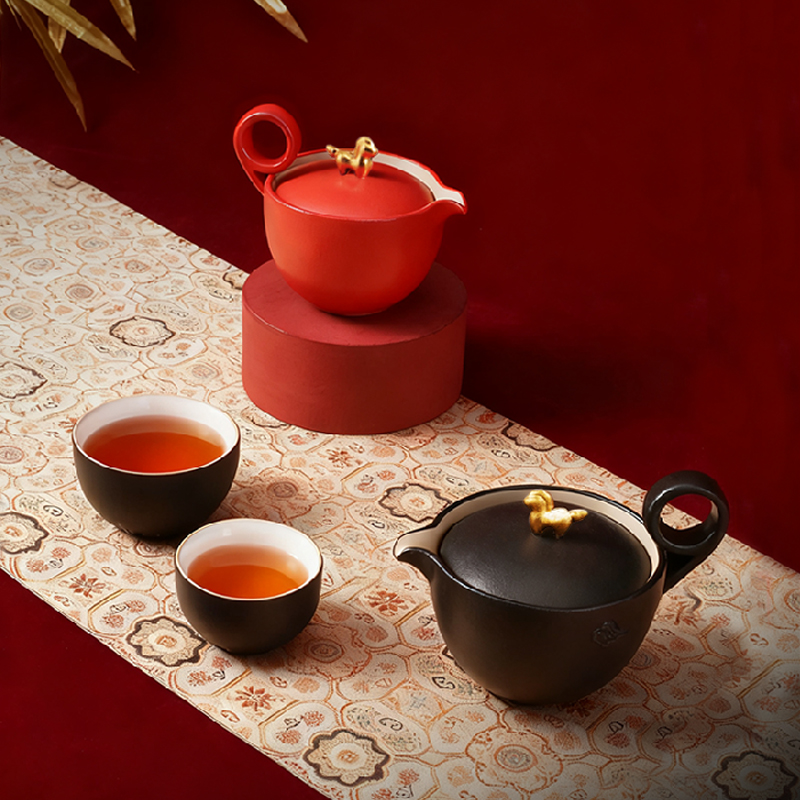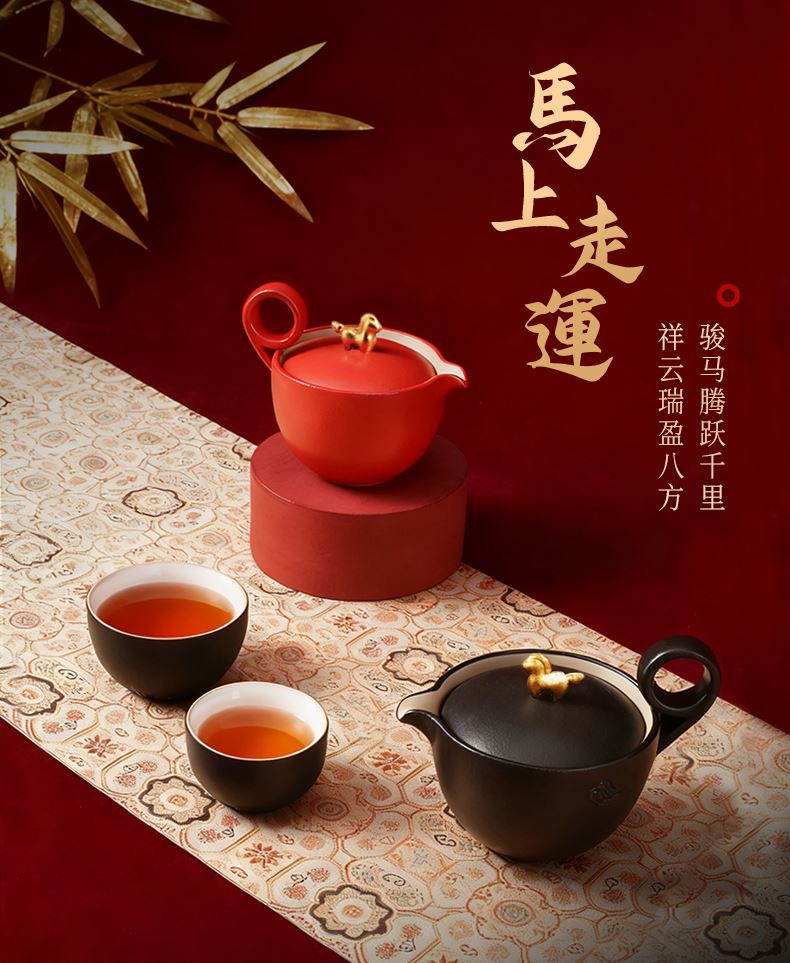 以金马和祥云入器,创作「马上走运」茶组,为茶生活注入鸿运当头、如意年年的吉祥美意。萌趣马驹立于茶器上,彷佛自茶香中跃出,洋溢蓬勃朝气与无限喜悦。细致雕琢的祥云纹,喻示好运马上来、福气马上到。大小双杯,巧妙套叠于壶中,寓意圆满叠至、福气相随。