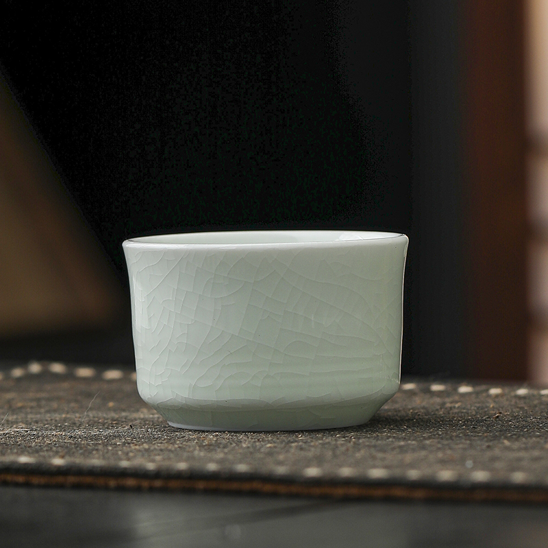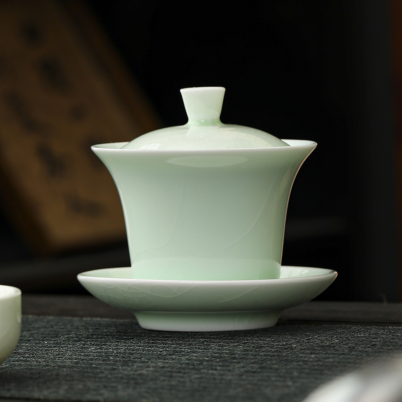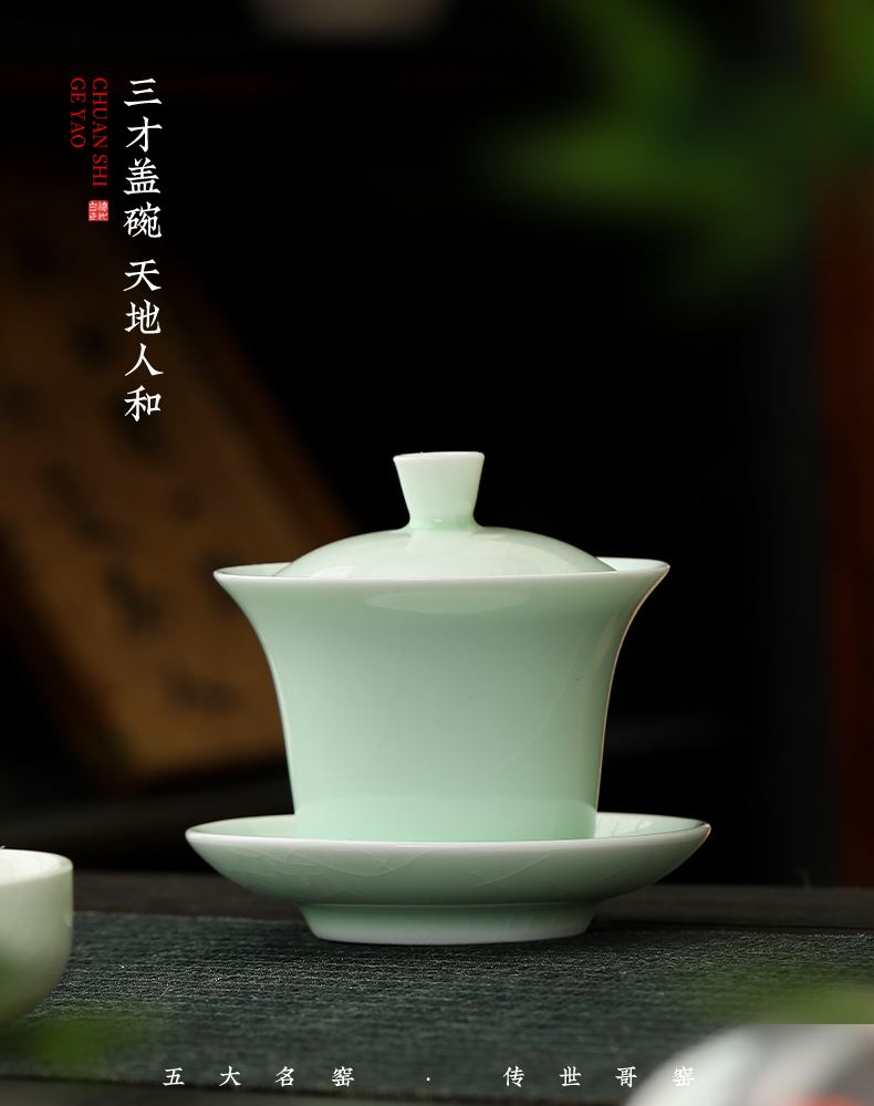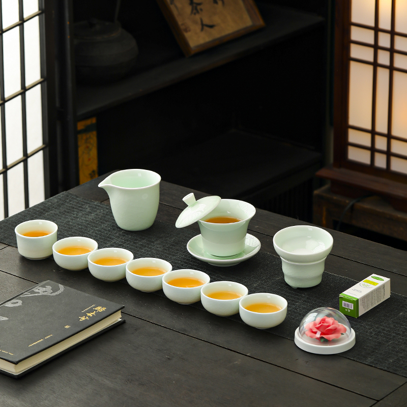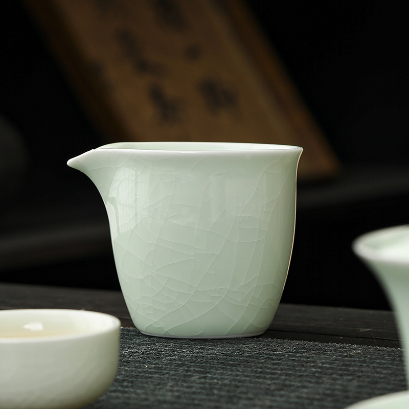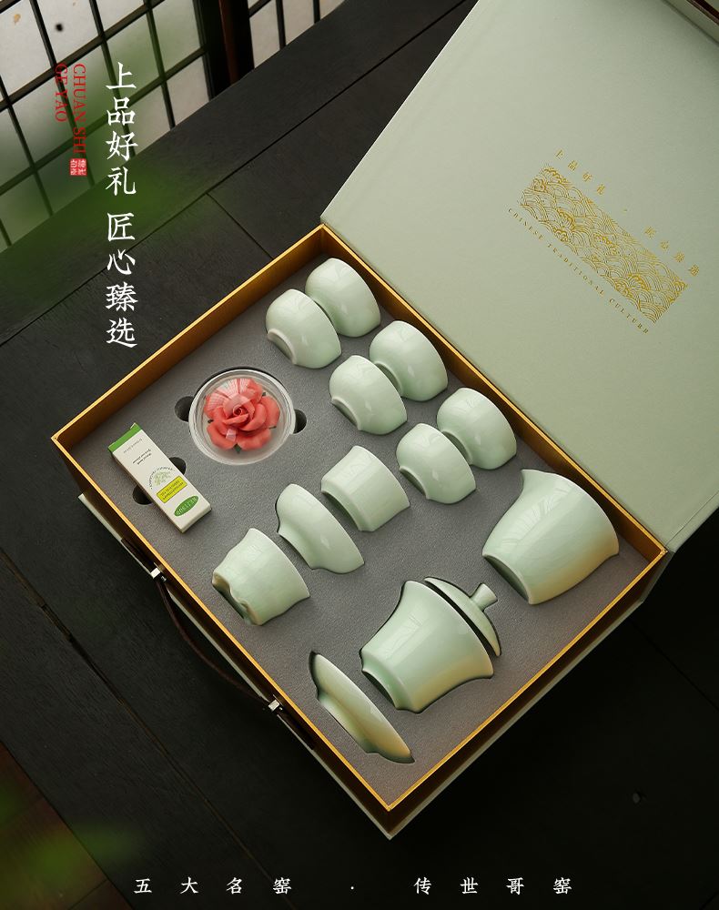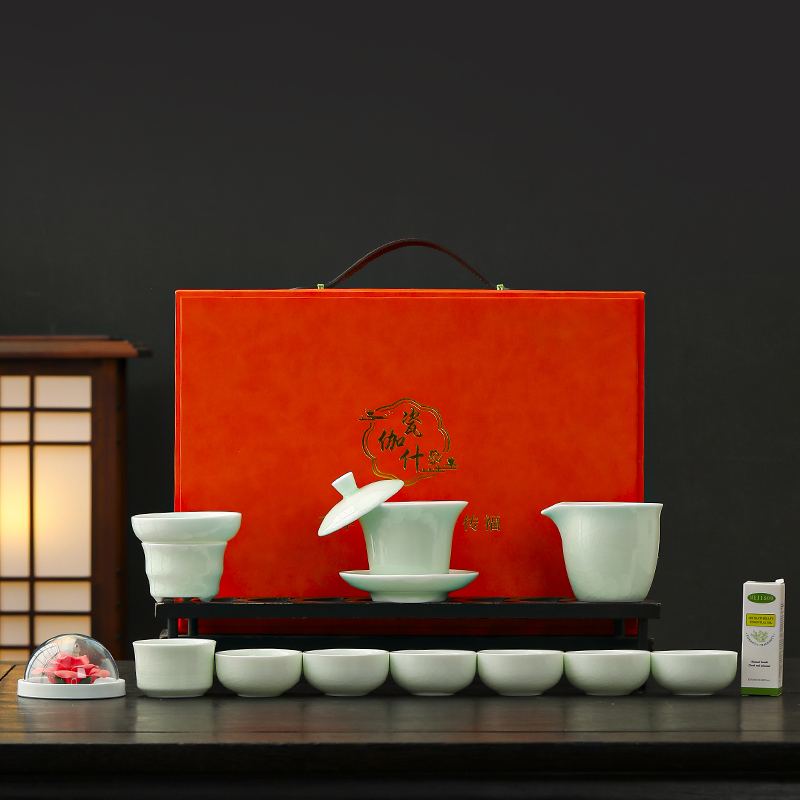盖碗1:9cm*9.5cm 容量:160ml 茶海1:9.1cm*7.2cm 容量:195ml 主人杯1:6cm*3.9cm 容量:65ml 客杯6:6.2*3 容量:50ml 过滤组1:8.1cm*6.3cm 非遗手捏瓷花1:7.8cm *4.5cm 精油1:2.7cm*8.1cm容量:10ml 原矿瓷土,高温烧制,瓷化程度好,声音清脆,吸水率小 选用高纯结晶密度的青釉,瓷面强度高,美观坚固耐用。 诗意开片蝉翼纹理,可观可养,雅致美观。 非遗手捏瓷花栩栩如生,搭配香熏精油,兼具观赏性及实用性。