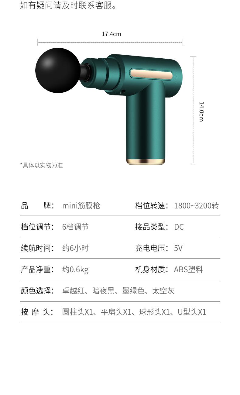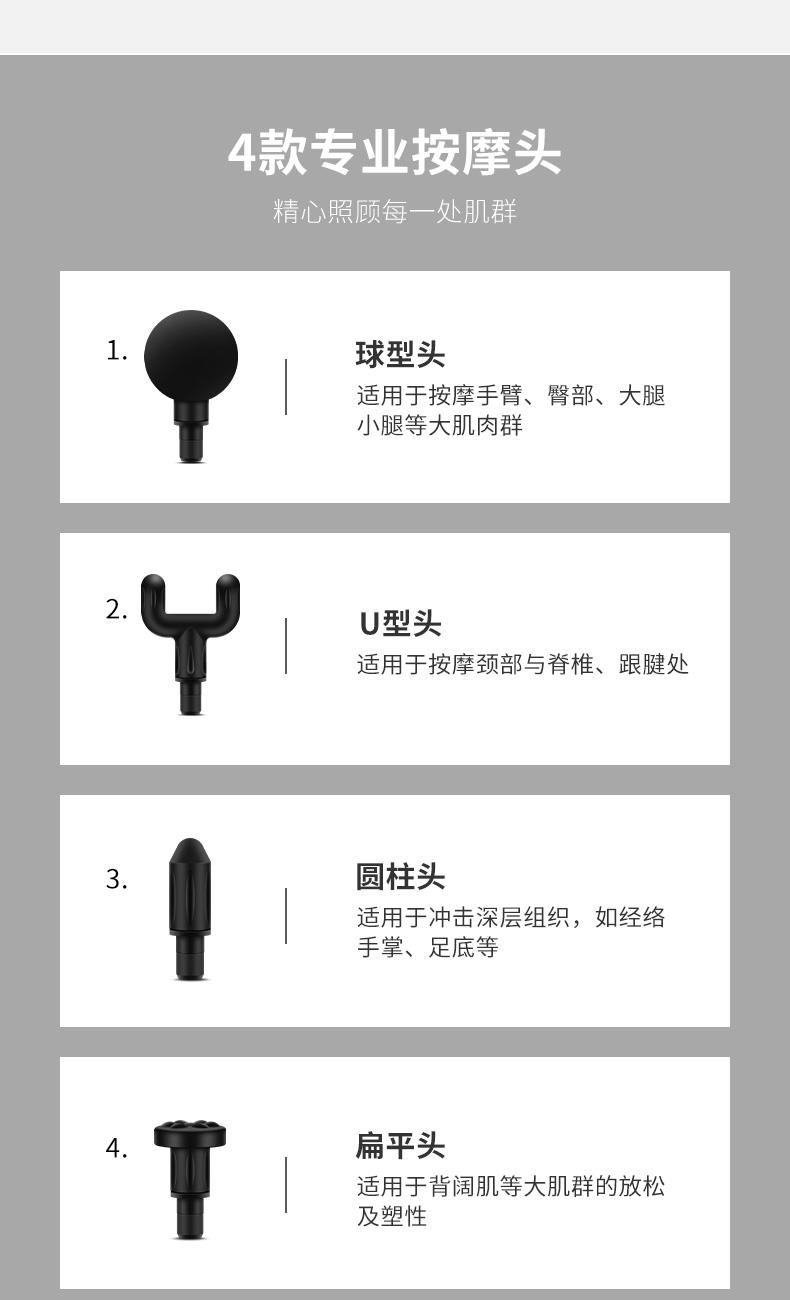 型号:WD-A11 材质:机身ABS 电压:5V 转速:1800-3200转 电池:1800mha 净重:0.6kg 升级版锂电池安全节能充电更快 一键掌控,6档科学频率真调整 进口智能芯片,静音电机 四种专业按摩头,升级铝头连接 小巧玲携带轻便