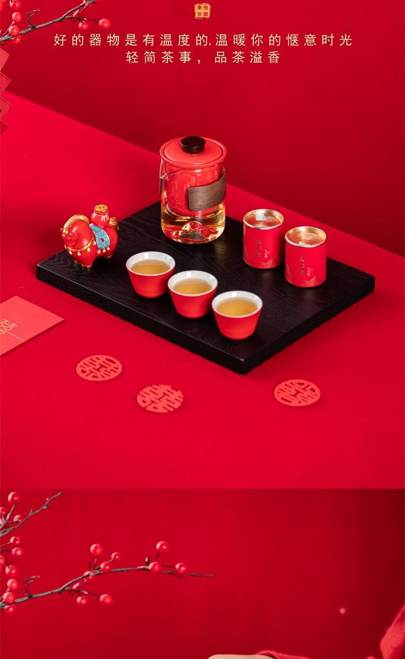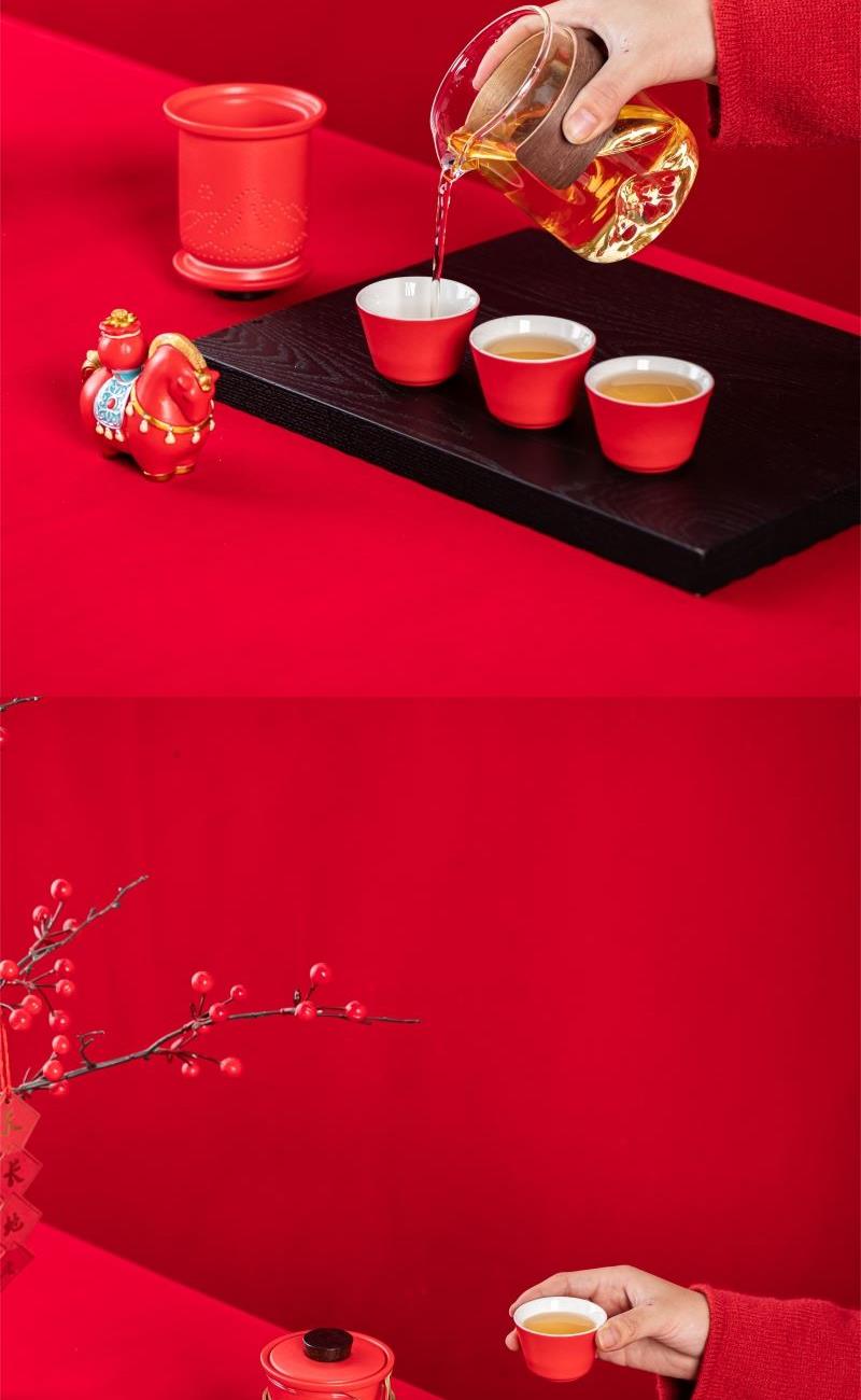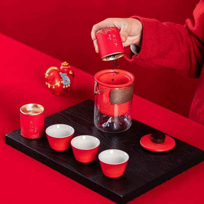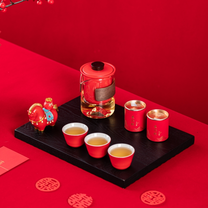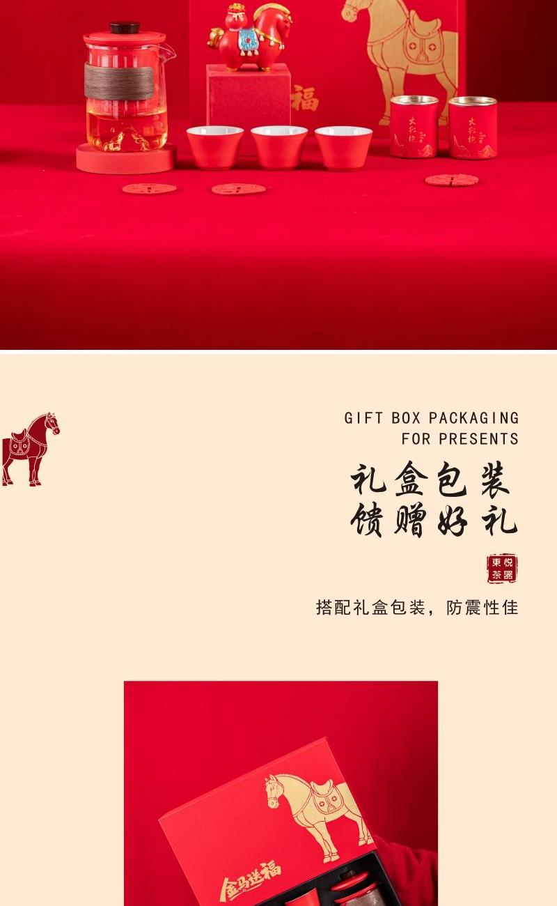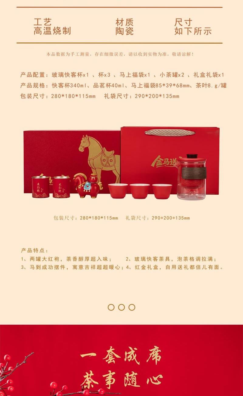 产品型号:JMSF-007 产品材质:陶瓷+玻璃+树脂 产品颜色:红色 产品配置:玻璃快客杯x1 、杯x3 、马上福袋x1 、小茶罐x2 、礼盒礼袋x1 产品规格:快客杯340ml、品茗杯40ml、马上福袋85*39*68mm、茶叶8.g/罐 产品毛重:1.40kg 包装数量:20套 包装尺寸:280*180*115mm 外箱尺寸:58*38*61cm 产品特点: 1、两罐大红袍,茶香醇厚超入味; 2、玻璃快客茶具,泡茶格调拉满; 3、马到成功摆件,寓意吉祥超超暖心; 4、红金礼盒,自用送礼都倍儿有面。