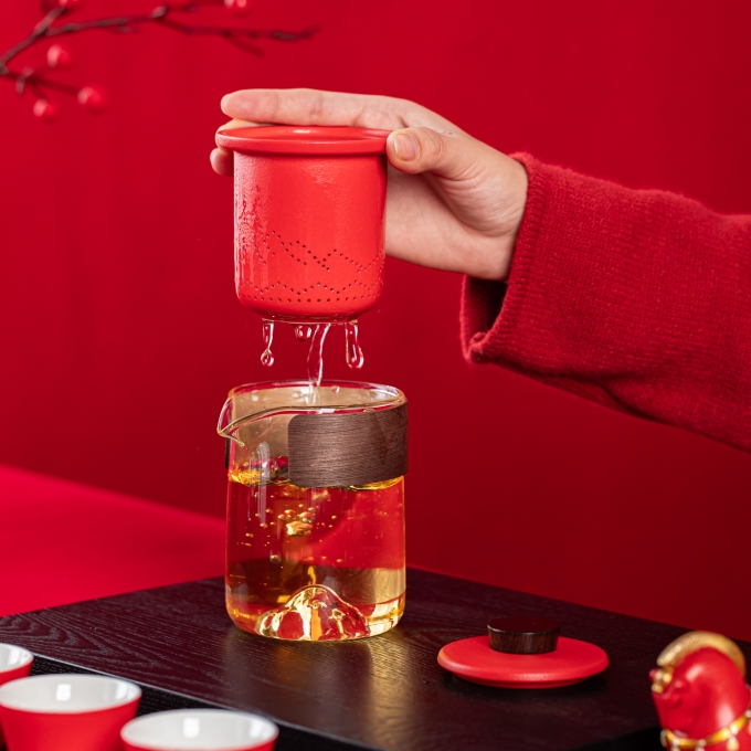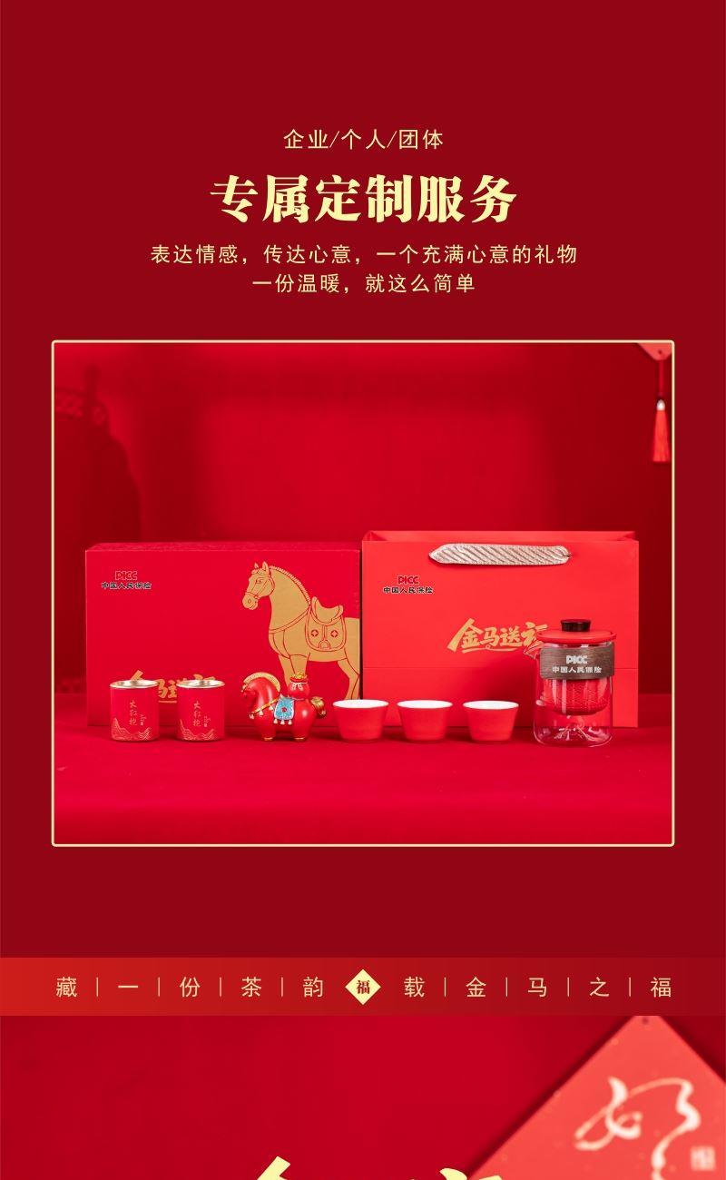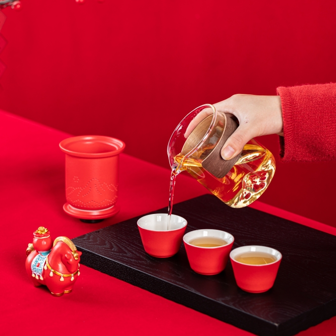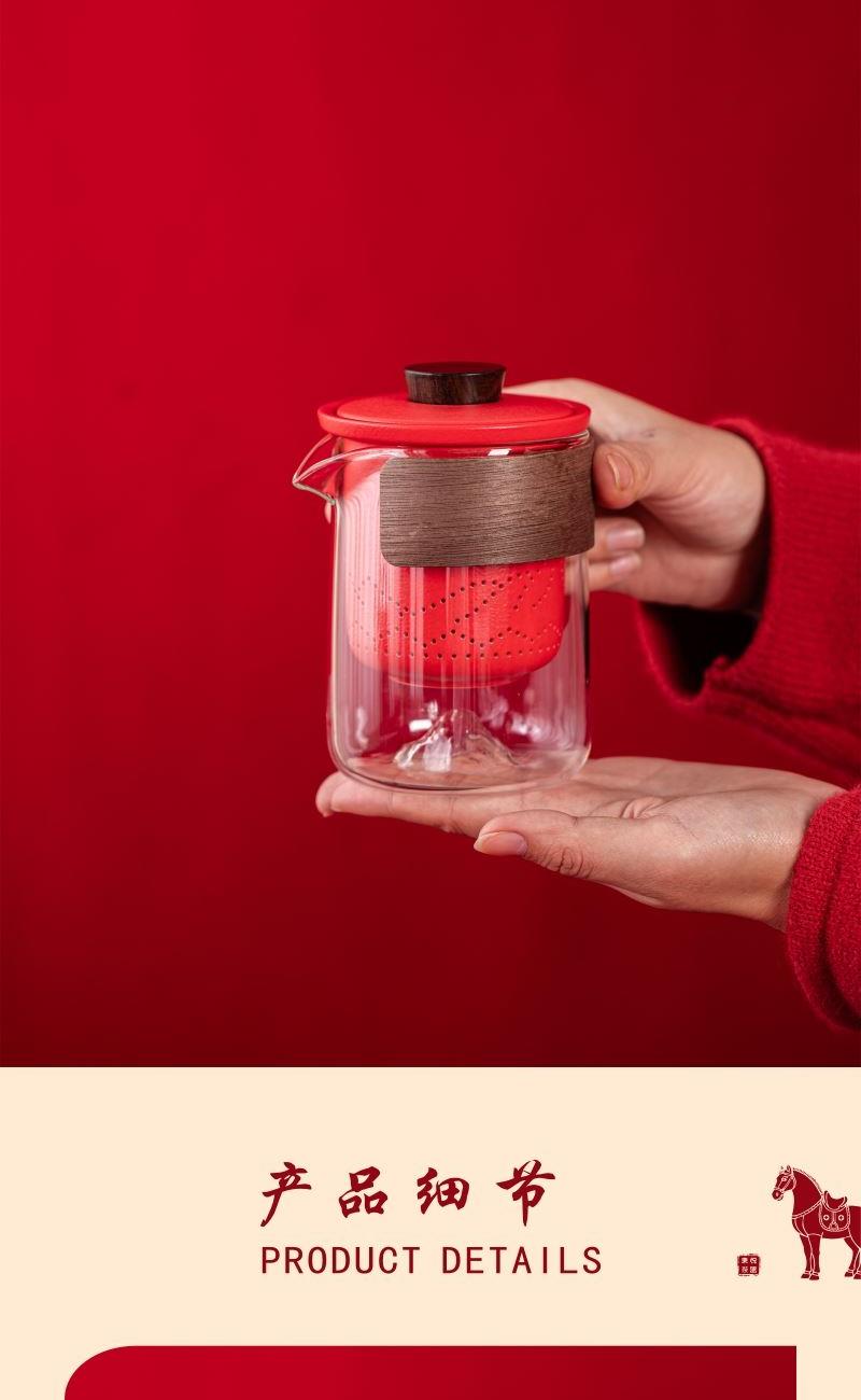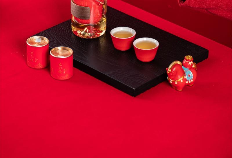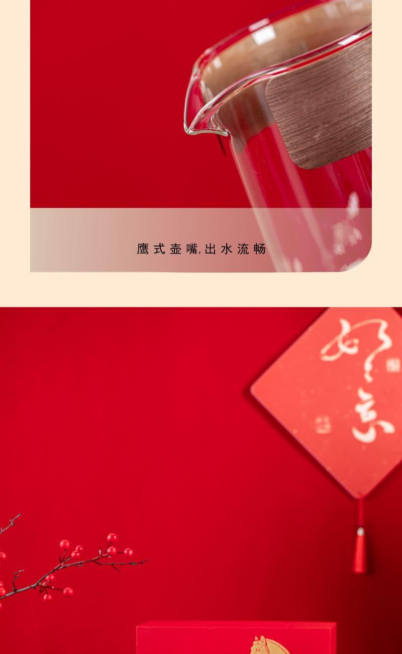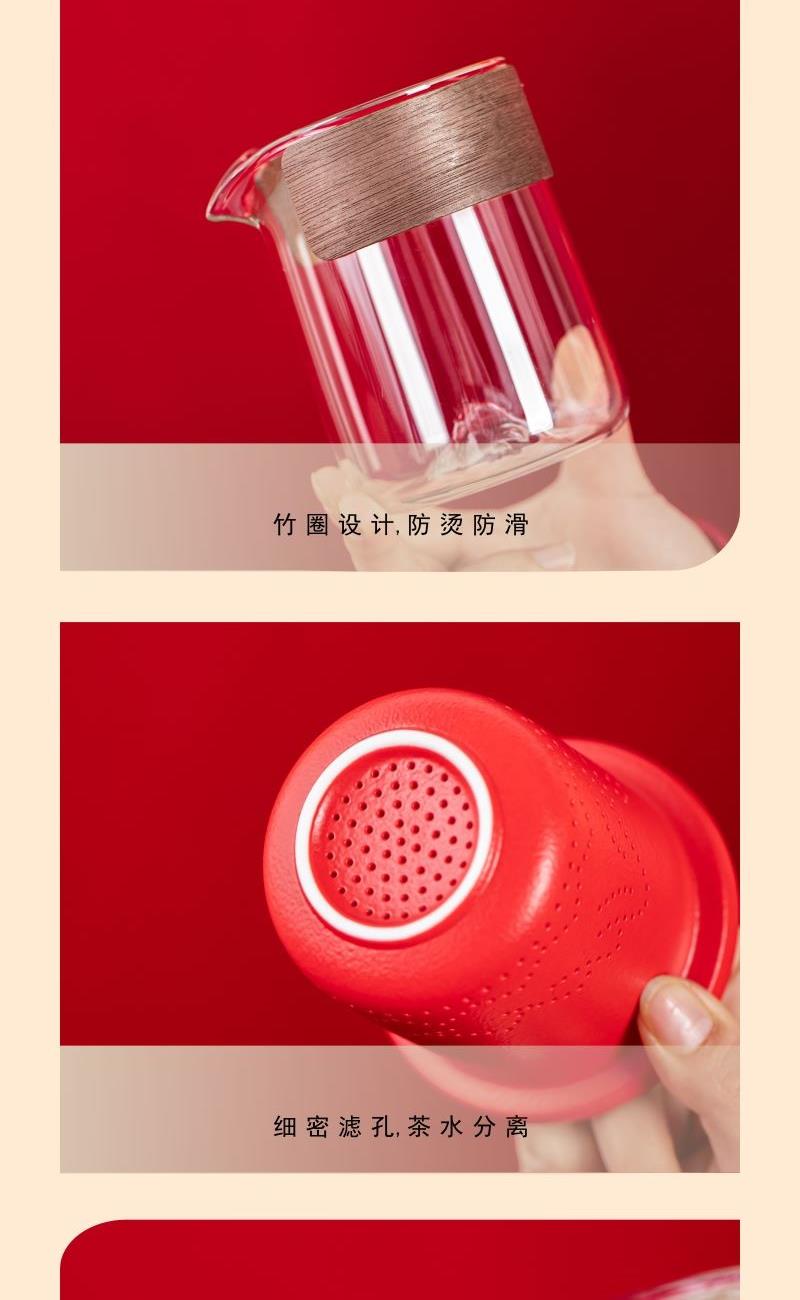 产品型号:JMSF-007 产品材质:陶瓷+玻璃+树脂 产品颜色:红色 产品配置:玻璃快客杯x1 、杯x3 、马上福袋x1 、小茶罐x2 、礼盒礼袋x1 产品规格:快客杯340ml、品茗杯40ml、马上福袋85*39*68mm、茶叶8.g/罐 产品毛重:1.40kg 包装数量:20套 包装尺寸:280*180*115mm 外箱尺寸:58*38*61cm 产品特点: 1、两罐大红袍,茶香醇厚超入味; 2、玻璃快客茶具,泡茶格调拉满; 3、马到成功摆件,寓意吉祥超超暖心; 4、红金礼盒,自用送礼都倍儿有面。