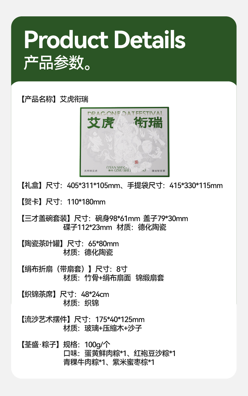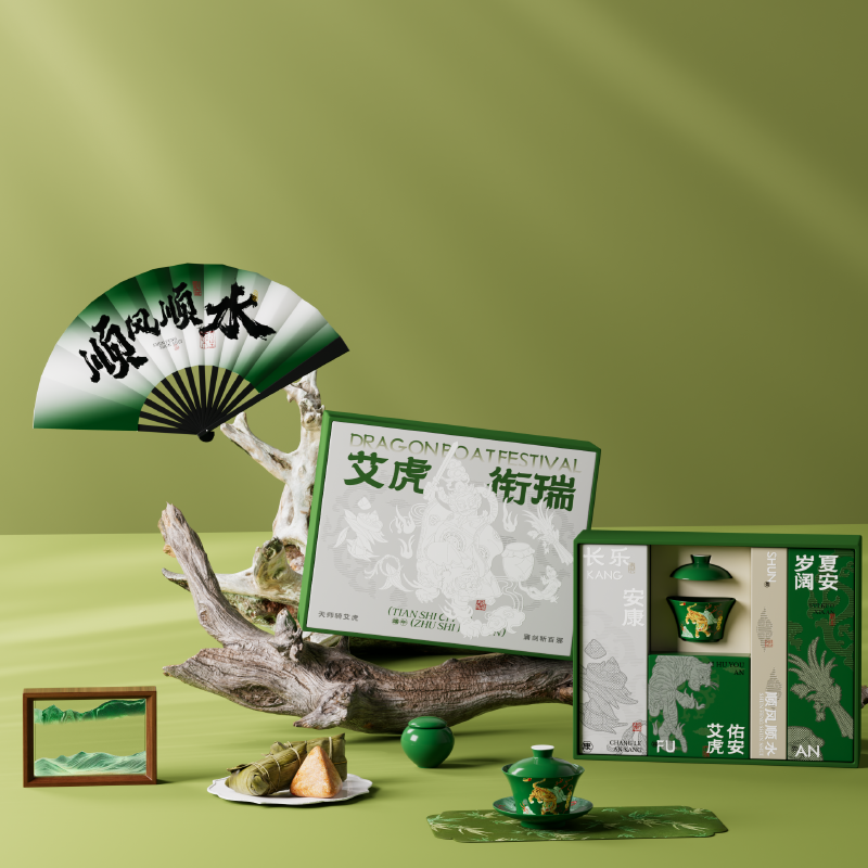 五月五日午,天师骑艾虎 千年端午习俗中,艾虎乃驱邪镇祟之神兽 古时百姓以艾草扎虎、剪纸为形,悬于门楣 祈愿"艾虎镇五毒,百病不侵身" 本礼盒以"艾虎衔瑞"为题,承袭宋代"虎镇五毒"纹样之精髓 融天师骑艾虎之神威,将端午禳灾纳吉的仪式感,凝练为一方雅致器物 寄寓"衔瑞纳福,岁岁安康"之愿 内配: 配置一:礼盒&手袋x1 配置二:荃盛·粽子x4 配置三:福虎下山·三才盖碗套装X1 配置四:陶瓷茶叶罐X1 配置五:绢布折扇(带扇套)X1 配置六:织锦茶席X1 配置七:流沙艺术摆件x1 配置八:贺卡x1