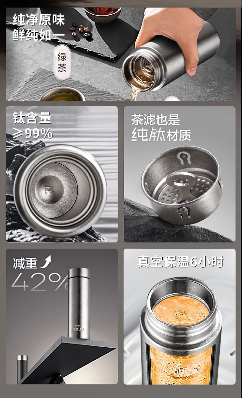 内外纯钛,抗酸抗碱健康饮水, 保鲜,给您更健康的饮水12H保温保冷,双层真空锁温,畅饮每一天 杯盖款式:旋盖(纯钛茶漏) 壶身工艺:亮面冰花结晶 产品尺寸:65*218mm 产品容量:480ml 产品尺寸:65*218mm 彩盒尺寸:70*70*230mm 礼袋尺寸:250*80*150mm