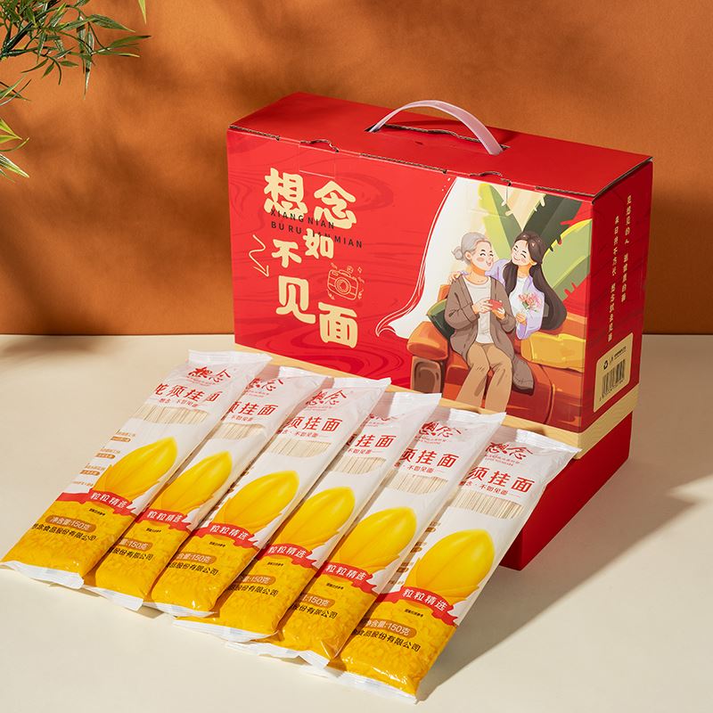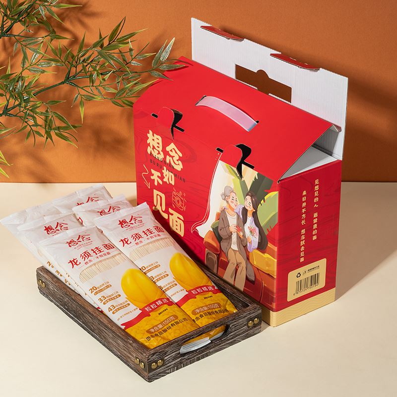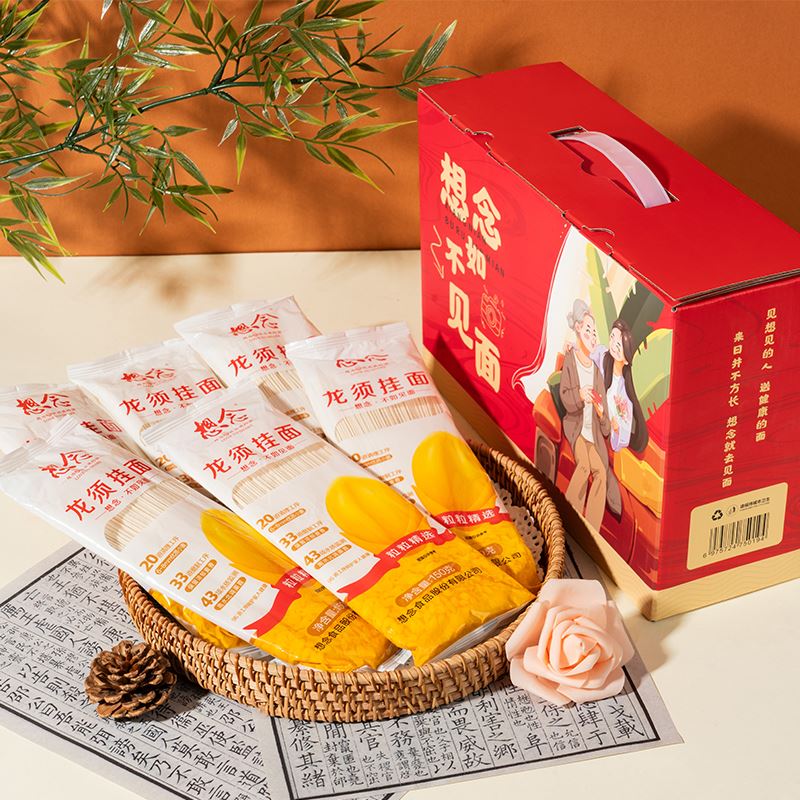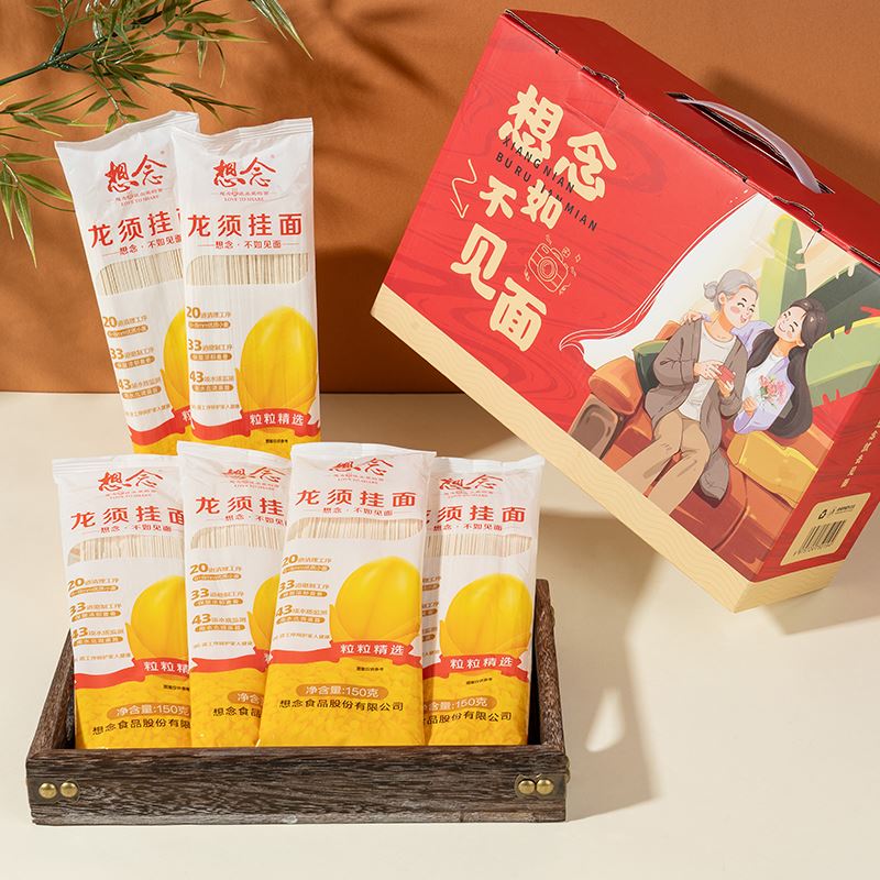 产品主题:见想见的人 送温暖的面 礼盒规格:300*200*100mm 产品配置:想念龙须挂面150g*6包 产品卖点: 1、面条是中国传统美食,家家必备,人人喜欢,送礼寓意长寿、健康。 2、“想念不如见面,面条就食想念”。 3、想念面以面条筋道、口感顺滑、麦香浓郁著称,真麦香,家的味道。 4、礼盒内装150g想念龙须面6包,小包独立包装,更适合当代家庭。 5、精美瓦楞礼盒,想念不如见面,主题好。