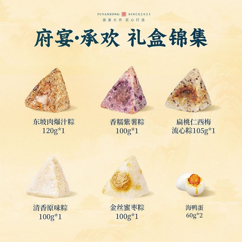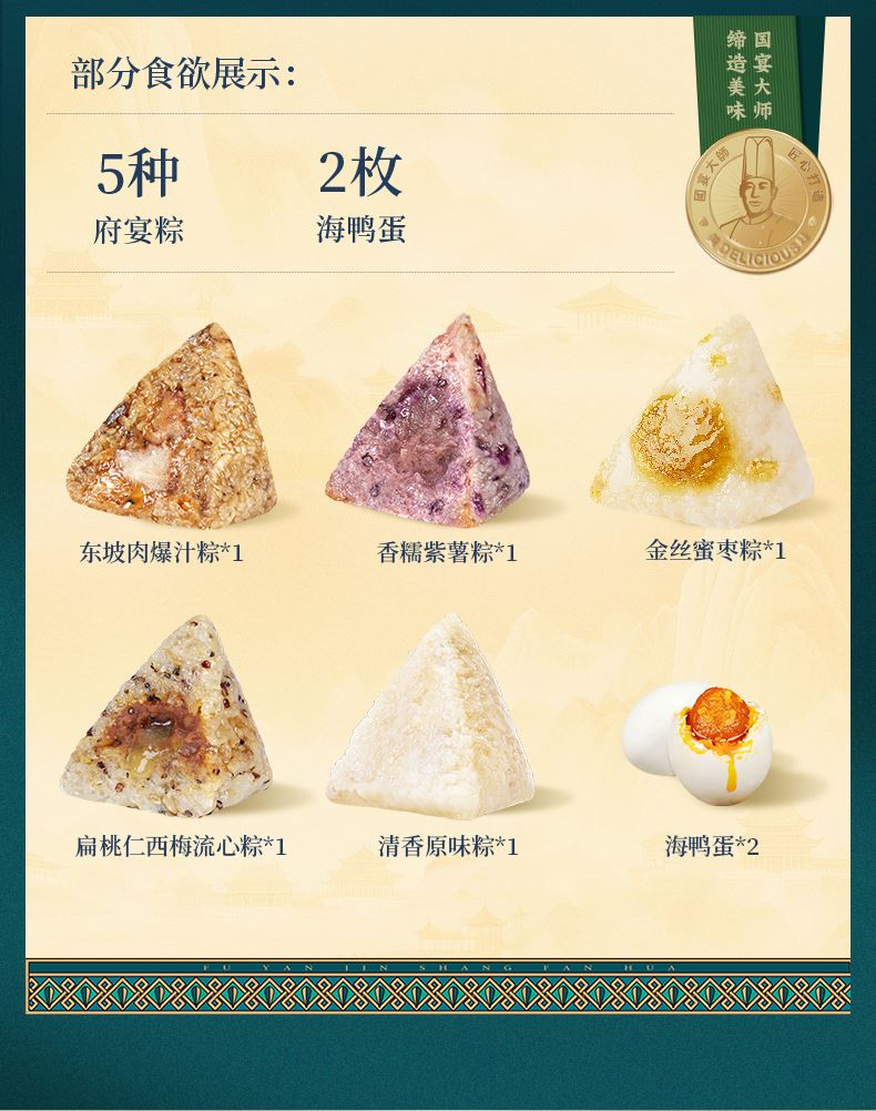 120g东坡肉爆汁粽*1 105g扁桃仁西梅流心粽*1 100g香糯紫薯粽*1 100g金丝蜜枣粽*1 100g清香原味粽*1 60g海鸭蛋*2
