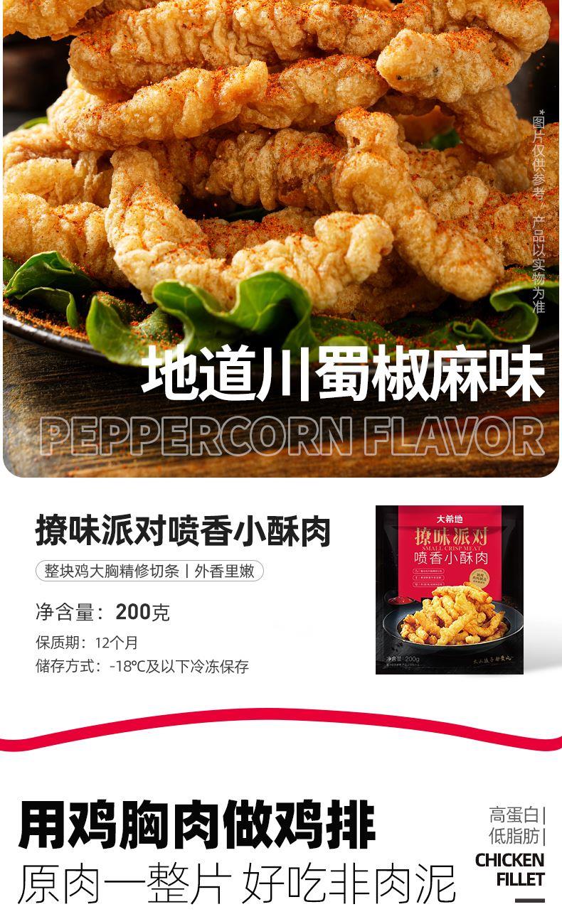 产品参数配置​ 香草黑胡椒草饲西冷牛排:130g,贴肤装。​ 爆有料经典原味 80 醇肉肠:508g,袋装。​ 撩味派对喷香小酥肉:200g。​ 忘不了大鸡排:135g,袋装。​ 大一统整切菲力牛排:单份 130g,2 片袋装,。​ 2. 产品卖点说明​ 撩味派对喷香小酥肉主打 “喷香” 口感,名字中的 “撩味派对” 传递出适合聚会、休闲场景的属性,规格便于控制食用量。​袋装设计,便于储存和取用,作为常见食材,口感鲜嫩,适合快速烹饪,满足休闲小吃或餐食搭配需求。​