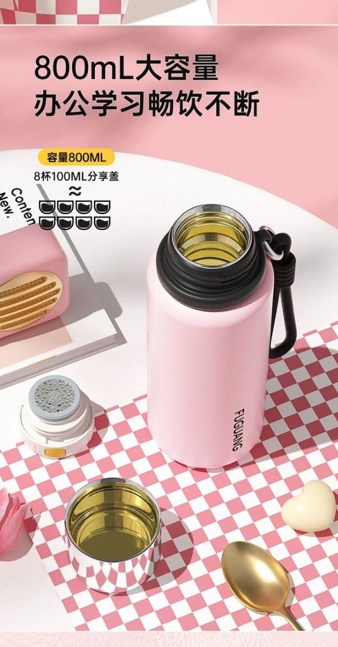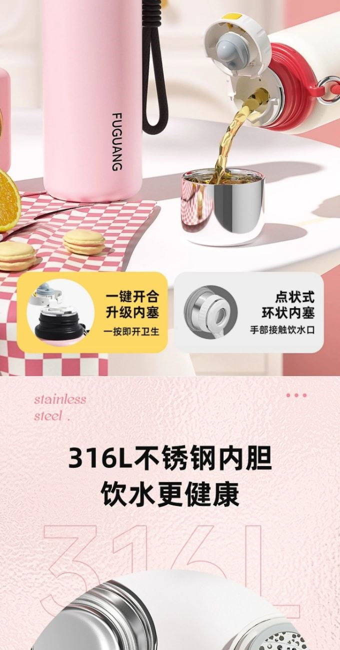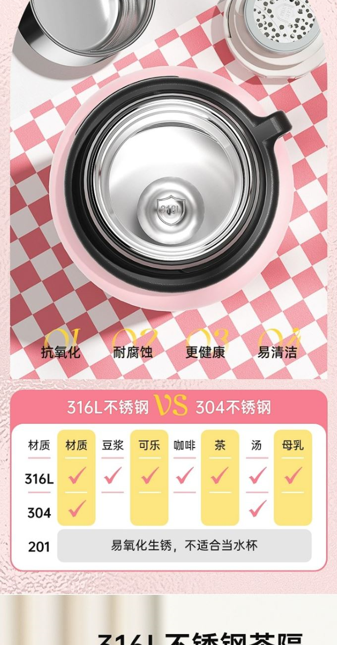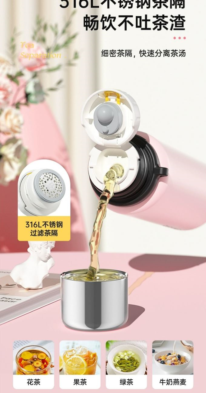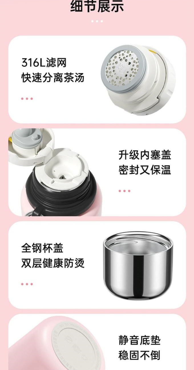 尺寸:82*220mm 颜色:酷黑绿 甜酷粉 栀子白 材质:316L奥氏体不锈钢内胆、食品级PP,PC配件。 316L不锈钢滤网快速分离茶汤。全钢杯盖双层健康防烫。 静音底垫稳固不到。 精致便携提绳,出行方便,舒适不勒手。 包装:单瓦盒
