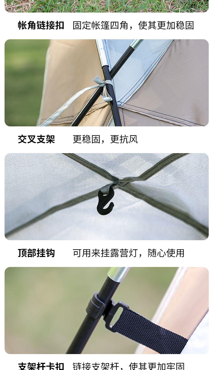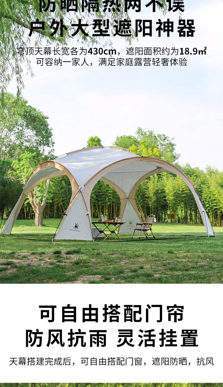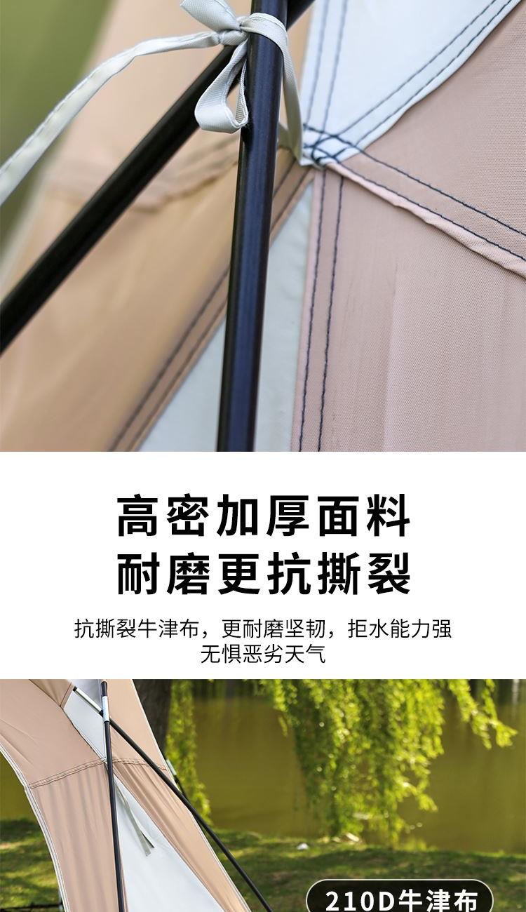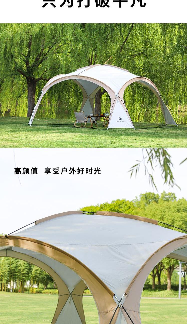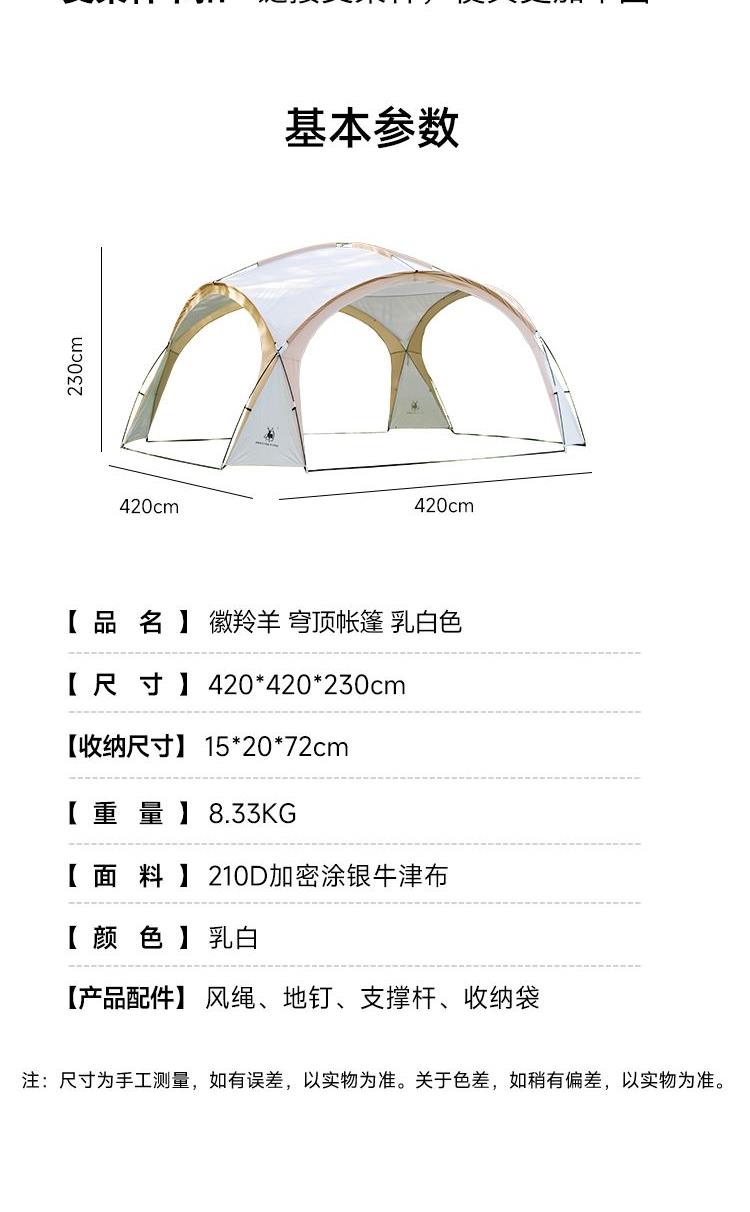 展开尺寸:420*420*230cm 收纳尺寸:15*20*72cm 重量:约8.33KG 颜色:米乳白色 材质:支架材质:玻璃纤维;帐底材质:牛津布 外帐材质:防水涤塔夫涂银布 防水:1000(含)-1500mm(含) 帐底2000(含)-3000mm(含) 结构:四面门庭 涂银遮阳防晒;UPF50+高倍防护,无惧紫外线 防雨材质,涤纶面料 天幕进阶版,全面防晒,如客厅;