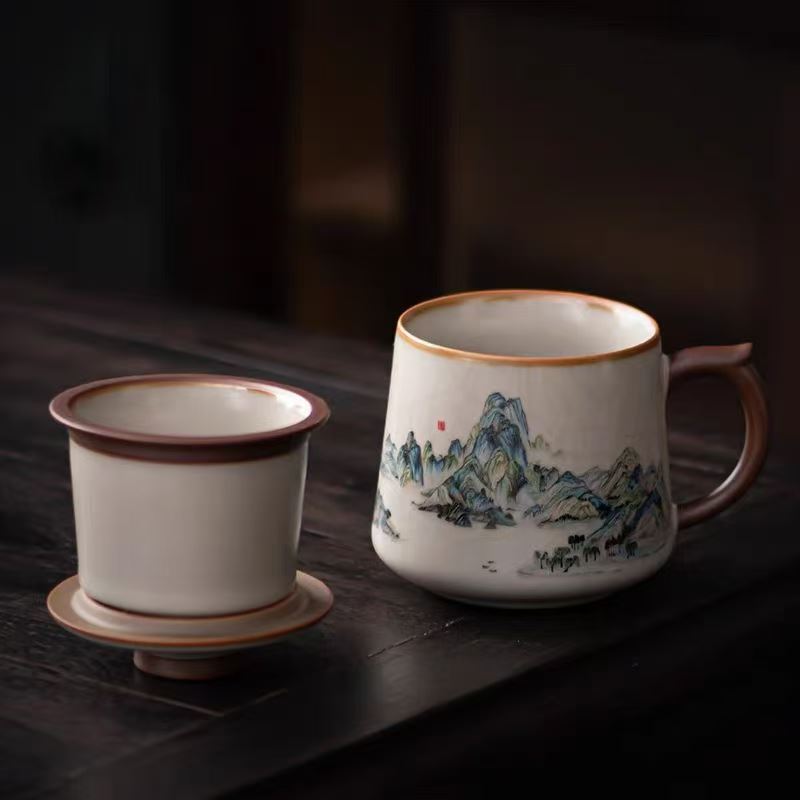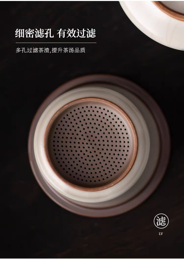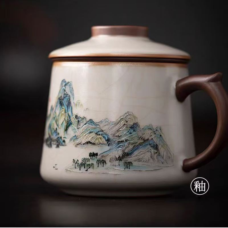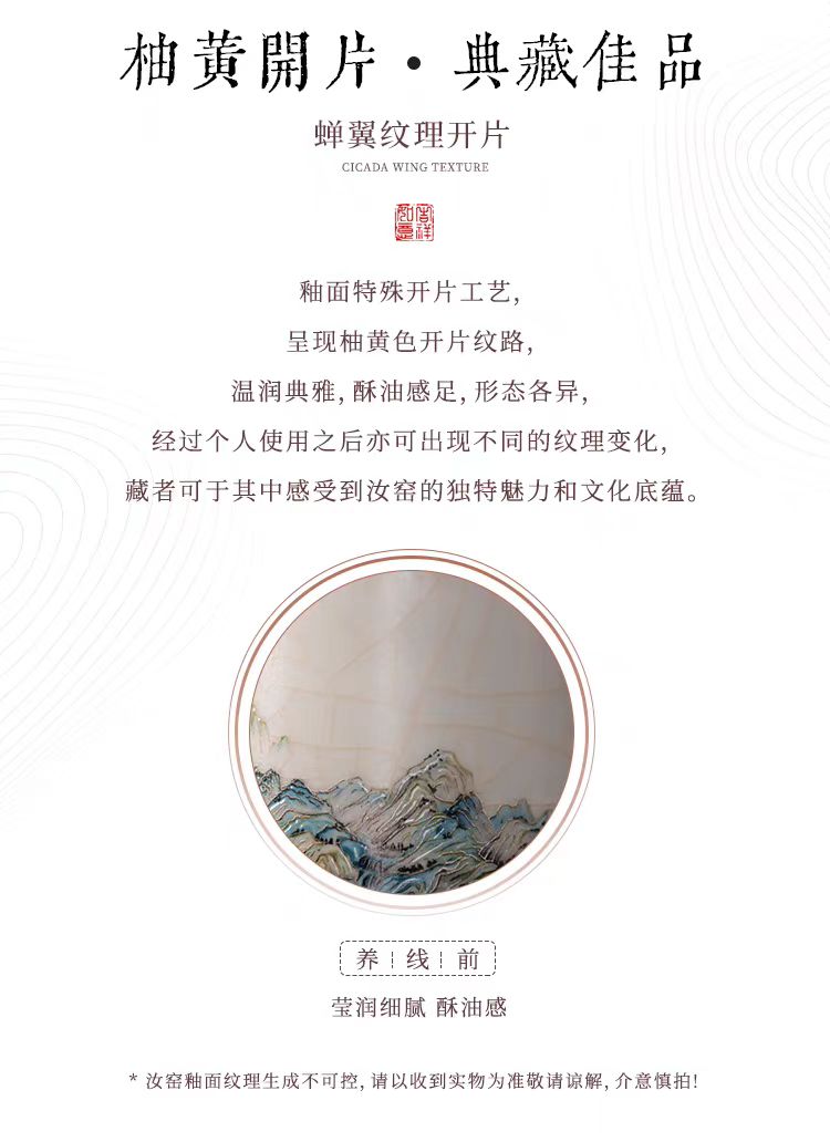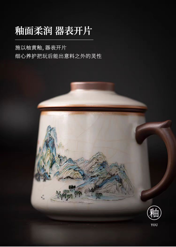 配 制: 1杯 1盖 1茶漏 1碟 1皮盒 材质:汝黄瓷 规格:11.8*13.4cm 容量:500ml 推荐说明:亚黄汝瓷,玛瑙入釉,蝉翼开片。技术新品。画面堆料技术,富有立体浮雕质感,真实感强。杯身开片,可养瓷。