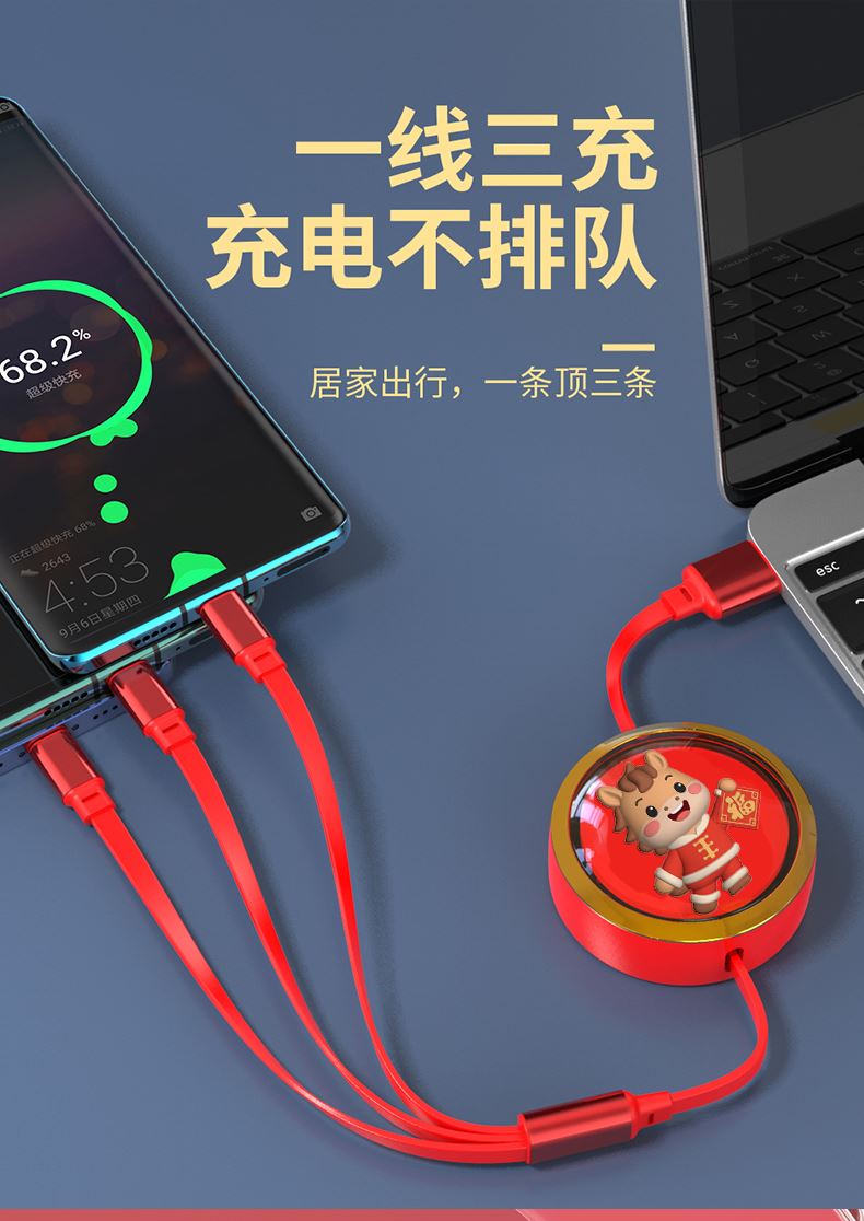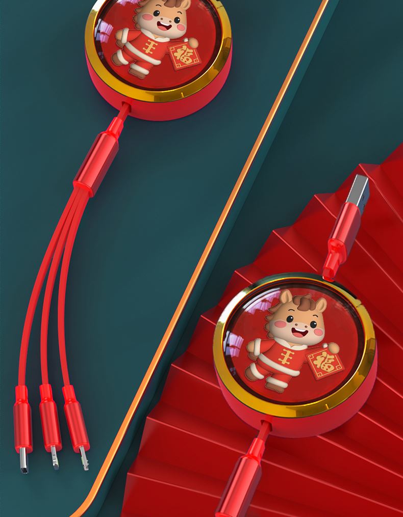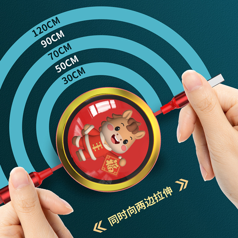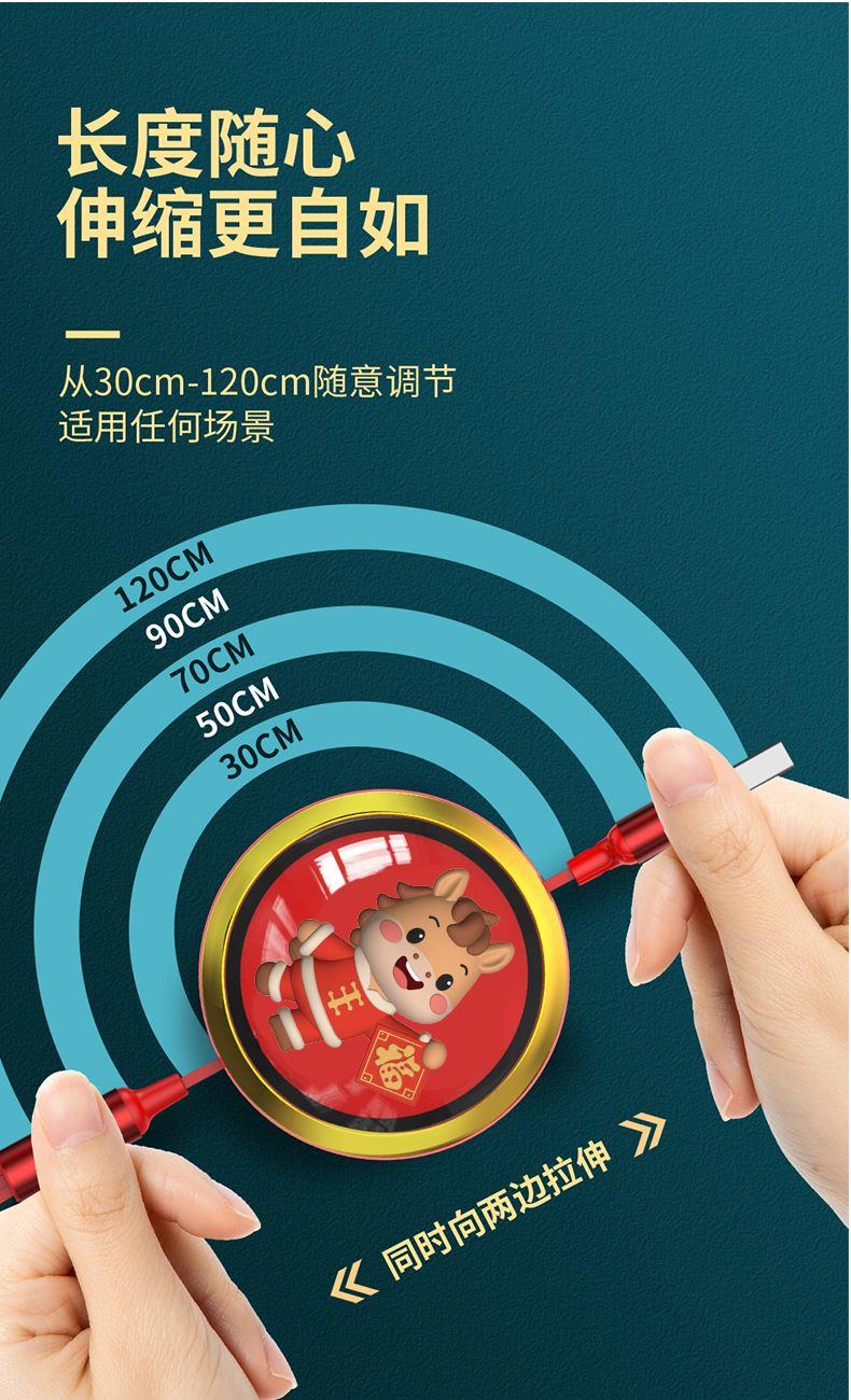 长 度:120cm 材 质:ABS+TPE+铝合金 颜 色:红色 接 口:苹果接口 安卓接口 Type-c接口 输出电流:5A 功 能:数据传输/充电 产品净重:62g 产品特点: 一秒收纳 五档伸缩 小巧便携 方便携带 5A超级快充 充电更快 精美生肖造型 双色可选