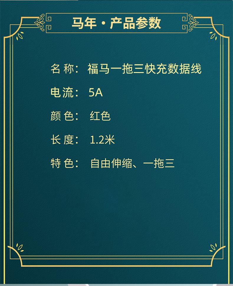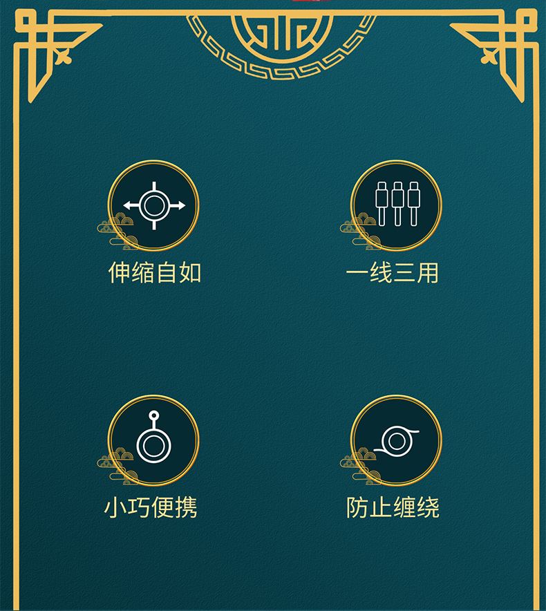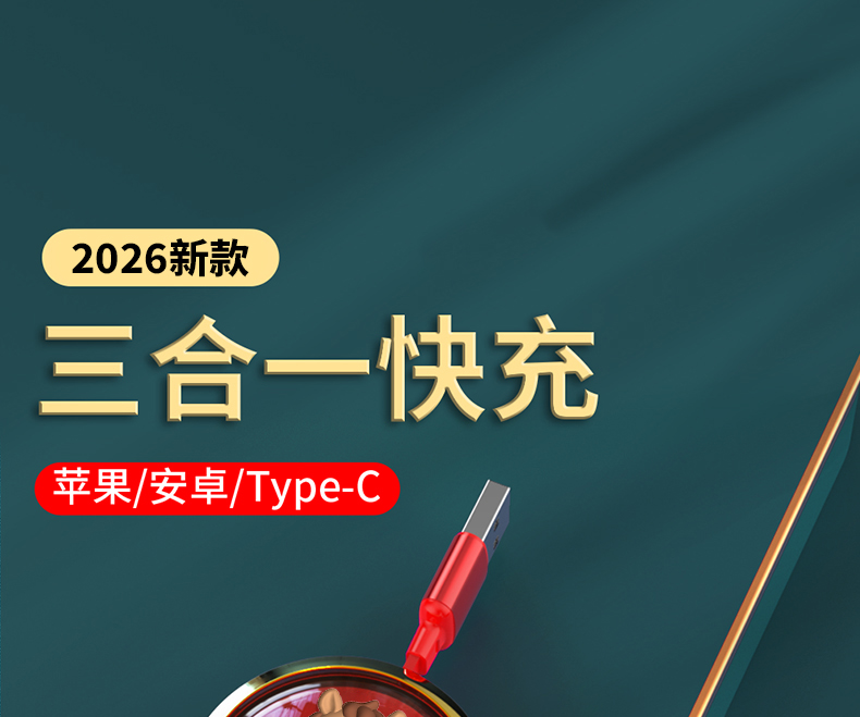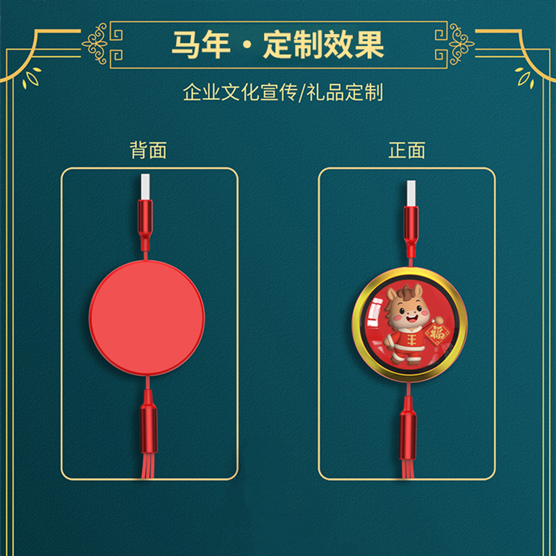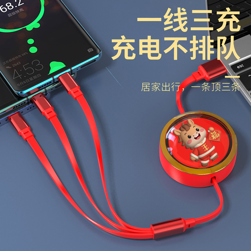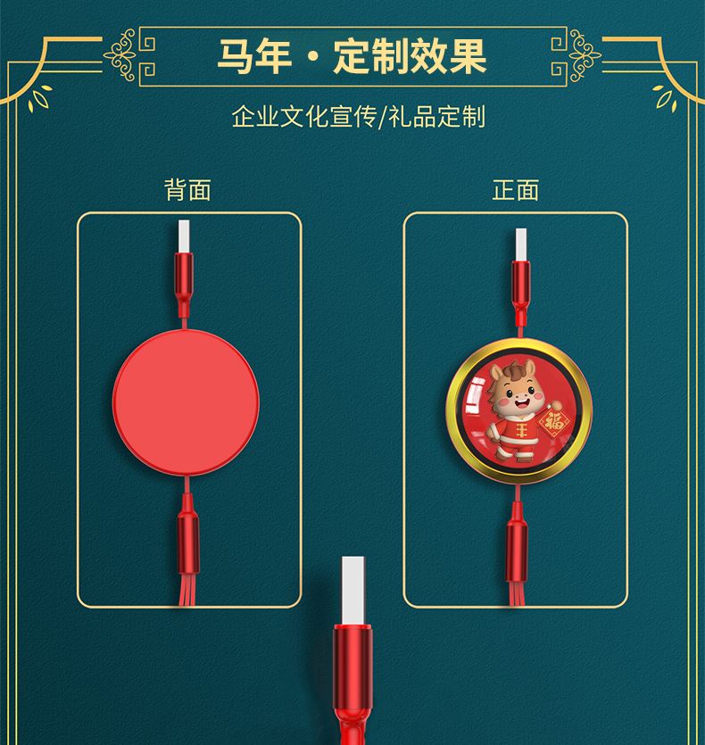 长 度:120cm 材 质:ABS+TPE+铝合金 颜 色:红色 接 口:苹果接口 安卓接口 Type-c接口 输出电流:5A 功 能:数据传输/充电 产品净重:62g 产品特点: 一秒收纳 五档伸缩 小巧便携 方便携带 5A超级快充 充电更快 精美生肖造型 双色可选