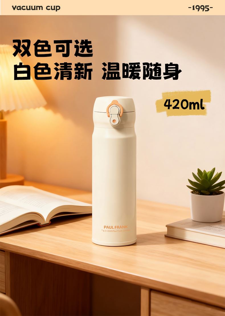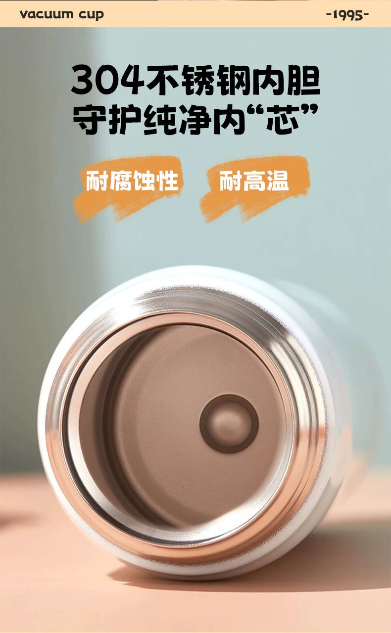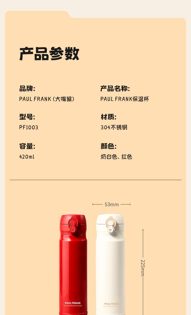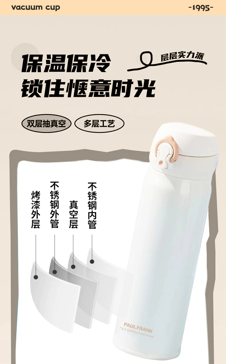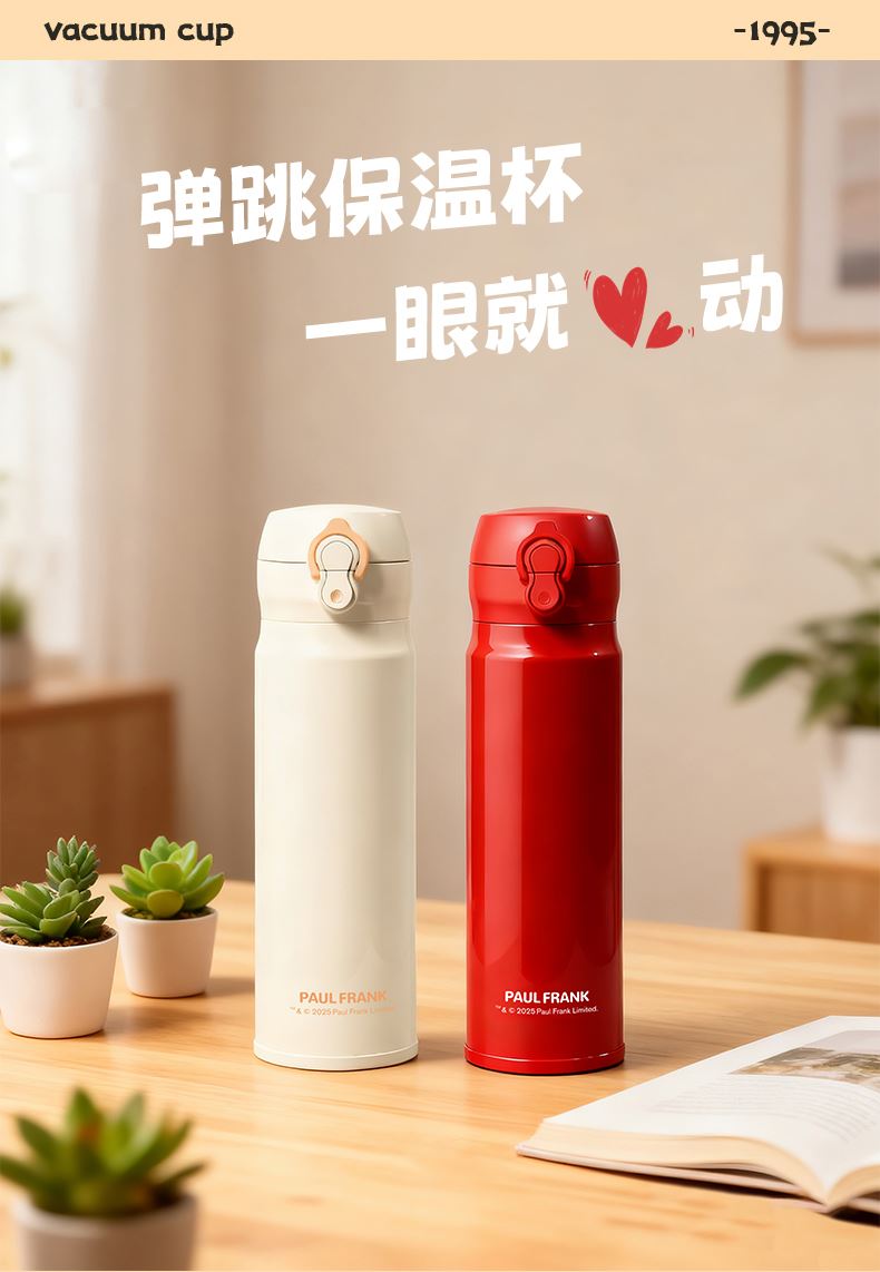 型 号:PF1003 颜 色:奶白色、红色 材 质:304不锈钢 容 量:450ml 69码: 6978198831659 彩盒尺寸:6.9*6.9*23.3 1.食品级304不锈钢内胆,耐腐蚀性更强,易于清洗; 2.6-12小时长效保温,无尾真空工艺; 3.双弹跳设计,直饮/吸管多种饮水方式; 4.双层杯口,触感舒适; 5.杯底硅胶垫设计,静音防滑防磨。