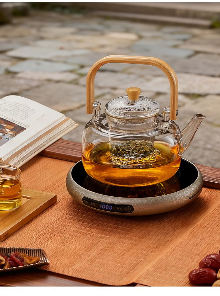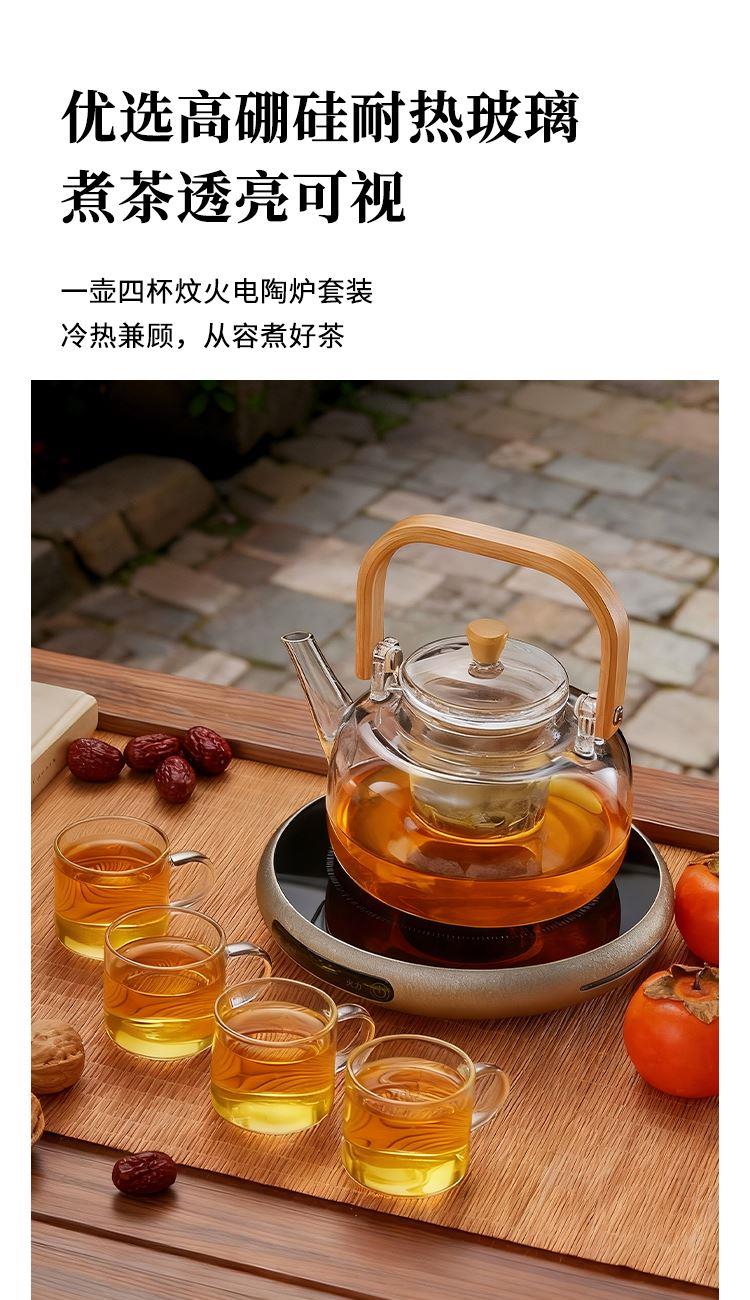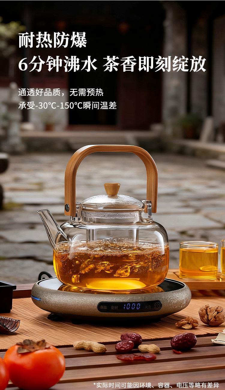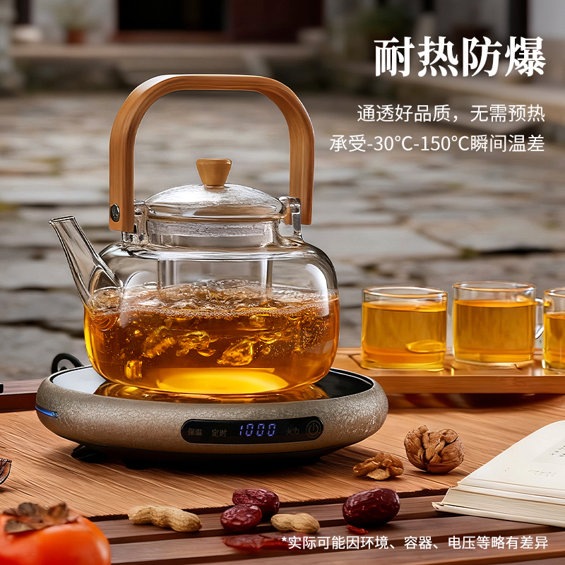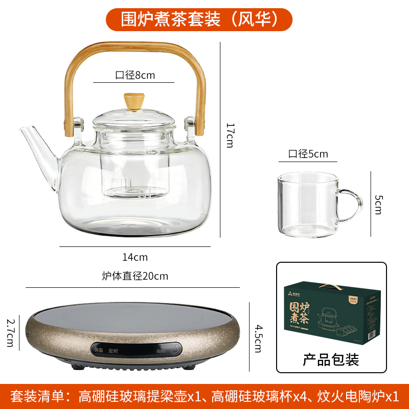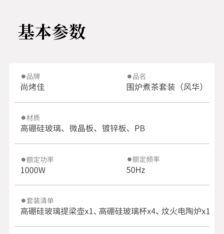 ·材质高硼硅玻璃、微晶板、镀锌板、PB 额定功率 1000W ●额定频率 50Hz ●套装清单 高硼硅玻璃提梁壶x1、高硼硅玻璃杯x4、炆火电陶炉x1