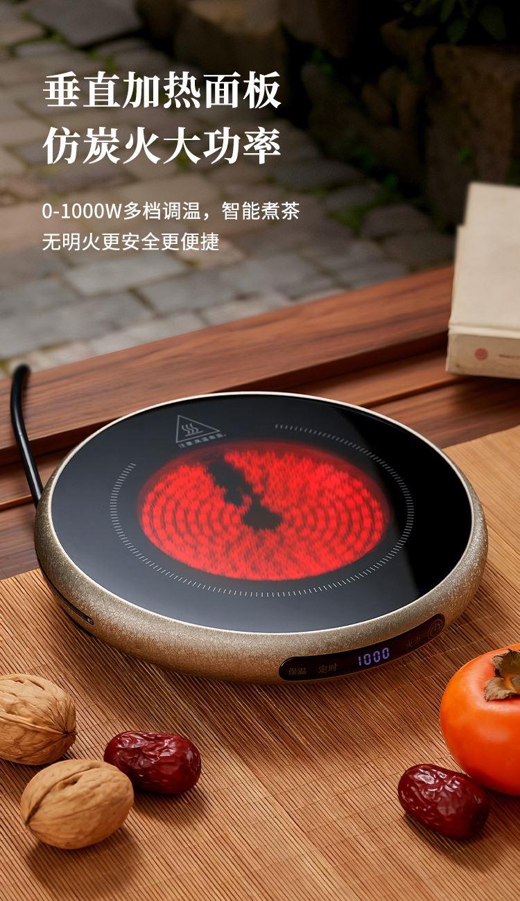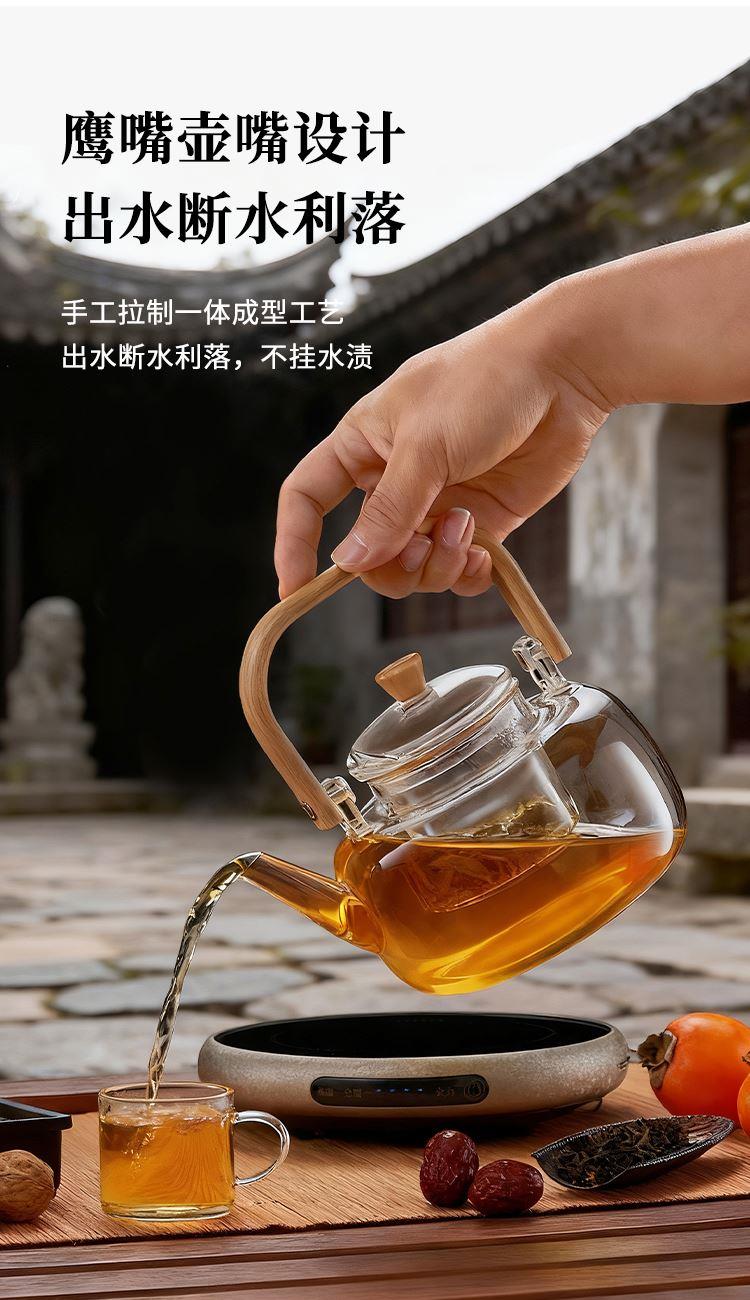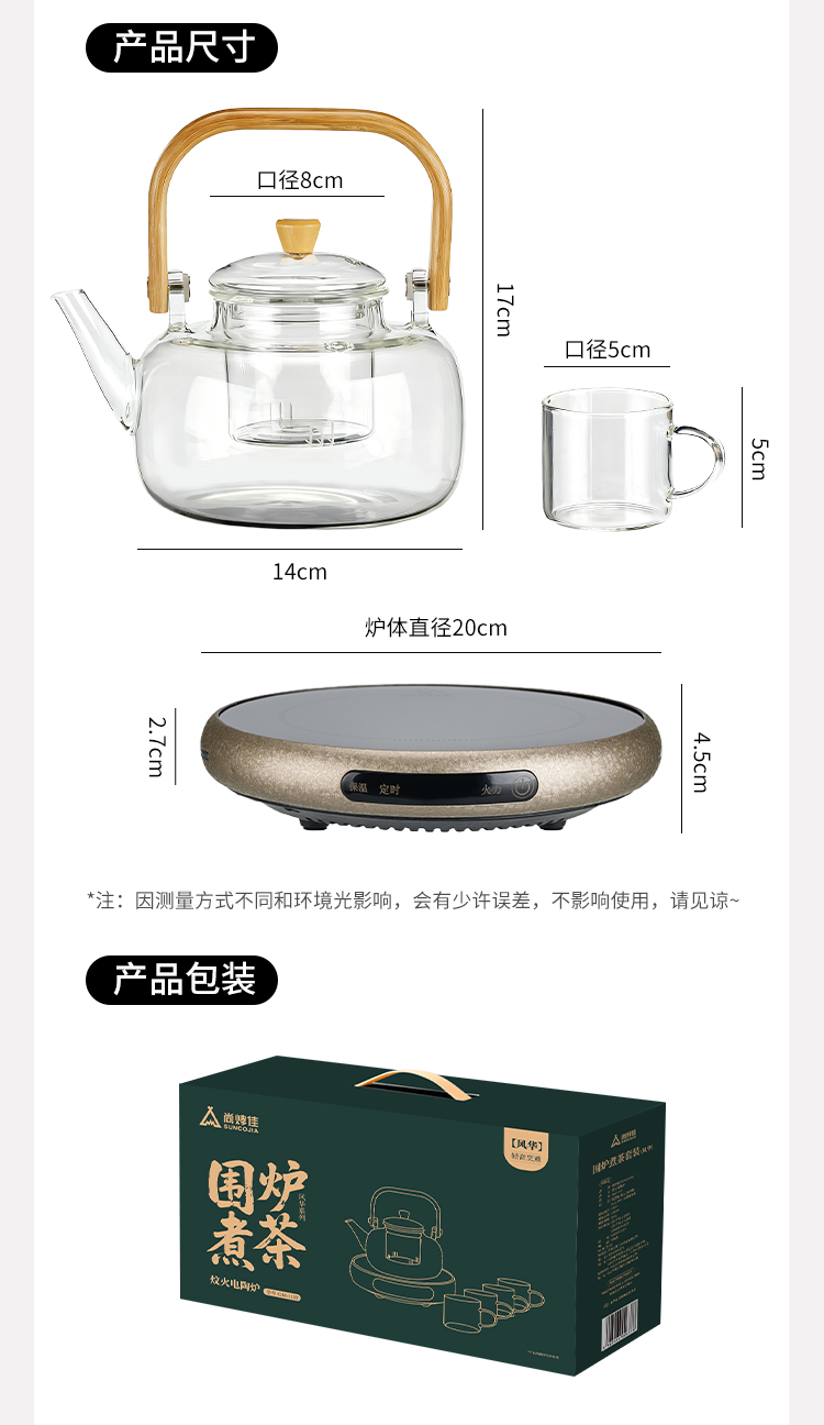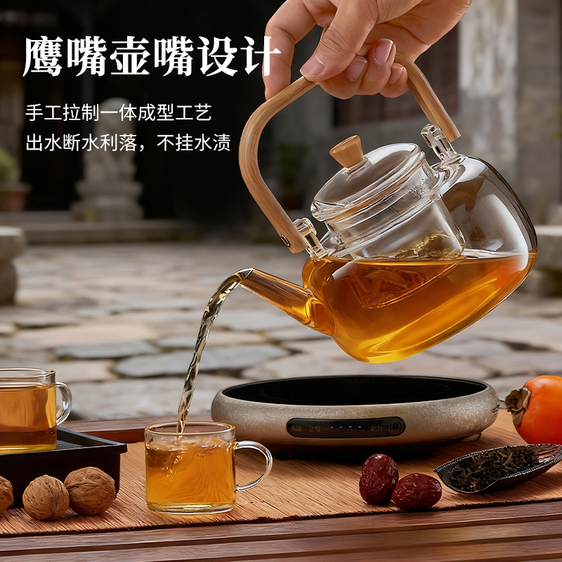 ·材质高硼硅玻璃、微晶板、镀锌板、PB 额定功率 1000W ●额定频率 50Hz ●套装清单 高硼硅玻璃提梁壶x1、高硼硅玻璃杯x4、炆火电陶炉x1