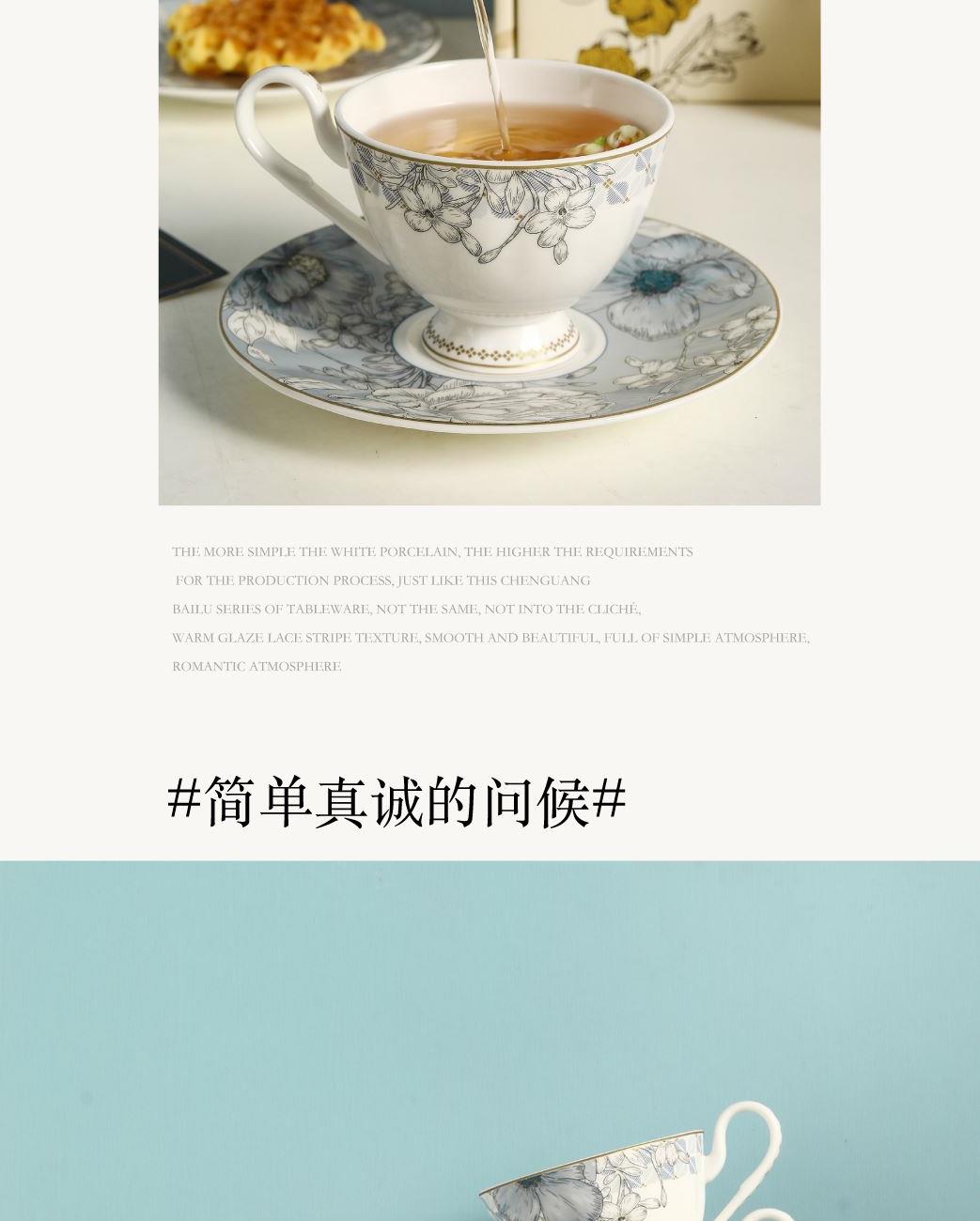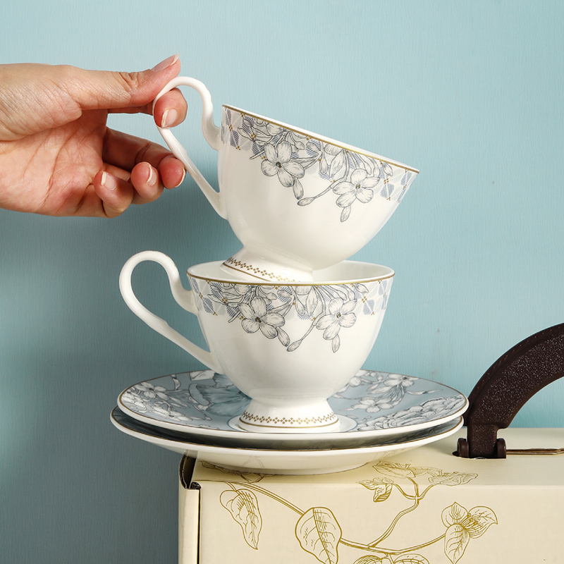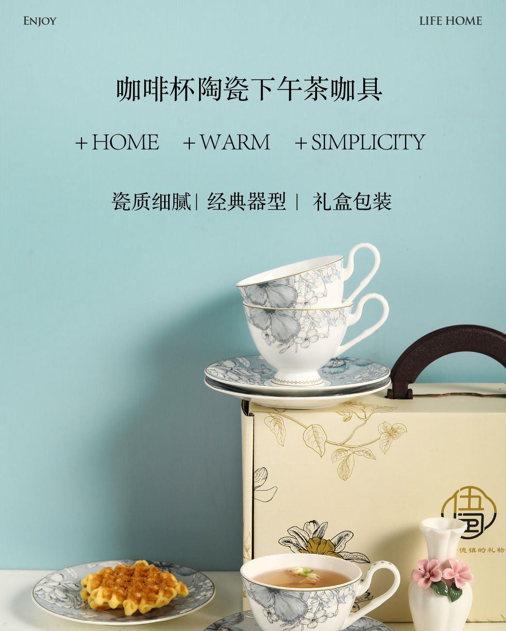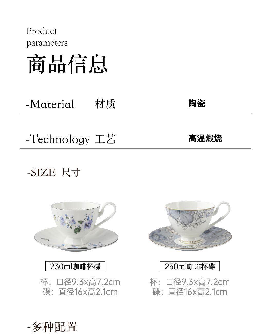 产品组成:茶咖杯4、碟子4、花瓶1、勺子4 产品材质:高骨瓷 产品工艺:贴花+描金 包装尺寸:42*12*25cm 外箱尺寸:43*37*27.5cm