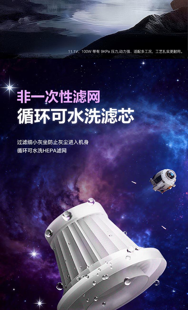 非一次性滤网循环可水洗滤芯,过滤细小灰坐防止灰尘进入机身循环可水洗HEPA滤网。