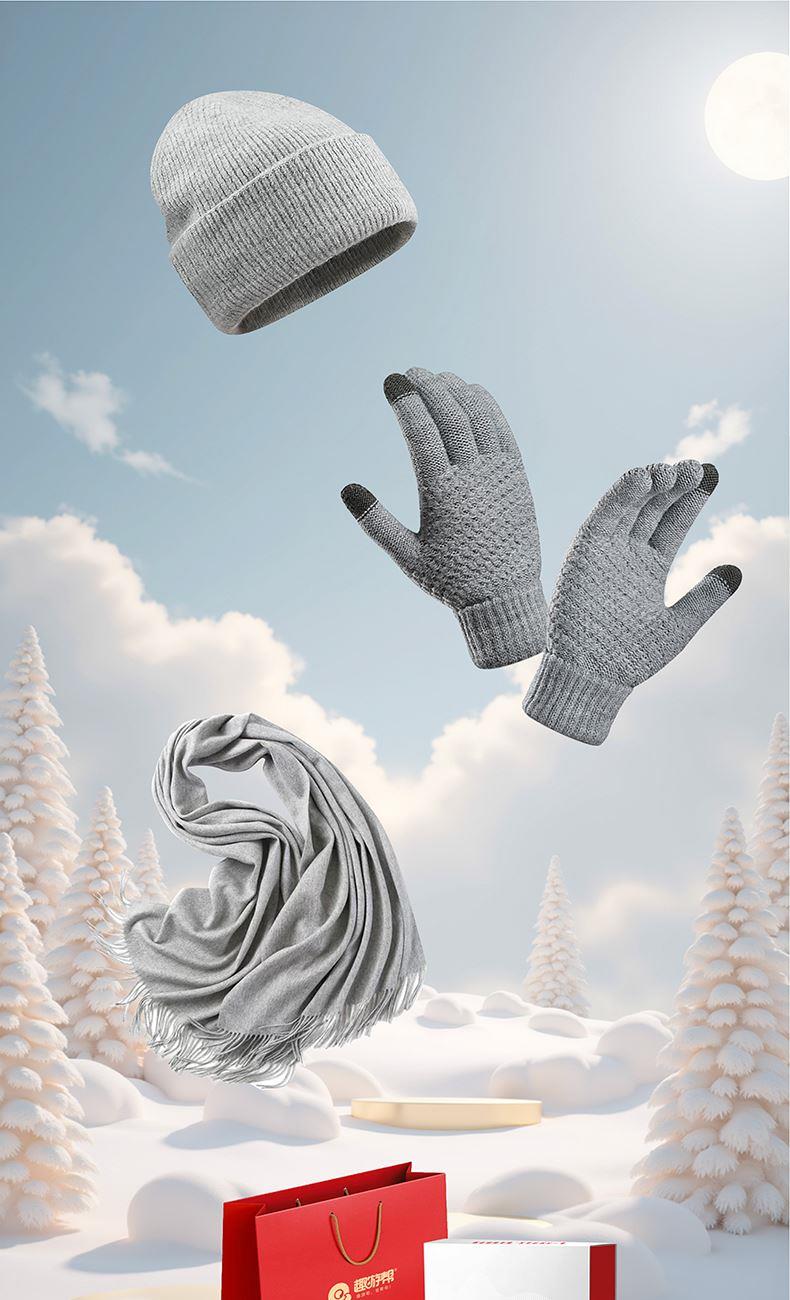 材质 帽子:腈纶 围巾:聚脂纤维 手套:95%腈纶+5%氨纶 颜色 麻灰、浅灰色、灰 尺寸 手套:21*8cm 围巾:约70*195 cm 帽子:长28cm、宽20cm、头围54-60cm(可松紧) 产品组合 针织帽+围巾+手套 暖冬保暖套装 温暖过冬 柔软针织、细腻手感 防风保暖、保暖舒适、保暖温度 户外出游、出行不怕寒冷