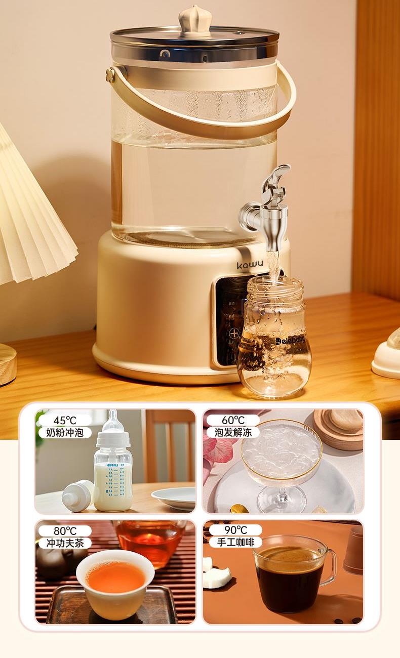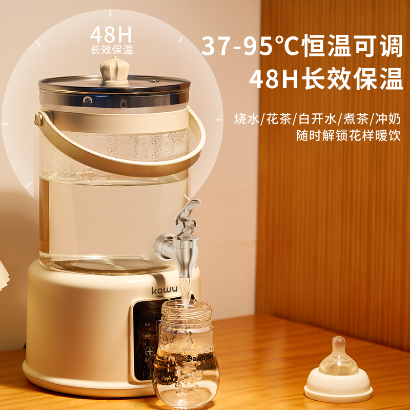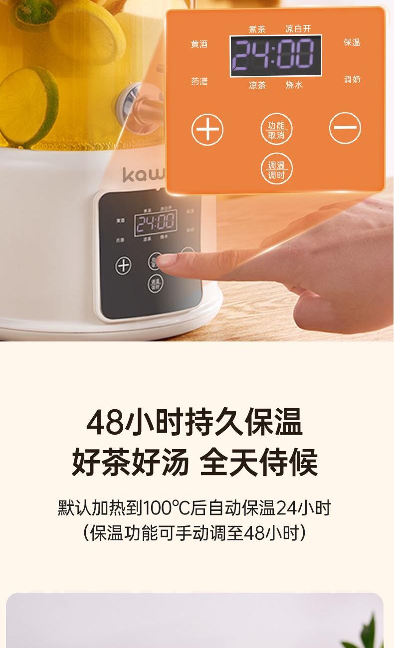额定功率:1000W 额定电源:220V~50Hz 产品尺寸:250*370mm 包装尺寸:427x256x262mm 产品容量:3.5L 单台净重:1.64KG 单台毛重:2.2KG 1、水箱分体式设计拿取方便轻松换水 2、1000W大功率快速煮沸不久等 3、8大功能大屏幕触控操作简单方便 4、3.5L大容量多人使用也不怕 5、自带茶漏可蒸汽煮茶享受茶气芬芳 6、37-95度多段控温满足不同温度需求 7、300S提壶记忆 自动记忆提壶前水温 放回无需重设