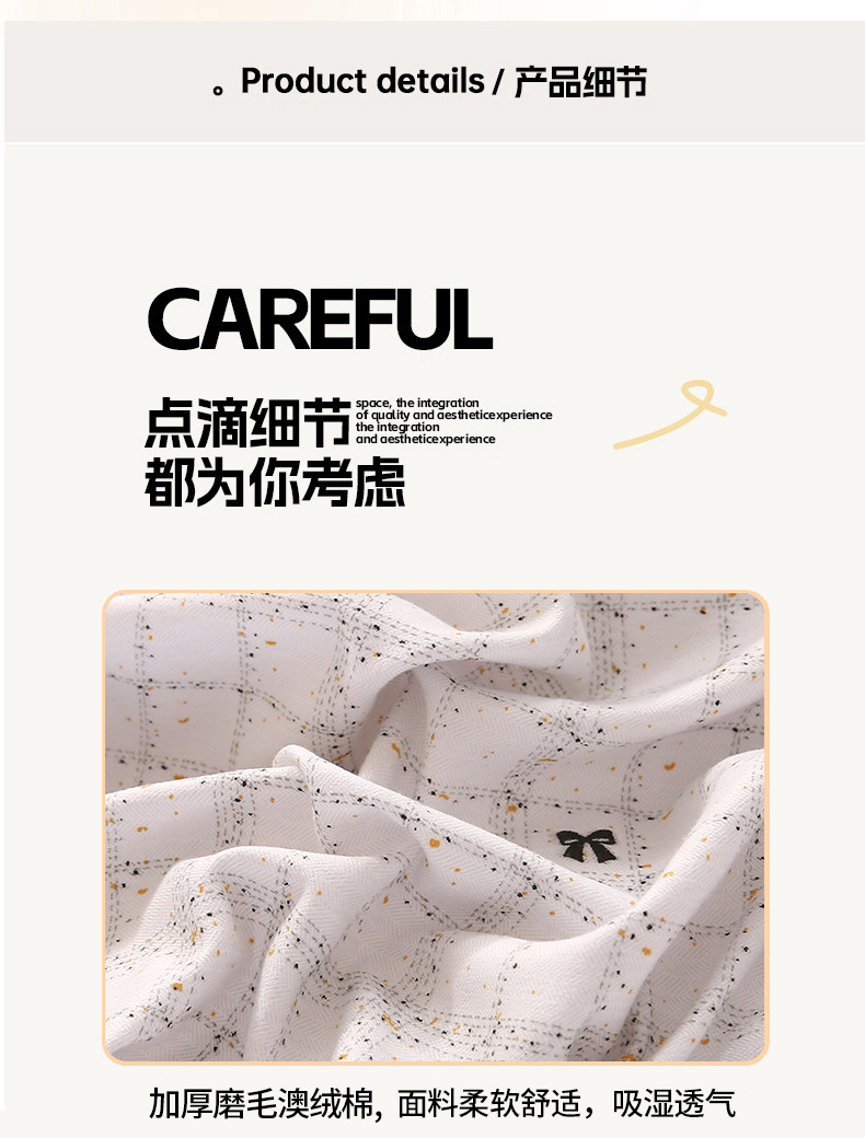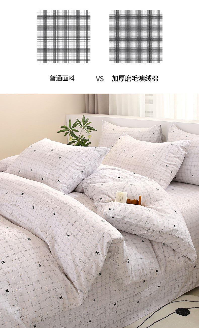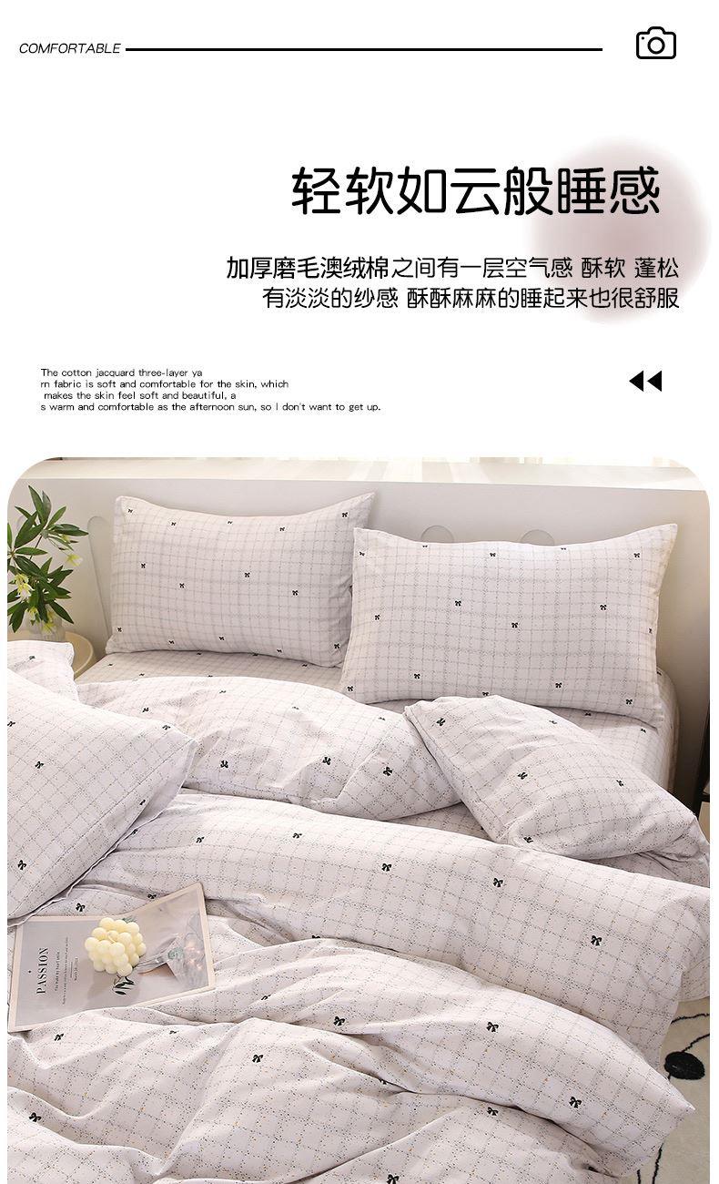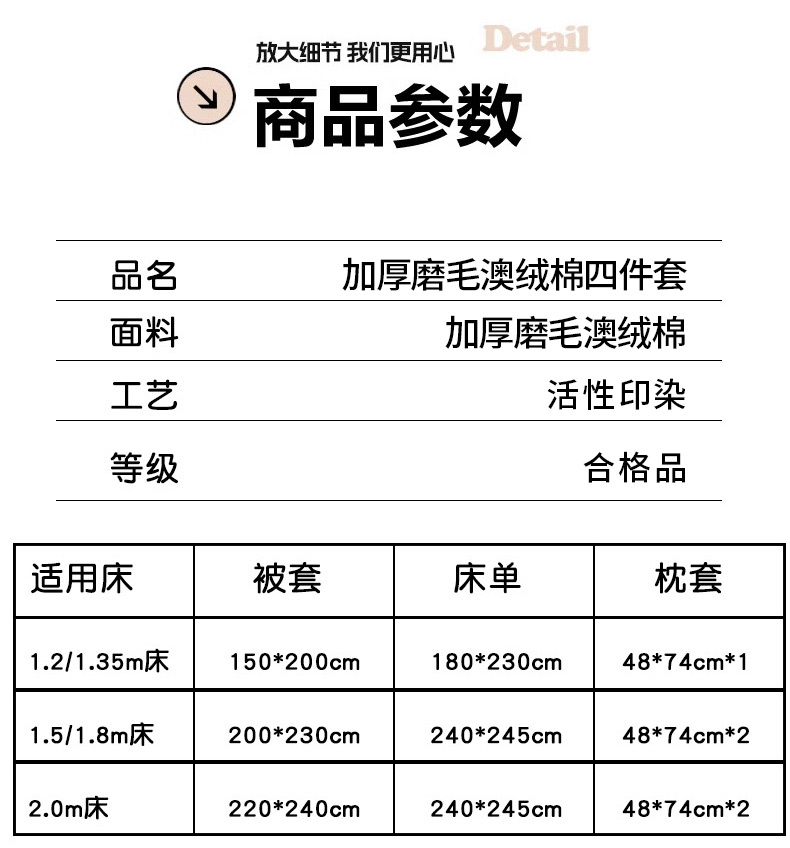 1:加厚磨毛澳绒棉贴身用柔软舒适 让肌肤心动的软糯手感 似午后的阳光般温暖 舒服到不想起床 2:加厚磨毛澳绒棉之间有一层空气感 酥软 蓬松有淡淡的纱感 酥酥麻麻的睡起来也很舒服 面料:加厚磨毛澳绒棉 尺寸:被套:200*230cm*1 床单:230*230cm*1 枕套:48*74cm*2 重量:2.5kg 包装:彩盒