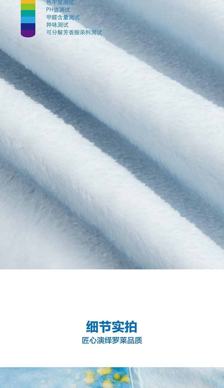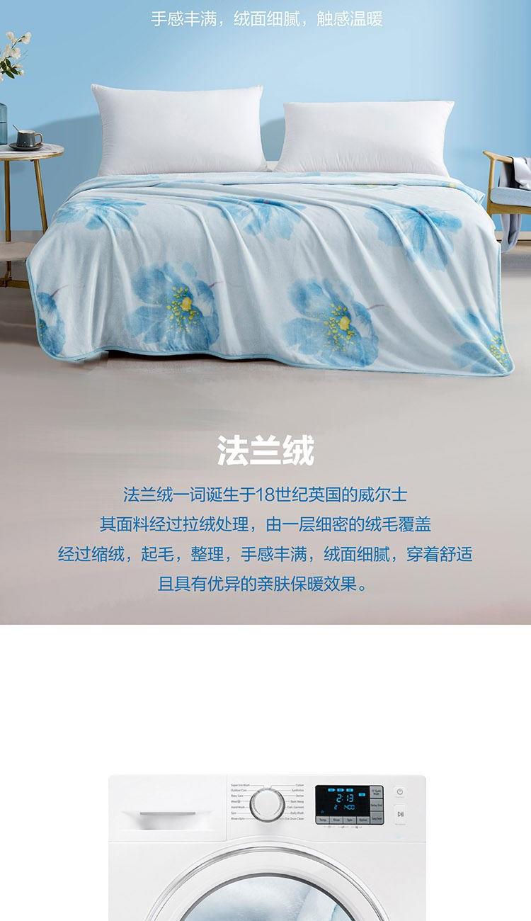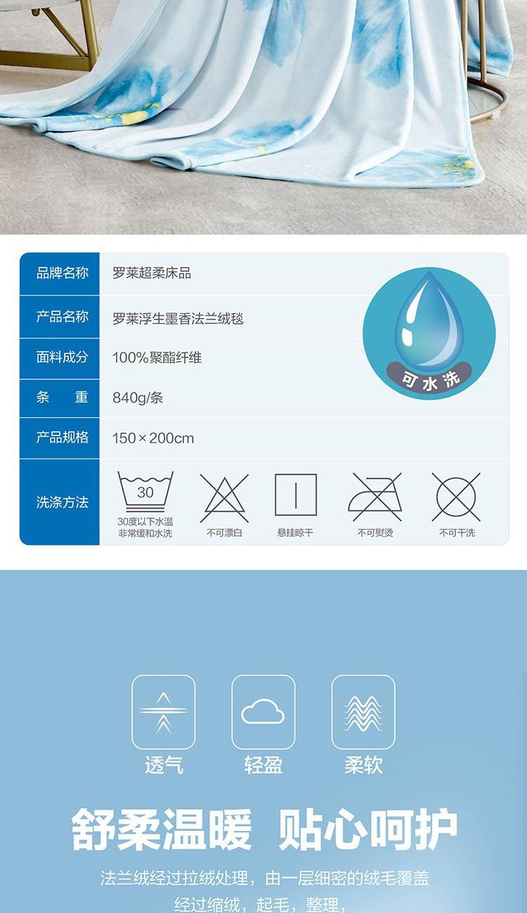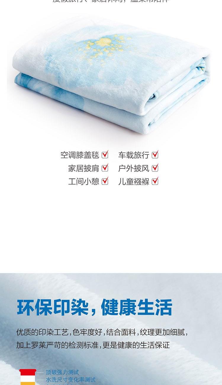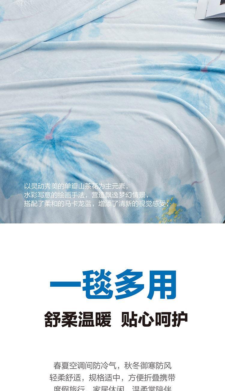 面料材质: 聚酯纤维 规格尺寸:150×200cm×280GSM 产品条重:840g 外箱尺寸: 42×37×76cm(参考) 采用超细纤维,具有良好的排湿透气性,绒毛纤长,手感更柔软细腻,保暖性好,光泽度高; 以灵动秀美的单瓣山茶花为主元素,水彩写意的绘画手法不落俗套,营造出飘逸梦幻的艺术感,同时又搭配了柔和的马卡龙蓝,更增添了清爽的视觉感受; 可作薄被、夏被、空调被、床单、盖毯使用;广泛用于办公室,外出、小憩及居家装饰。