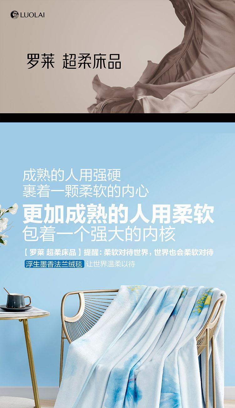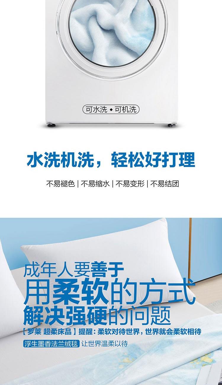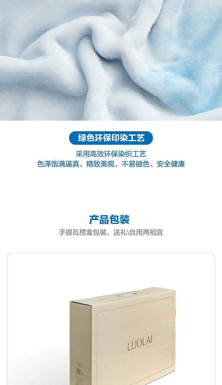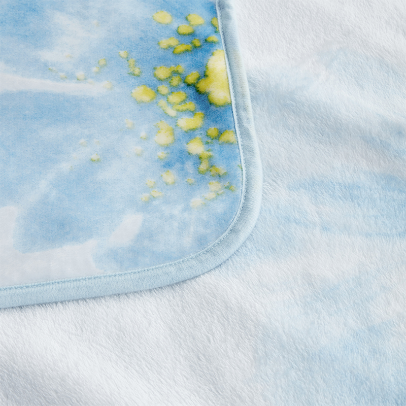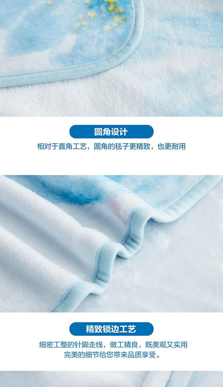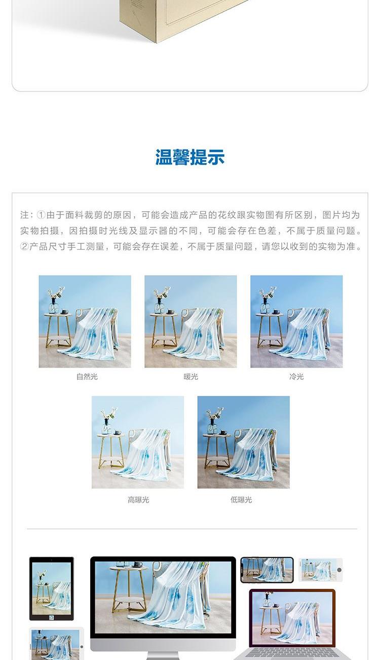 面料材质: 聚酯纤维 规格尺寸:150×200cm×280GSM 产品条重:840g 外箱尺寸: 42×37×76cm(参考) 采用超细纤维,具有良好的排湿透气性,绒毛纤长,手感更柔软细腻,保暖性好,光泽度高; 以灵动秀美的单瓣山茶花为主元素,水彩写意的绘画手法不落俗套,营造出飘逸梦幻的艺术感,同时又搭配了柔和的马卡龙蓝,更增添了清爽的视觉感受; 可作薄被、夏被、空调被、床单、盖毯使用;广泛用于办公室,外出、小憩及居家装饰。