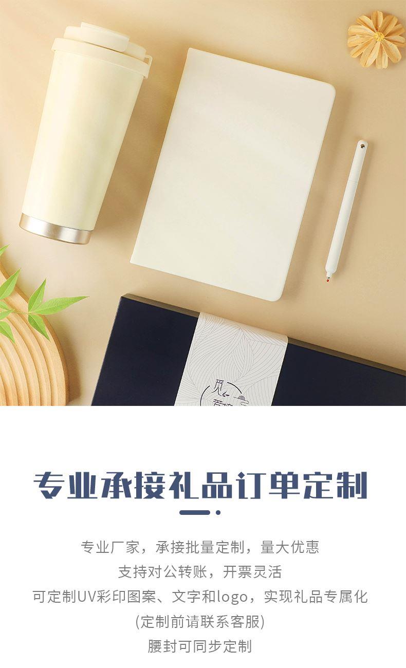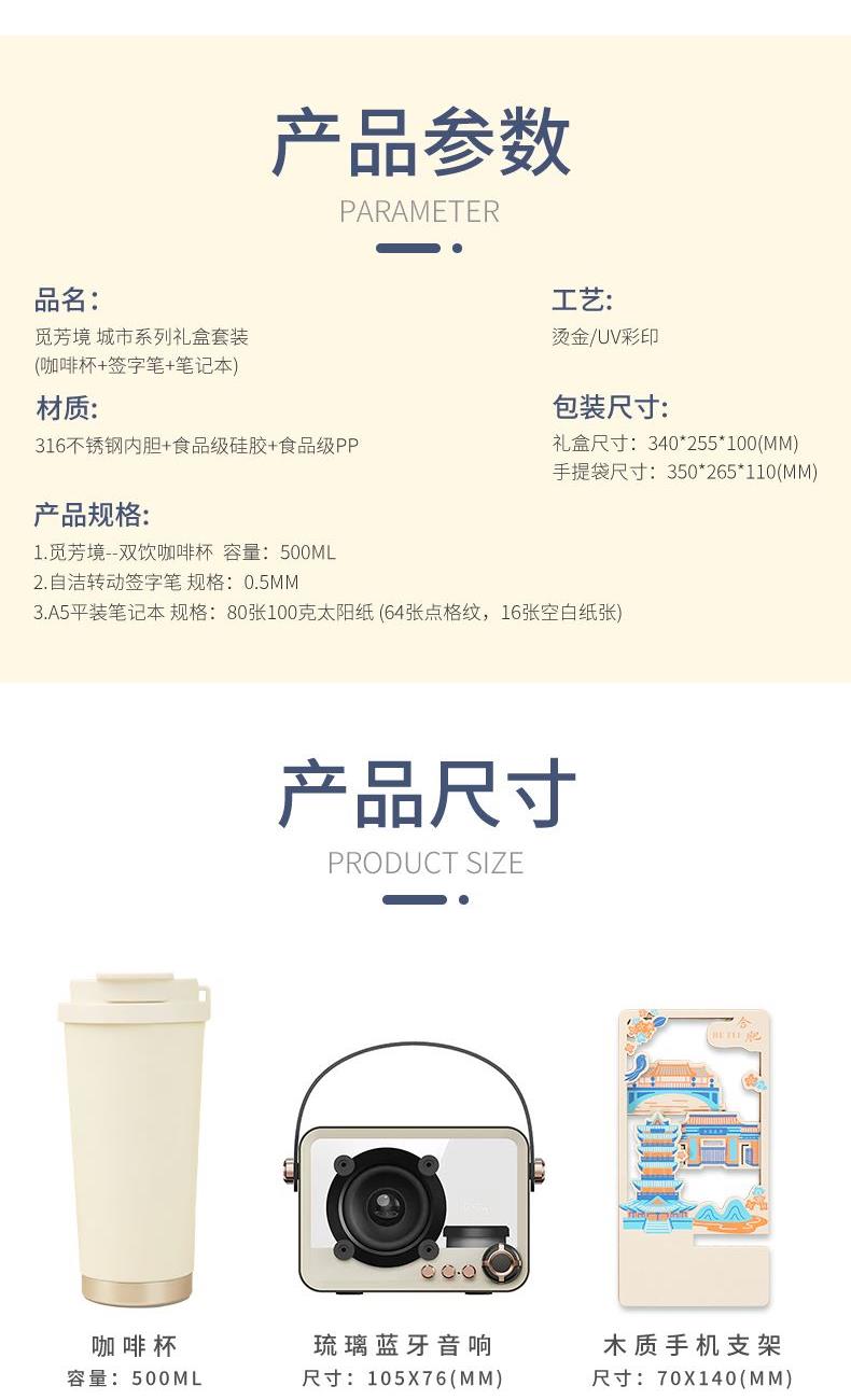 1.觅芳境--双饮咖啡杯 容量:500ml 内胆:316 外壳:304 杯盖:食品级PP 吸管:食品级硅胶 吸嘴:食品级PP 密封圈:食品级硅胶 2.自洁转动签字笔 规格:0.5mm 3.A5平装笔记本 规格:80张100克太阳纸 (64张点格纹,16张空白纸张) 礼盒尺寸:340*255*100(MM) 手提袋尺寸:350*265*110(MM)