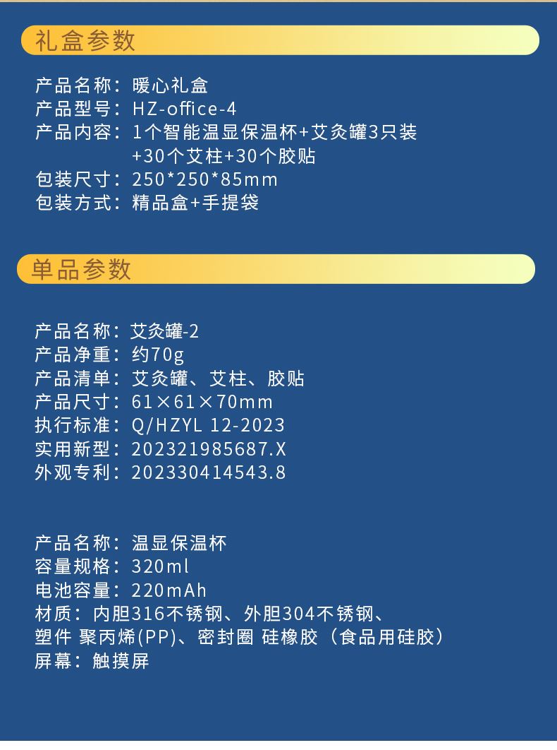 产品内容: 1个智能温显保温杯+艾灸罐3只装 +30个艾柱+30个胶贴 包装方式:精品盒+手提袋 艾灸罐 HZ-AJG-1 产品材质:ABS+金属 配置:艾灸罐三支装+30个艾柱+30个胶贴 卖点:这是一款组合式暖心套装 由3个艾灸罐+1个水杯组成