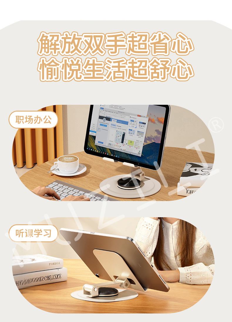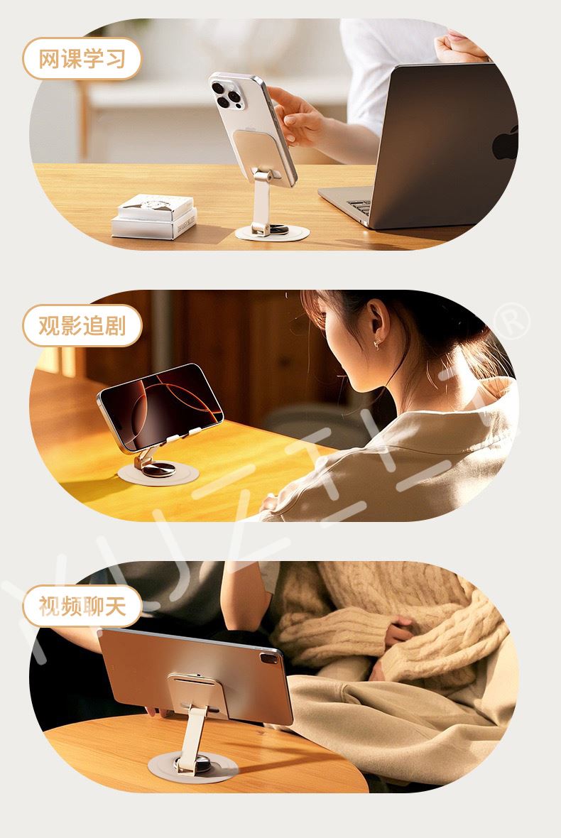 全金属材料支架,增加防滑脚垫 360°可旋转底座,180°双转轴 支撑力强劲,手机/平板通用 预留充电位,边用边充