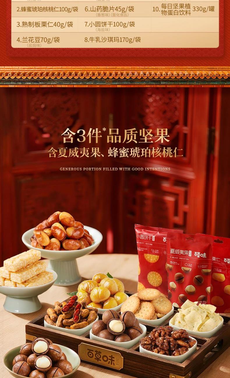 【百草味】夏威夷果(奶油味)60g 【百草味】蜂蜜琥珀核桃仁 100g 【百草味】熟制板栗仁40g 【百草味】兰花豆(盐焗味) 70g 【百草味】爆汁卤花生228g 【百草味】山药脆片(香葱味) 45g 【百草味】小圆饼干(海盐味)100g 【百草味】牛乳沙琪玛袋装170g 【百草味】每日坚果植物蛋白饮料330g*2