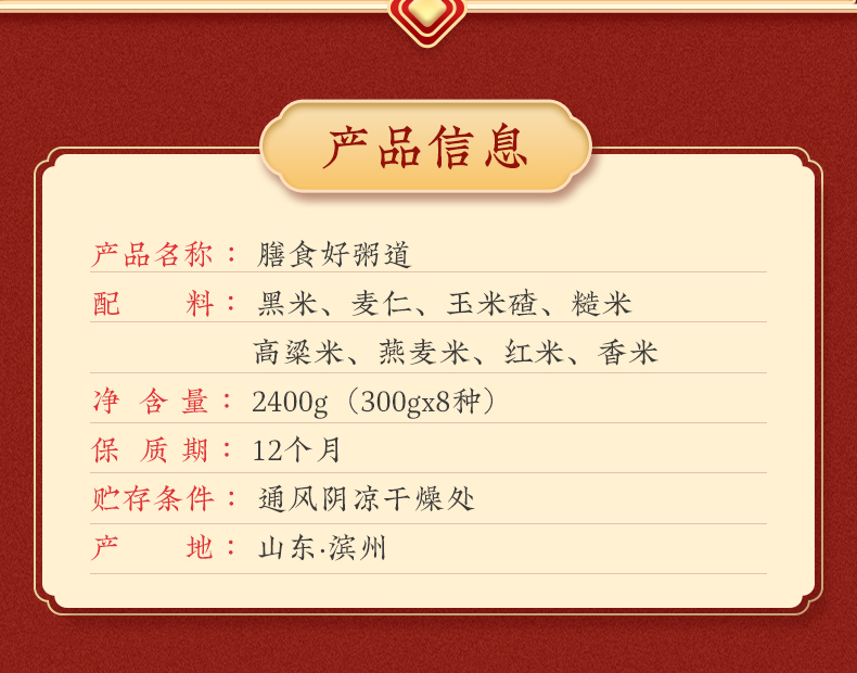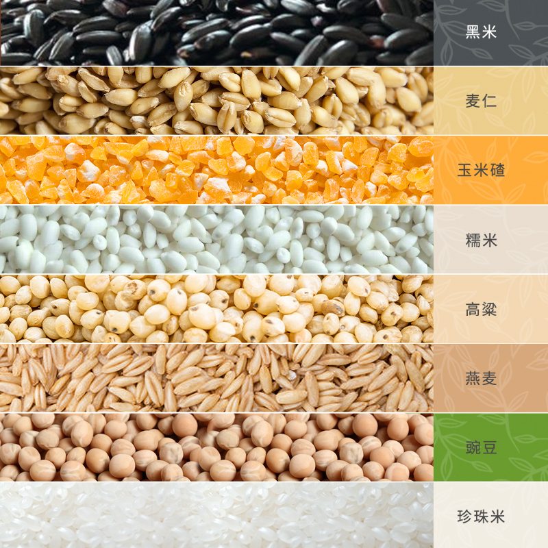条 码:6972761600635 规 格:2.4kg,300g/袋*8 包 装:真空套彩袋 配 置:黑米、麦仁、玉米碴、糙米 高粱米、燕麦米、红米、香米 盒尺寸: 42cm*9.5cm*28.5cm 6盒 箱重量:17.75kg 箱尺寸:59.5*43*30(0.077方)