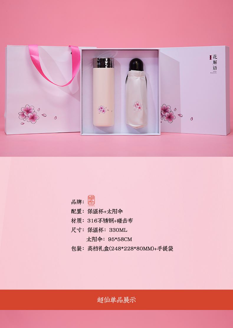配置:保温杯+太阳伞 材质:316不锈钢+碰击布 尺寸:保温杯:330ml 太阳伞:95*58cm 包装:礼盒(248*228*80mm)+手提袋